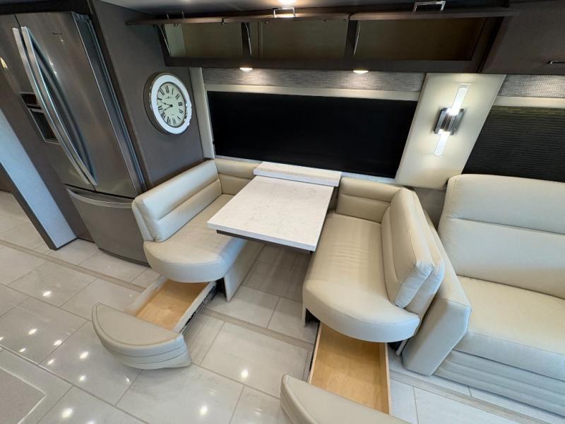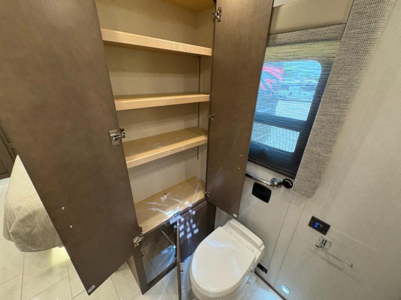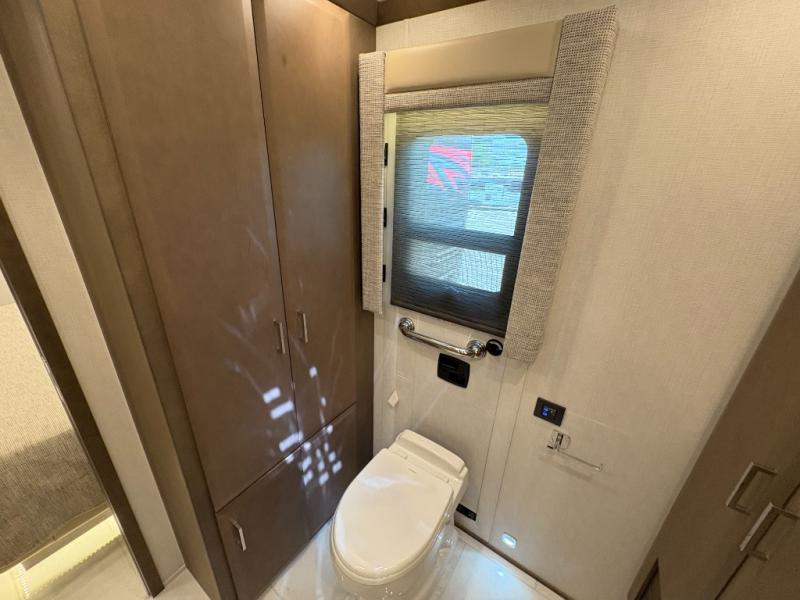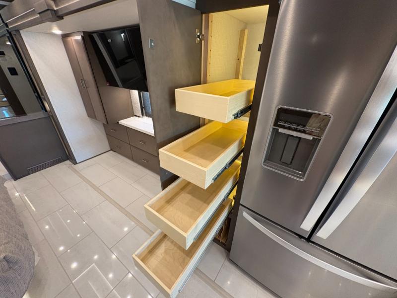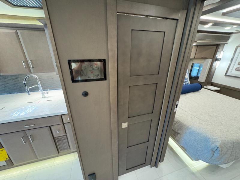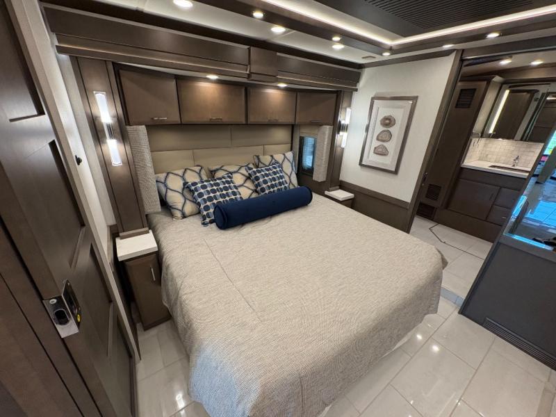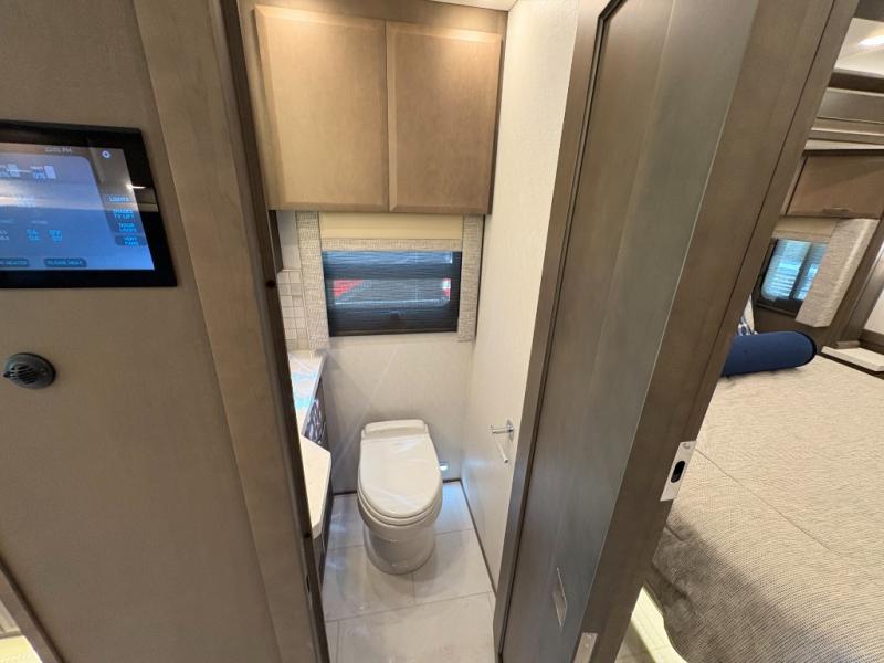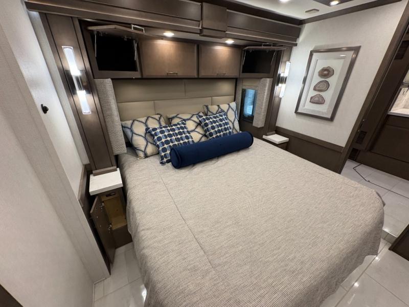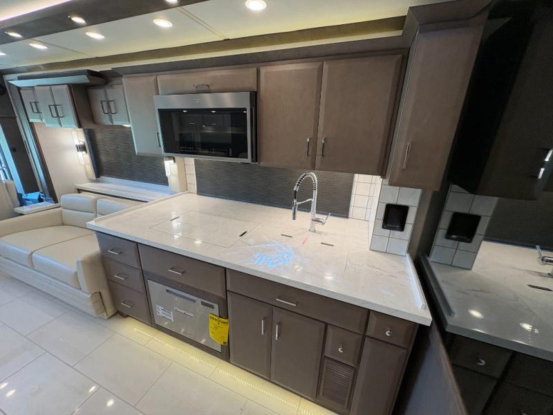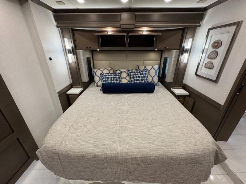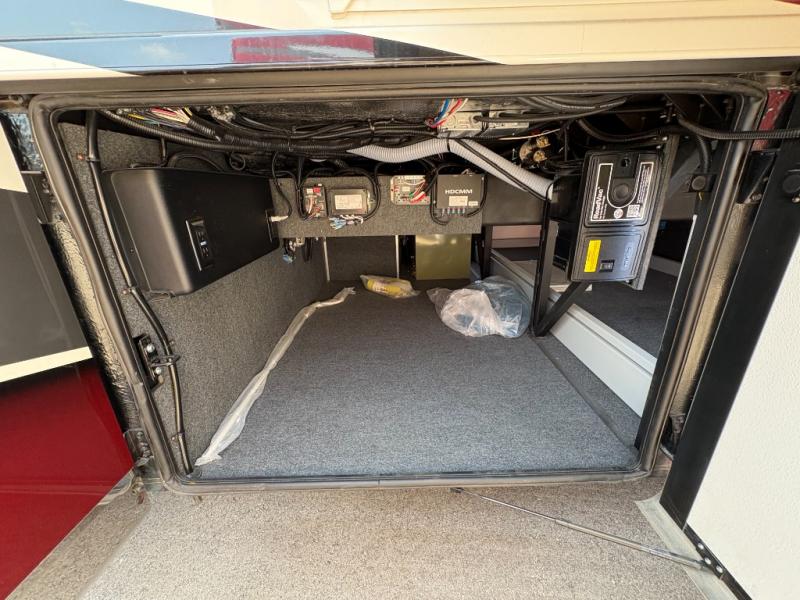 Don't pass up your opportunity to travel in pure luxury with this motorhome! The master suite has a king bed slide for a good night's rest across from a dresser with a Samsung LED TV and shirt wardrobes on either side. Attached to the bedroom is your very own full rear bathroom which has a 40" x 32" shower with a seat next to a linen closet and wardrobe, as well as a Splendide two-piece washer and dryer next to the vanity sink. The chef will have everything they need to prepare delicious home cooked meals including a cabinet pull-out, a stainless steel 30" convection microwave with air fryer feature and a Whirlpool 19.7 cu. ft. refrigerator to keep the perishables fresh, plus the half bathroom is by the kitchen for quick bathroom breaks while cooking. Enjoy your meals at the hide-a-leaf dinette and relax on either the 84" hide-a-bed sofa or the 62" jackknife sofa while watching your favorite movies on the Samsung LED TV on power lift!