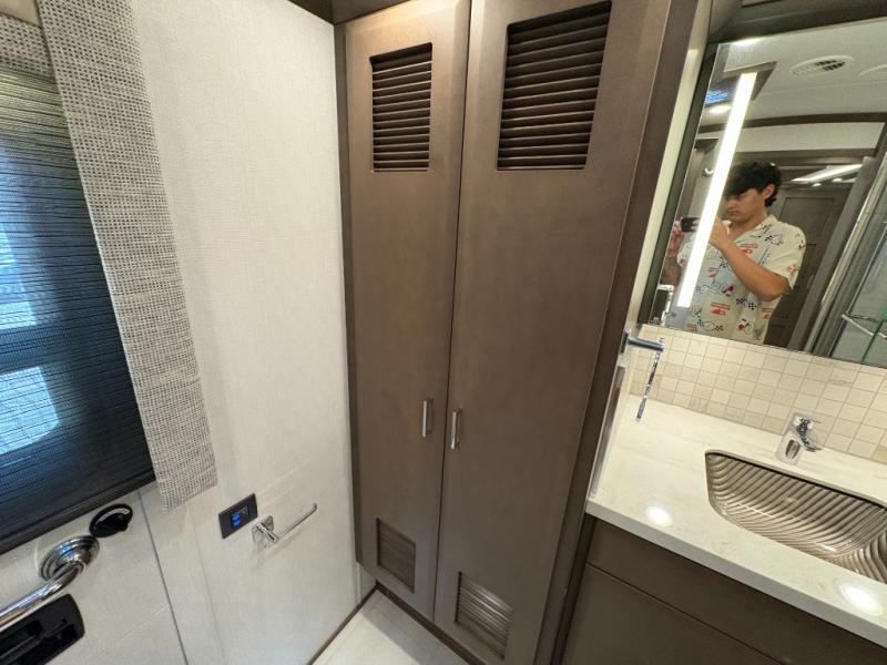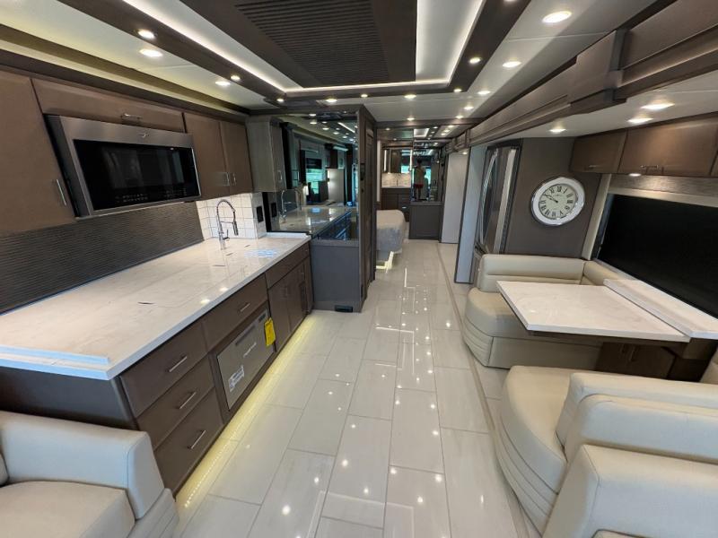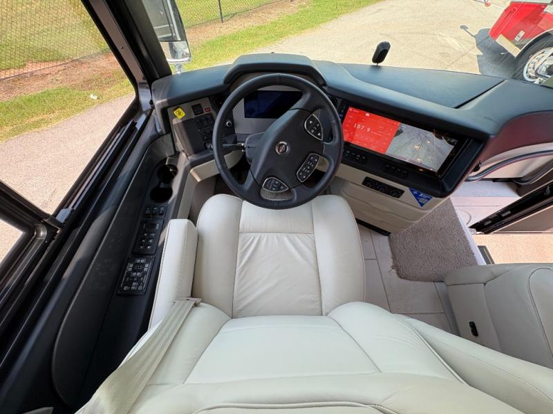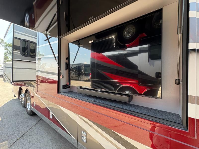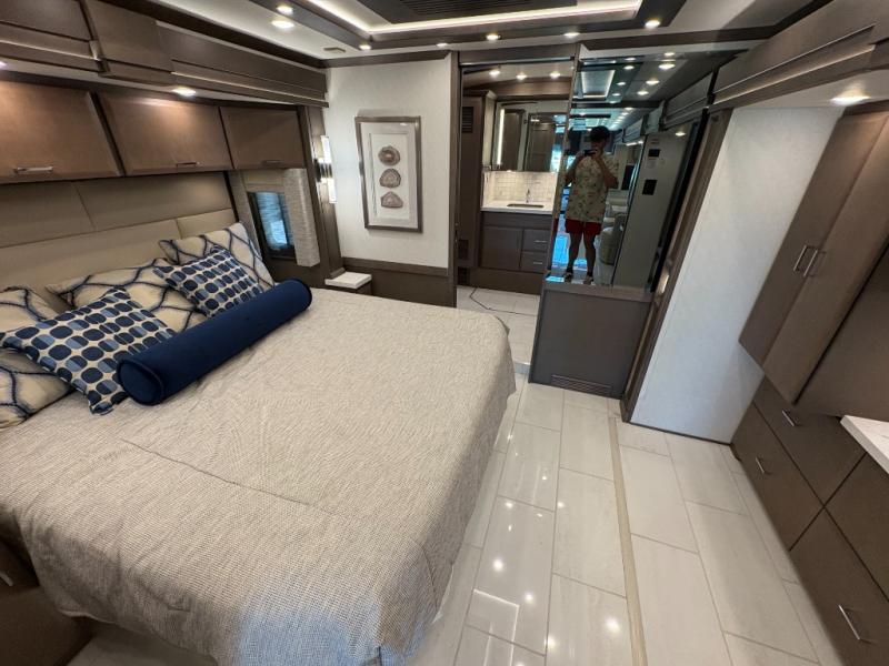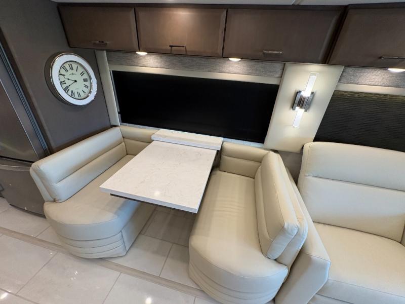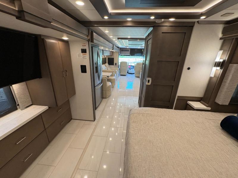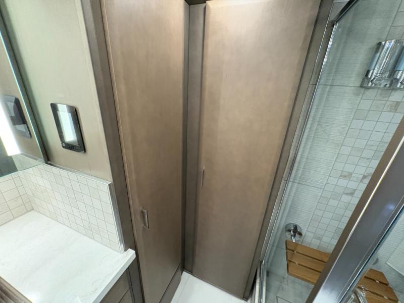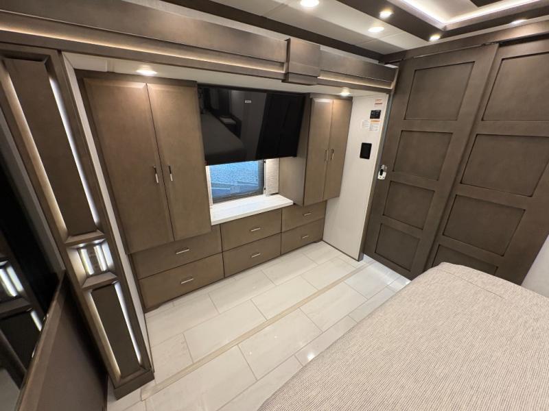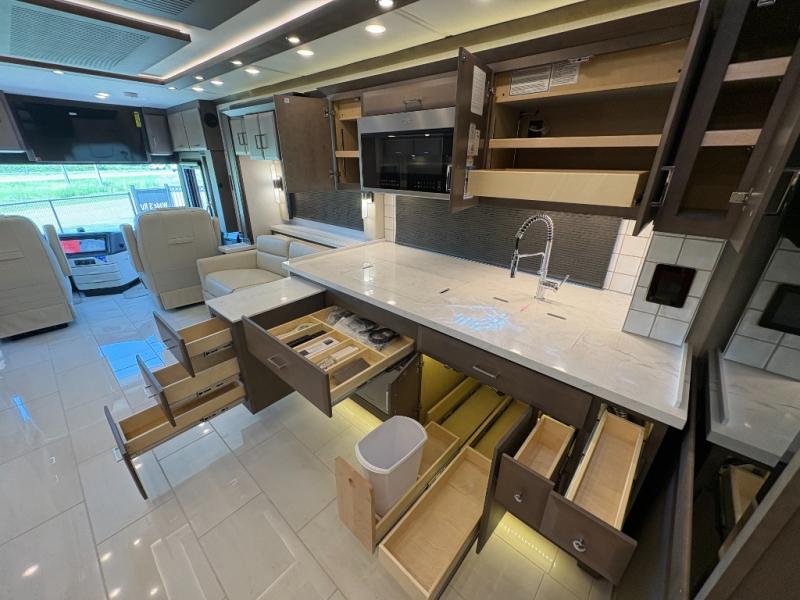 Don't pass up your opportunity to travel in pure luxury with this motorhome! The master suite has a king bed slide for a good night's rest across from a dresser with a Samsung LED TV and shirt wardrobes on either side. Attached to the bedroom is your very own full rear bathroom which has a 40" x 32" shower with a seat next to a linen closet and wardrobe, as well as a Splendide two-piece washer and dryer next to the vanity sink. The chef will have everything they need to prepare delicious home cooked meals including a cabinet pull-out, a stainless steel 30" convection microwave with air fryer feature and a Whirlpool 19.7 cu. ft. refrigerator to keep the perishables fresh, plus the half bathroom is by the kitchen for quick bathroom breaks while cooking. Enjoy your meals at the hide-a-leaf dinette and relax on either the 84" hide-a-bed sofa or the 62" jackknife sofa while watching your favorite movies on the Samsung LED TV on power lift!