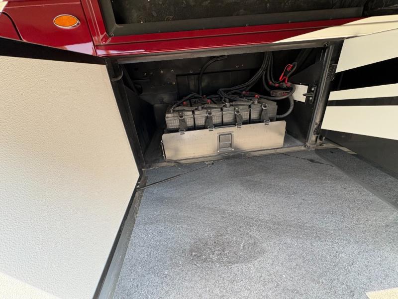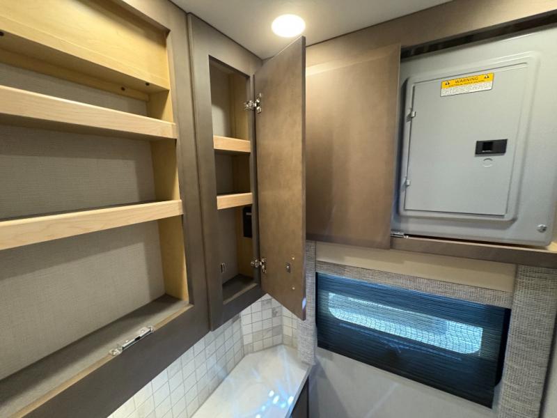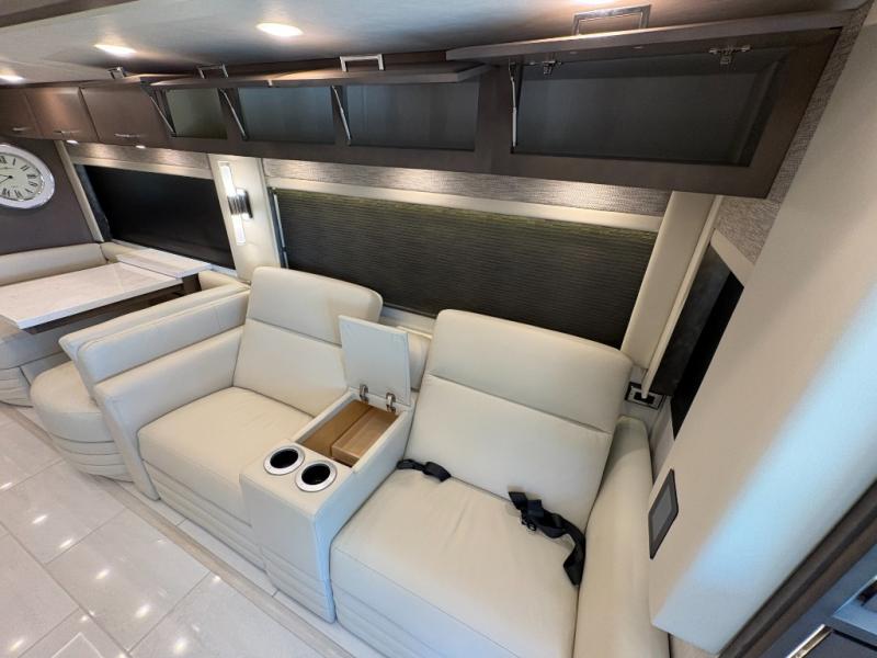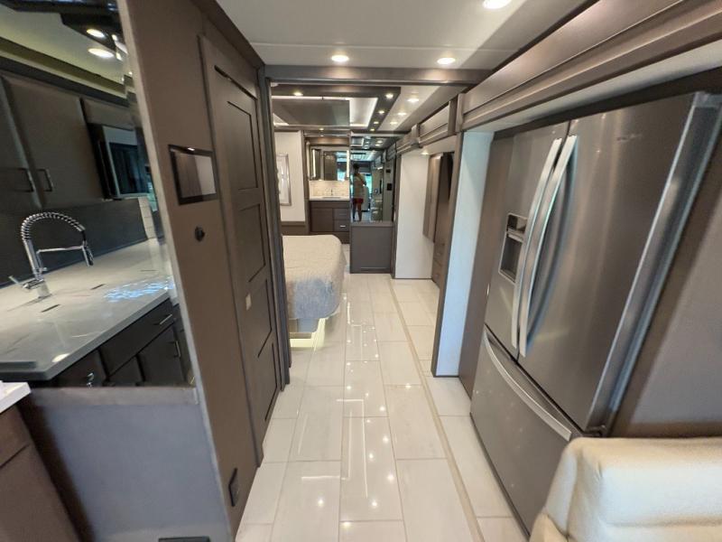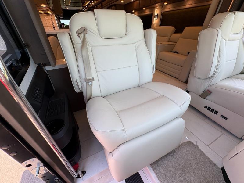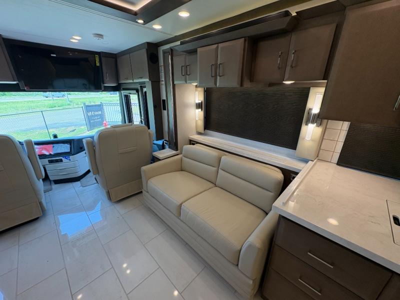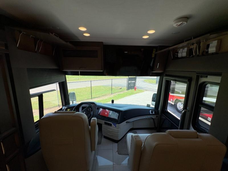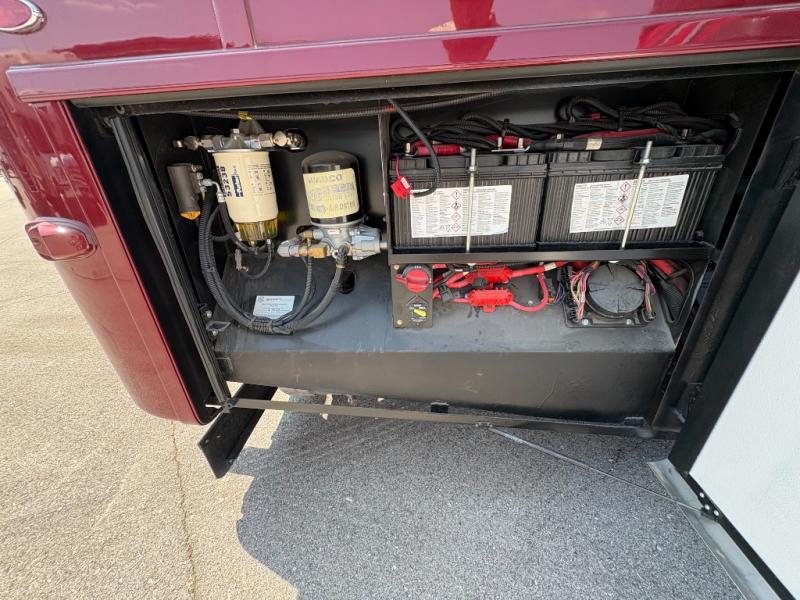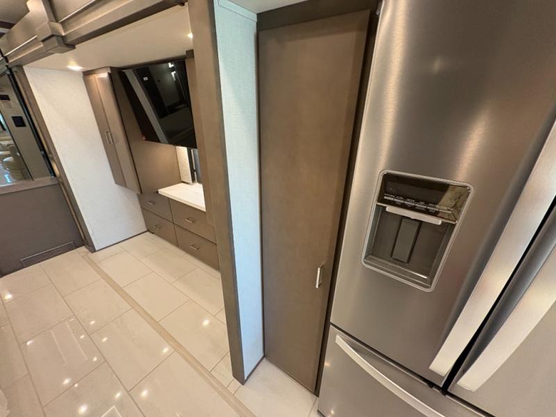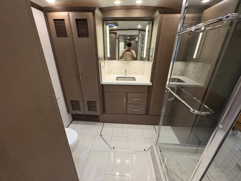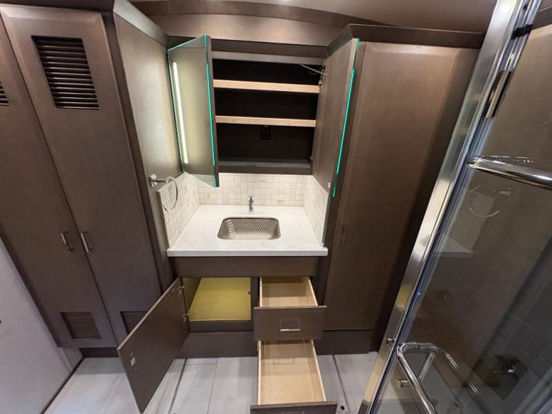 Don't pass up your opportunity to travel in pure luxury with this motorhome! The master suite has a king bed slide for a good night's rest across from a dresser with a Samsung LED TV and shirt wardrobes on either side. Attached to the bedroom is your very own full rear bathroom which has a 40" x 32" shower with a seat next to a linen closet and wardrobe, as well as a Splendide two-piece washer and dryer next to the vanity sink. The chef will have everything they need to prepare delicious home cooked meals including a cabinet pull-out, a stainless steel 30" convection microwave with air fryer feature and a Whirlpool 19.7 cu. ft. refrigerator to keep the perishables fresh, plus the half bathroom is by the kitchen for quick bathroom breaks while cooking. Enjoy your meals at the hide-a-leaf dinette and relax on either the 84" hide-a-bed sofa or the 62" jackknife sofa while watching your favorite movies on the Samsung LED TV on power lift!