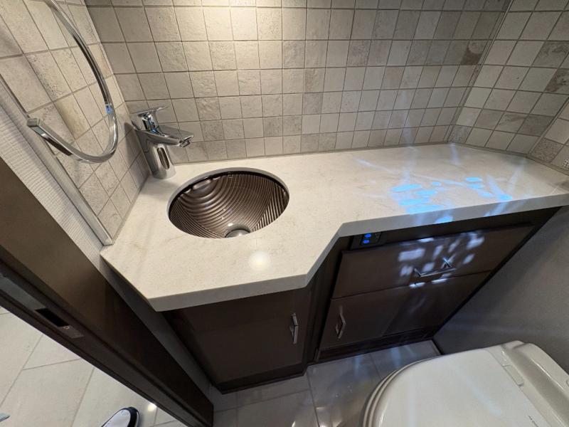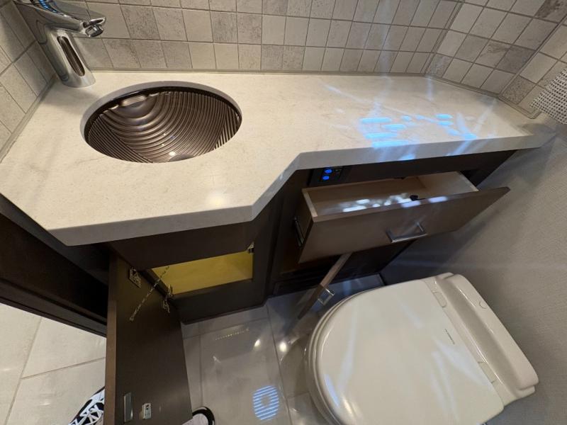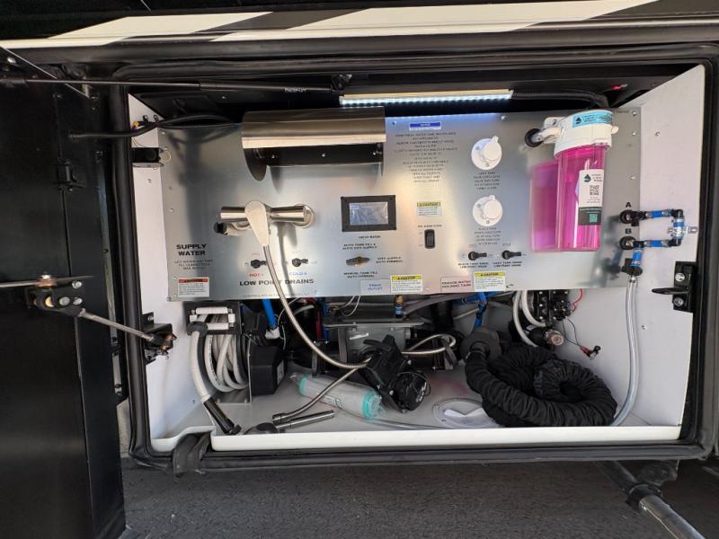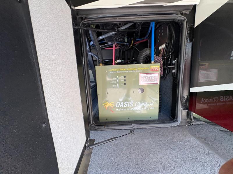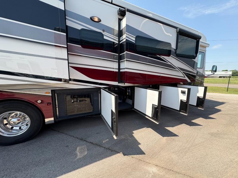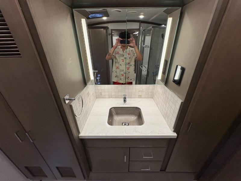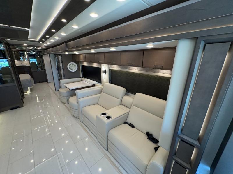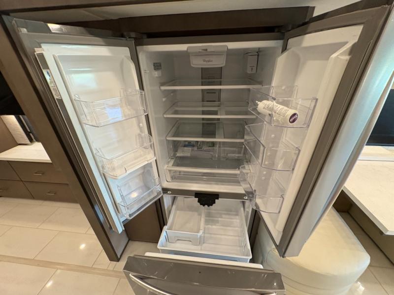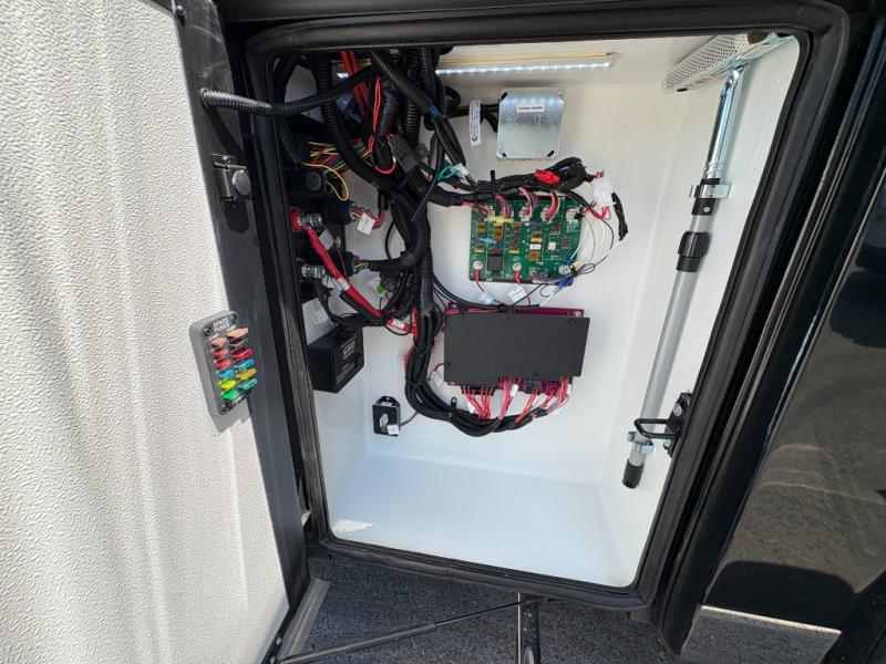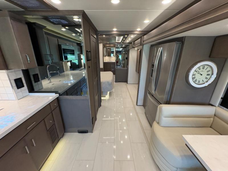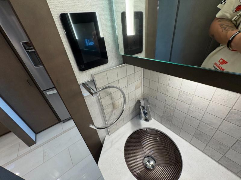 Don't pass up your opportunity to travel in pure luxury with this motorhome! The master suite has a king bed slide for a good night's rest across from a dresser with a Samsung LED TV and shirt wardrobes on either side. Attached to the bedroom is your very own full rear bathroom which has a 40" x 32" shower with a seat next to a linen closet and wardrobe, as well as a Splendide two-piece washer and dryer next to the vanity sink. The chef will have everything they need to prepare delicious home cooked meals including a cabinet pull-out, a stainless steel 30" convection microwave with air fryer feature and a Whirlpool 19.7 cu. ft. refrigerator to keep the perishables fresh, plus the half bathroom is by the kitchen for quick bathroom breaks while cooking. Enjoy your meals at the hide-a-leaf dinette and relax on either the 84" hide-a-bed sofa or the 62" jackknife sofa while watching your favorite movies on the Samsung LED TV on power lift!