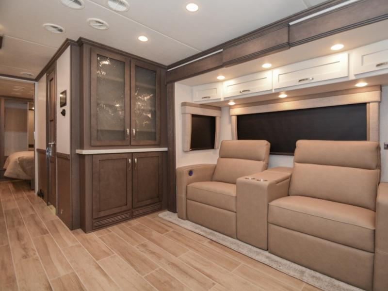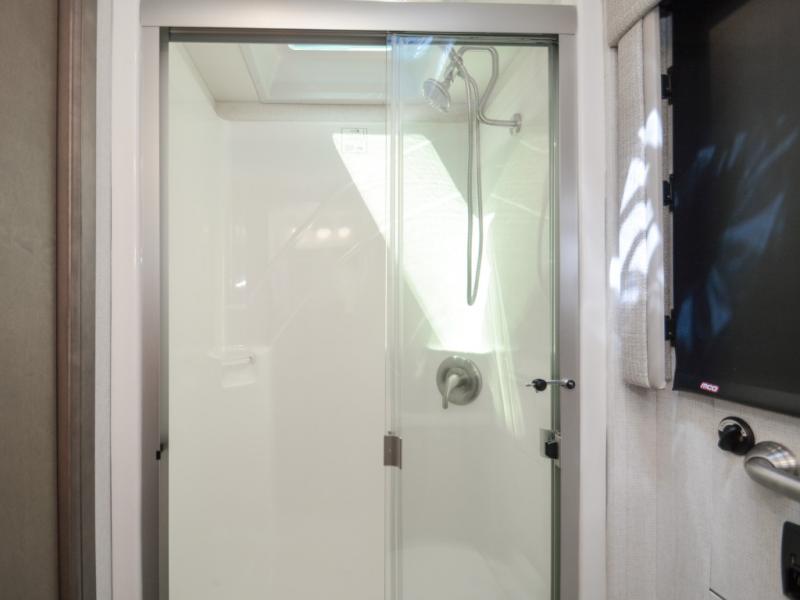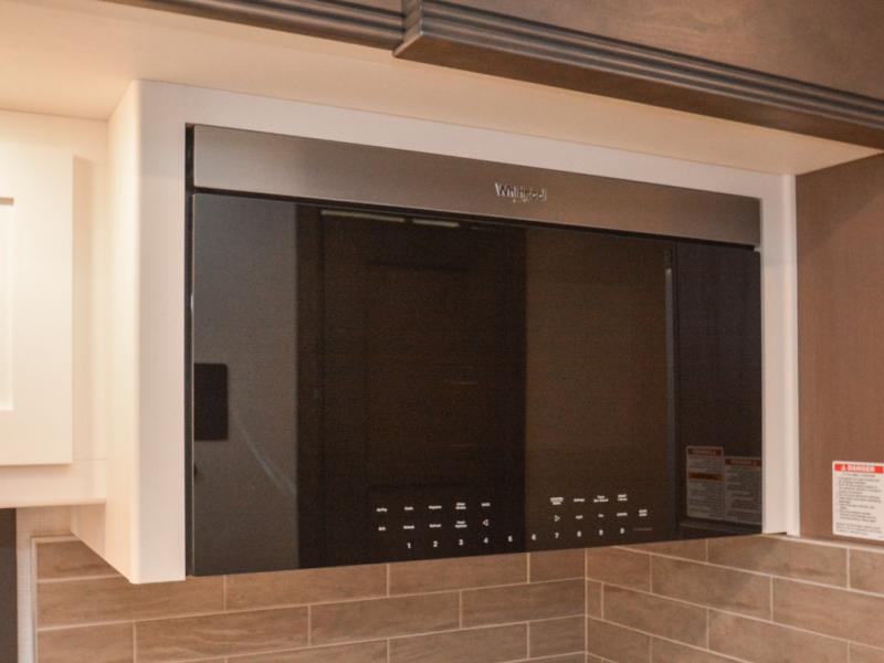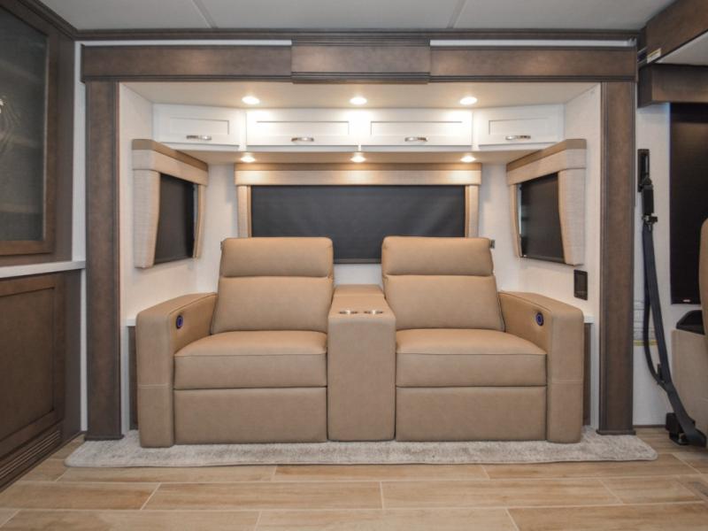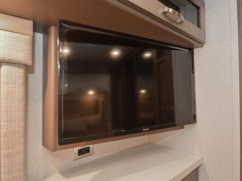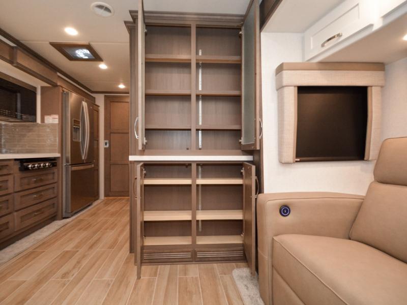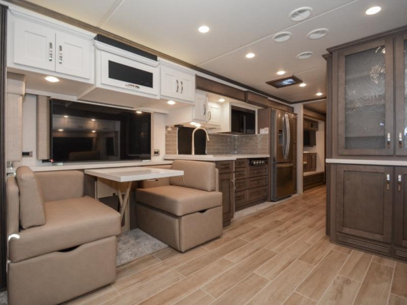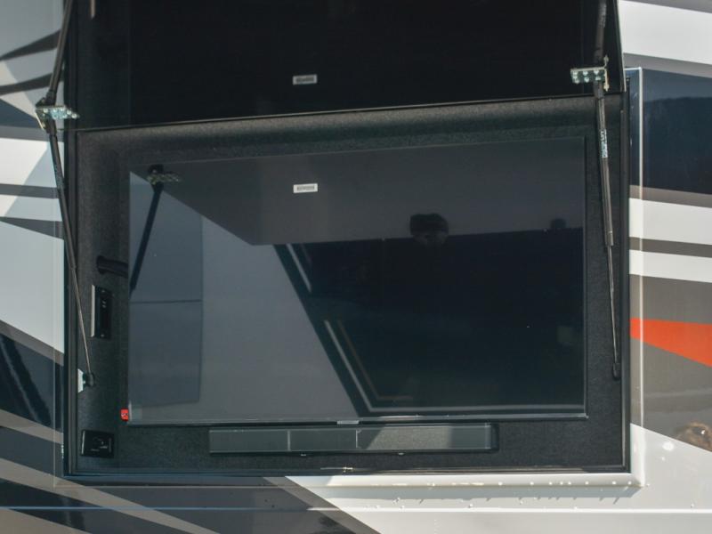 Pack your bags for an extended vacation in this four slide out coach! Once you've parked for the day, you can make lunch in the full kitchen that includes a 30" stainless steel convection microwave with a three burner cooktop and an air fryer feature. There is a 10 cu. ft. Norcold refrigerator and pantry to store your food, plus a booth dinette where you can dine together. A Jackknife sofa provides more seating space, or you may just find yourselves outdoors under the Carefree Travel'r awning. The mid-coach full bath will be easily accessible for everyone to use, and the rear private bedroom provides you with your own space at night. Here, you'll enjoy a queen bed slide out with overhead storage, a dresser with a Samsung LED TV, plus a wardrobe with sliding mirror doors.