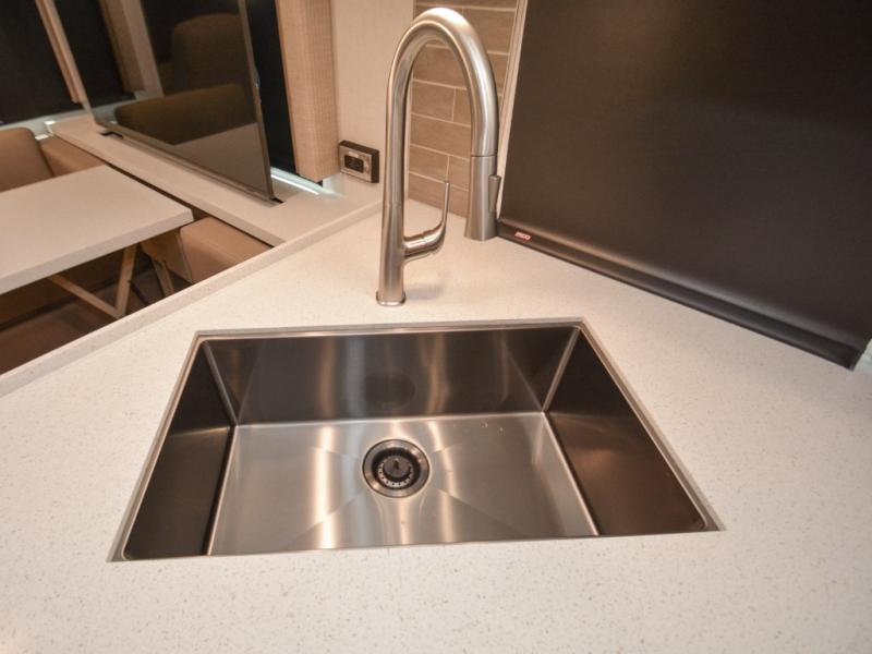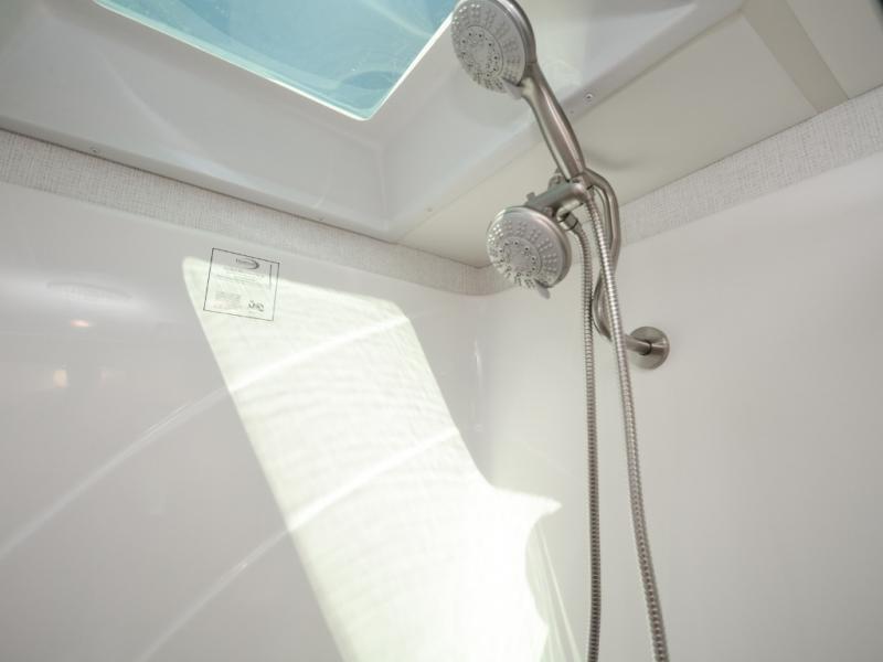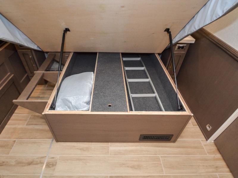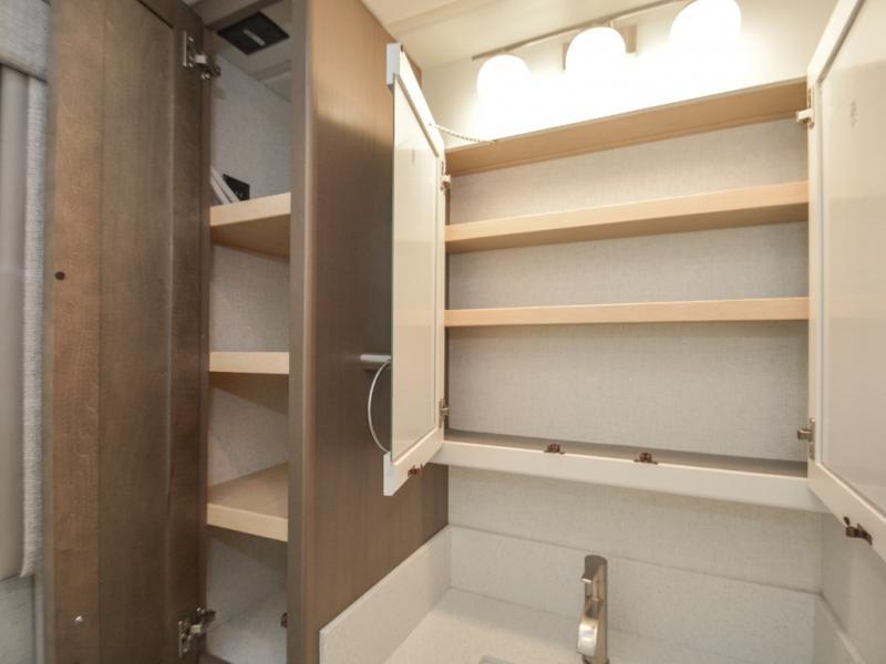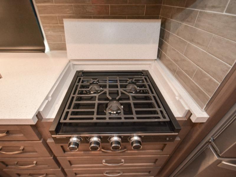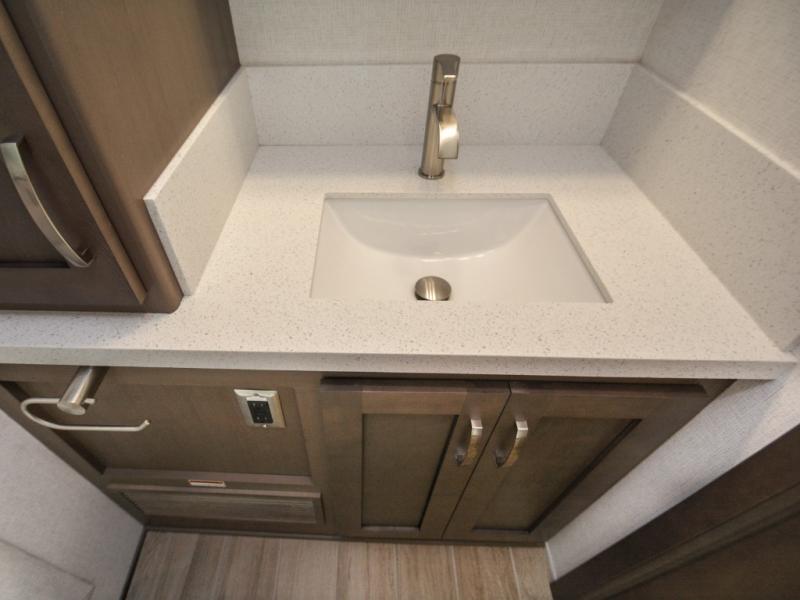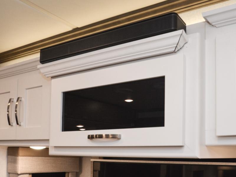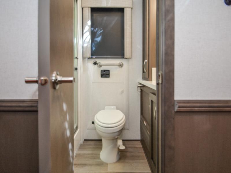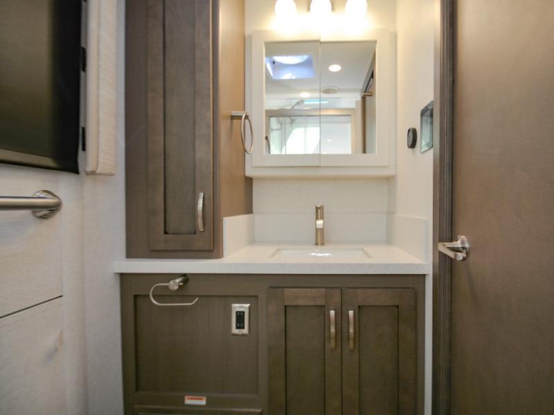 Pack your bags for an extended vacation in this four slide out coach! Once you've parked for the day, you can make lunch in the full kitchen that includes a 30" stainless steel convection microwave with a three burner cooktop and an air fryer feature. There is a 10 cu. ft. Norcold refrigerator and pantry to store your food, plus a booth dinette where you can dine together. A Jackknife sofa provides more seating space, or you may just find yourselves outdoors under the Carefree Travel'r awning. The mid-coach full bath will be easily accessible for everyone to use, and the rear private bedroom provides you with your own space at night. Here, you'll enjoy a queen bed slide out with overhead storage, a dresser with a Samsung LED TV, plus a wardrobe with sliding mirror doors.