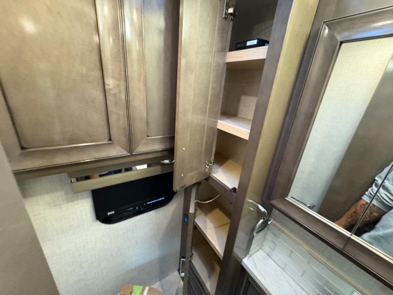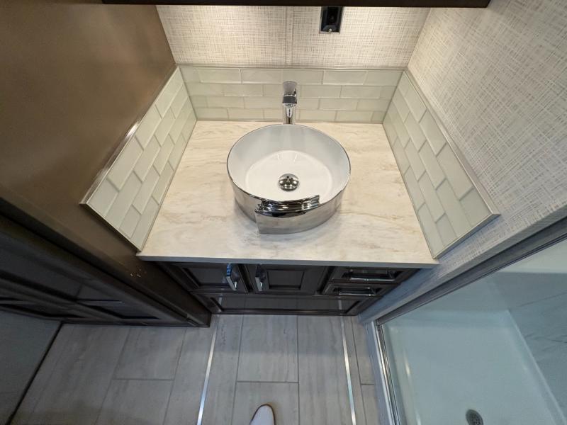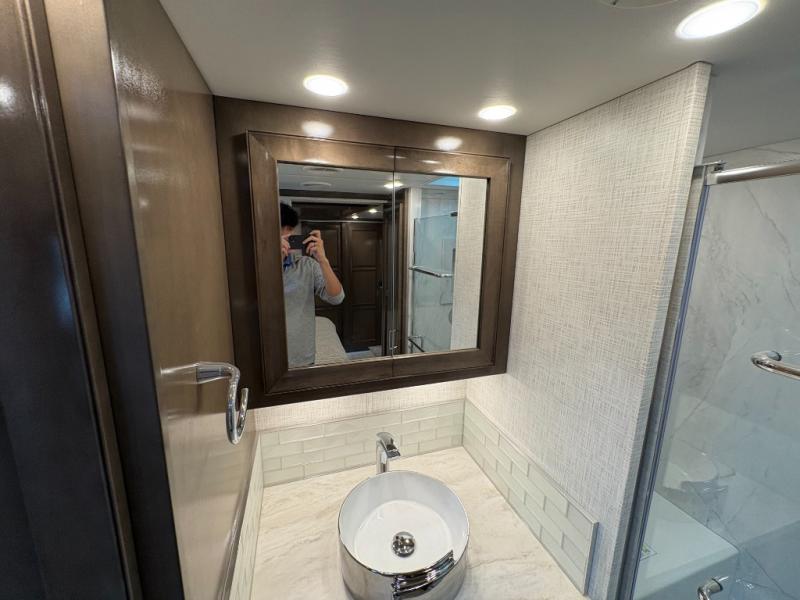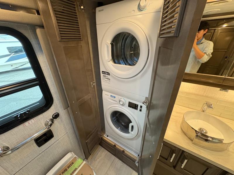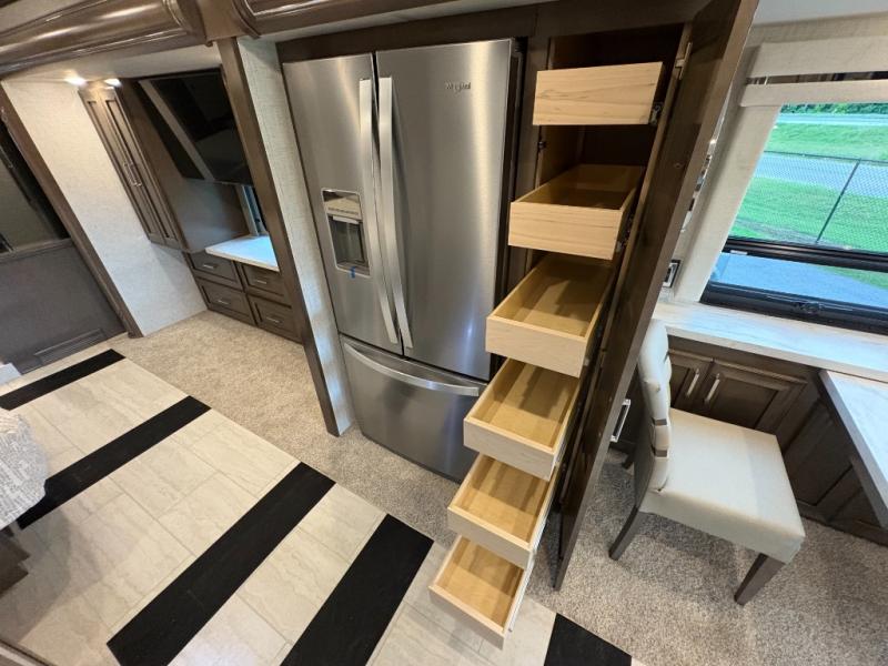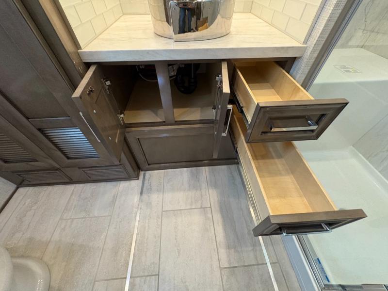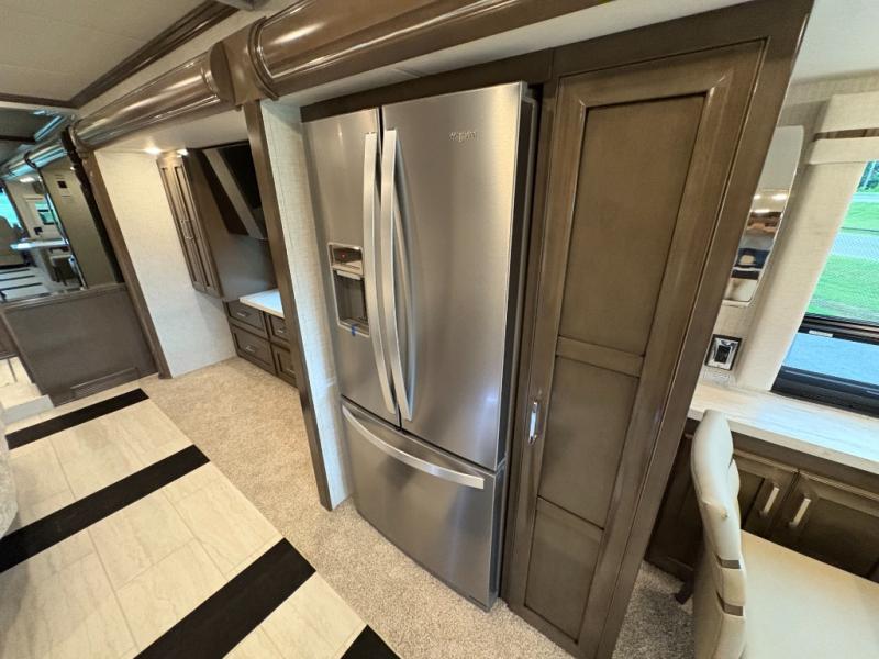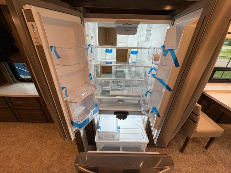 Step right into luxury with this Ventana coach that can sleep six people each night. Your guests can make their beds on the side hide-a-bed sofa, the jack knife sofa, and the booth dinette, while you take the king bed slide out in the master bedroom. You will have the full rear bath to yourselves that includes a wardrobe with shelves, a 50" x 30" shower, plus washer and dryer prep to make life on the road easier than ever. In the morning you can prepare breakfast on the all electric induction cooktop, or use the stainless steel convection microwave. There is also a large pantry here and a 19.7 cu. ft. Whirlpool refrigerator for food storage.
