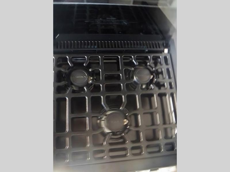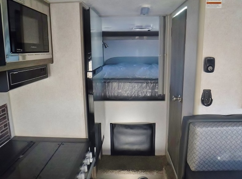 Make your weekend excursions easier than ever in this cozy truck camper for three to four. Since there is a 58" x 80" queen bed up front, you won't have to sleep on the floor, and your guests can sleep on the booth dinette that converts to a 40" x 72" sleeping area. Get cleaned up each day in the convenient wet bath that includes a medicine cabinet and an exhaust fan to keep everything fresh. There is a three burner cooktop and residential-style microwave with an air fryer to prepare meals each day, plus an 8 cu. ft. 12V refrigerator for perishables. This model also includes three wardrobes around the bed for more storage place plus a TV location if you want to add the optional 24" 12V LED TV!