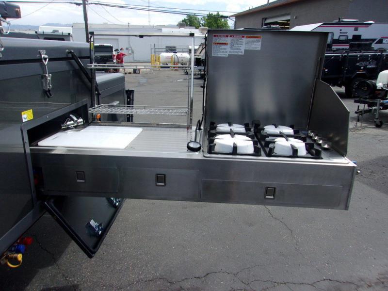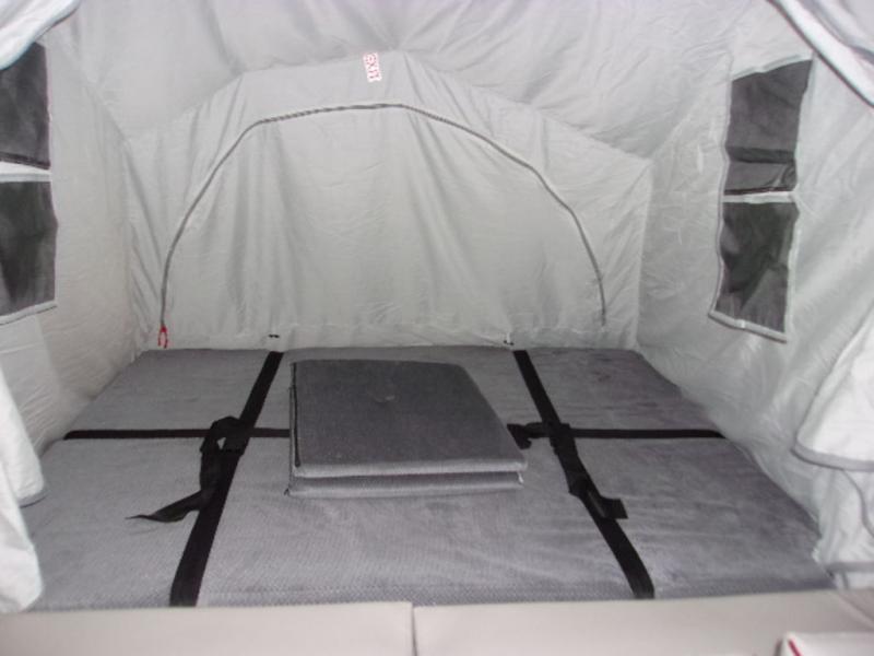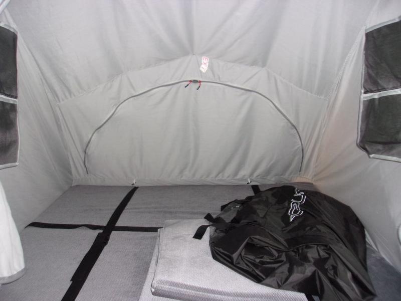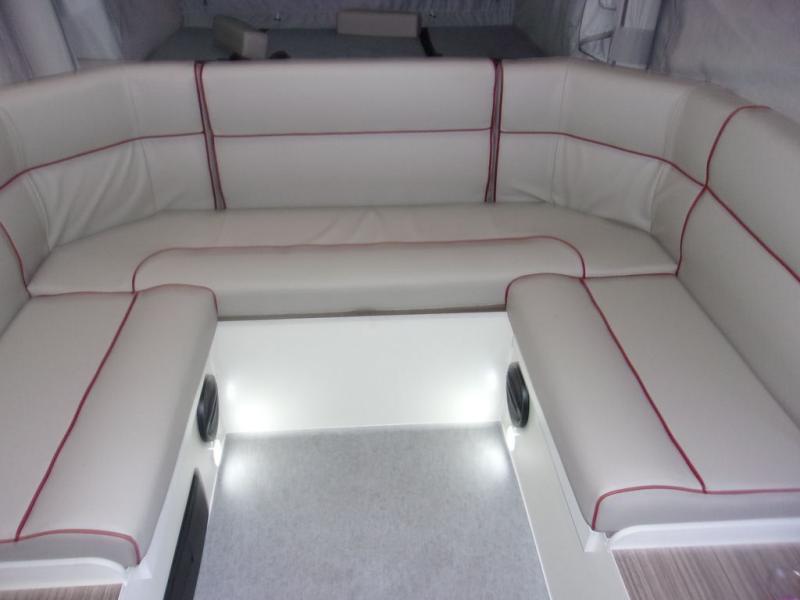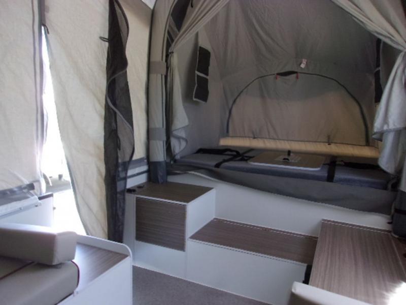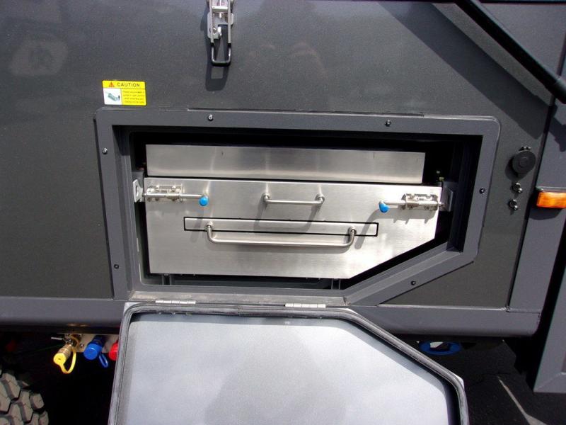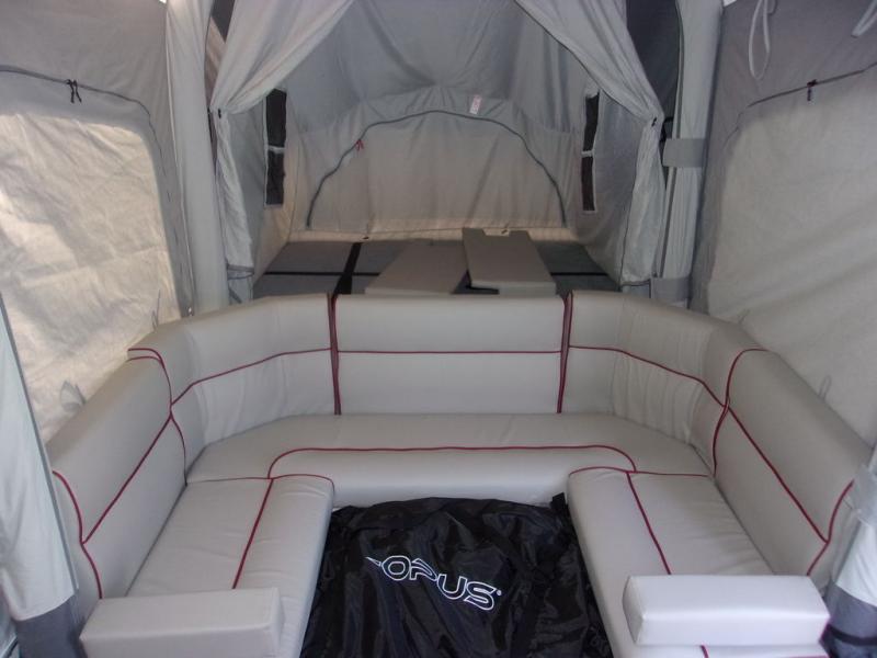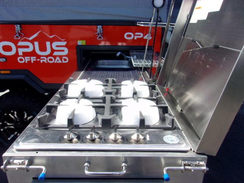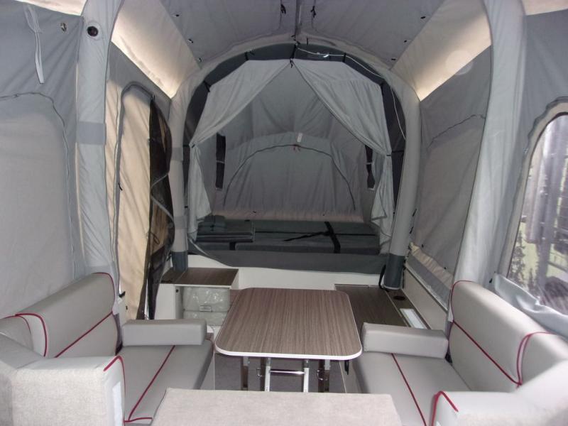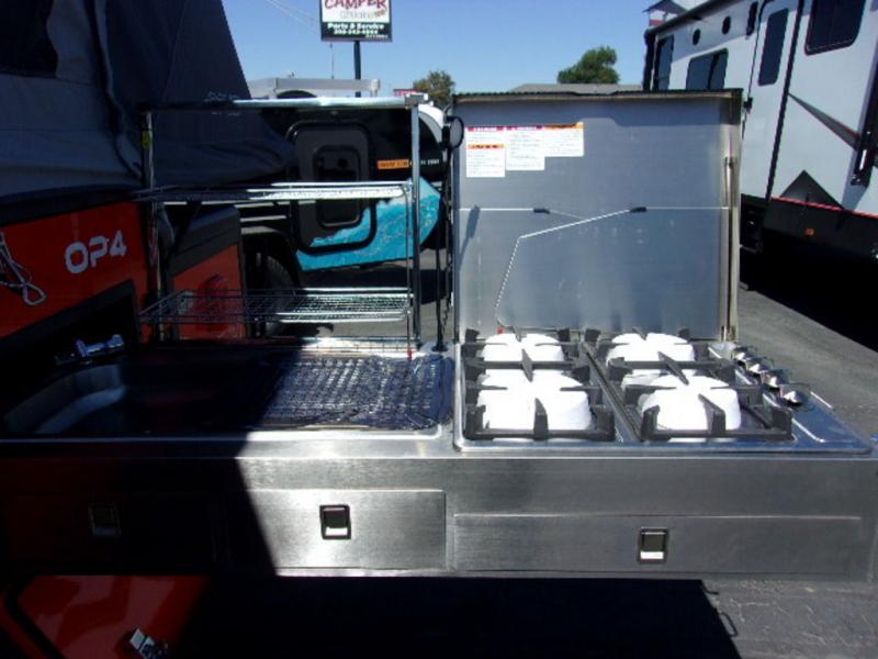 From the rapid deployment of the AIR inflation technology, the tent on this OPUS folding pop-up camper is easily ready in ninety seconds, and all you have to do is open and secure the two double-size tent beds and turn on the switch. You will experience more storage than you thought could be found in a pop-up and on-board water. The cook can whip up a warm meal on the four-burner cooktop within the outside stainless steel kitchen which includes a stainless steel chopping board and pantry at arm's reach, and then you can dine at the U-shaped leatherette lounge that can easily be converted into extra sleeping space for two. There are several windows to open up your space to enjoy the weather, and there are several options to customize your OPUS just like you want.