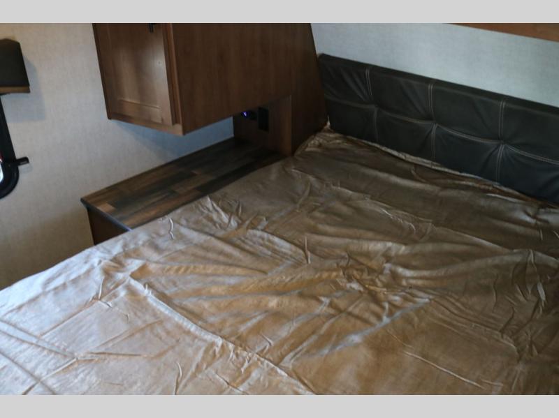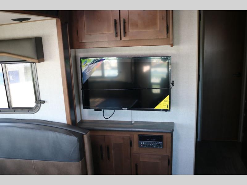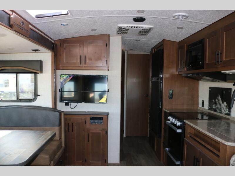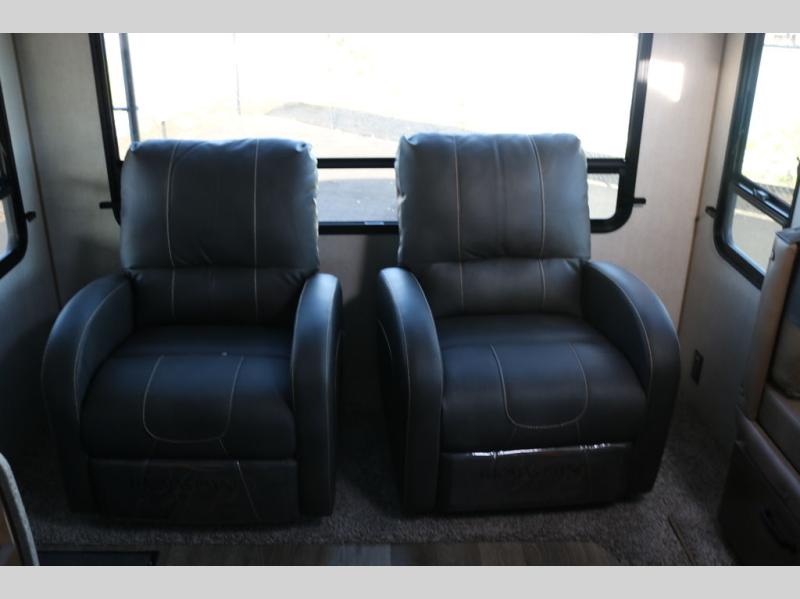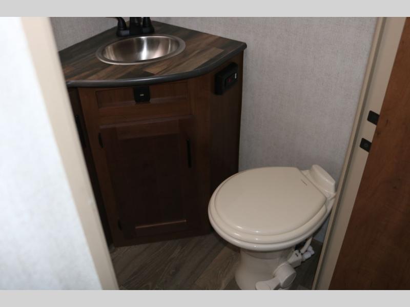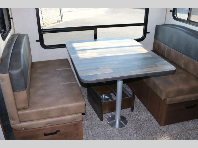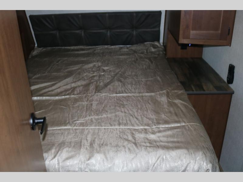 Head out to your favorite campsite in this roomy couple's trailer. There are dual entry doors, allowing you to enter in through the rear living area, or the front private bedroom. You can relax on the dual recliners after you've unpacked and maybe watch a show on the swing-out 32" TV. Once lunch is prepared on the three burner cooktop, you can dine at the mountain dinette with a skylight, or head outdoors to sit under the 21' awning. The queen bed is sure to bring comfort in the front bedroom, and if you have an overnight guest, they can sleep on the dinette!