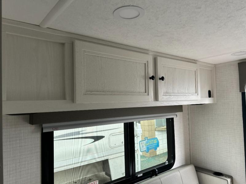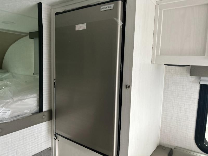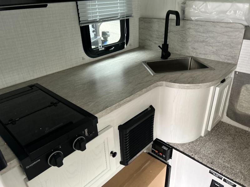 You will have everything you need for a comfortable trip in this hard side truck camper! There is a front queen bed to lay your head on at night with storage next to it and an entertainment center if you choose to add the optional TV. Above the two burner cooktop and sink are overhead cabinets to store your cooking essentials. The 60" x 22" jackknife sofa is not only a comfortable place to enjoy your meals, but also for transforming into an extra sleeping space, plus it has overhead cabinets to store your games. You even have a wet bath to freshen up in each morning!
