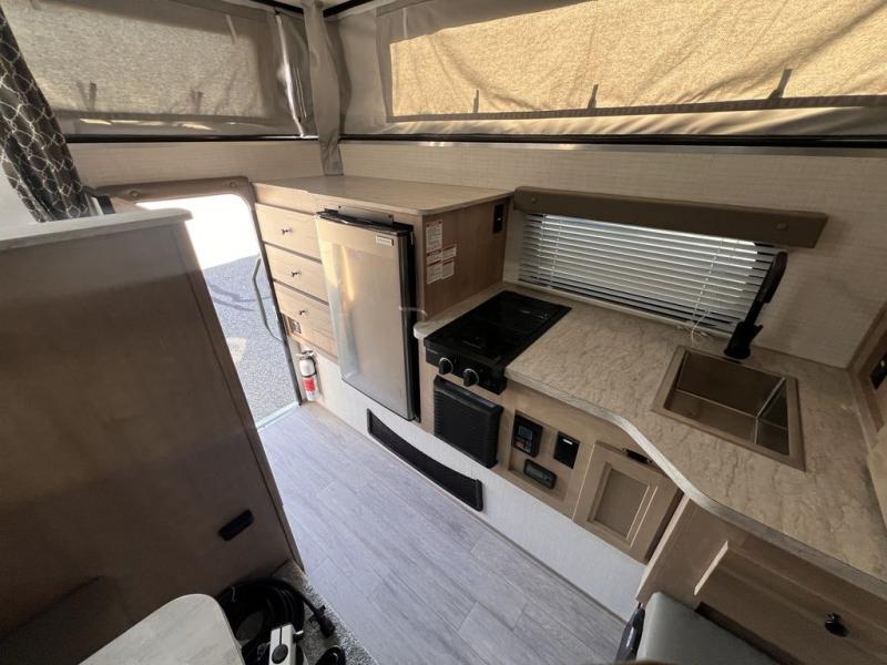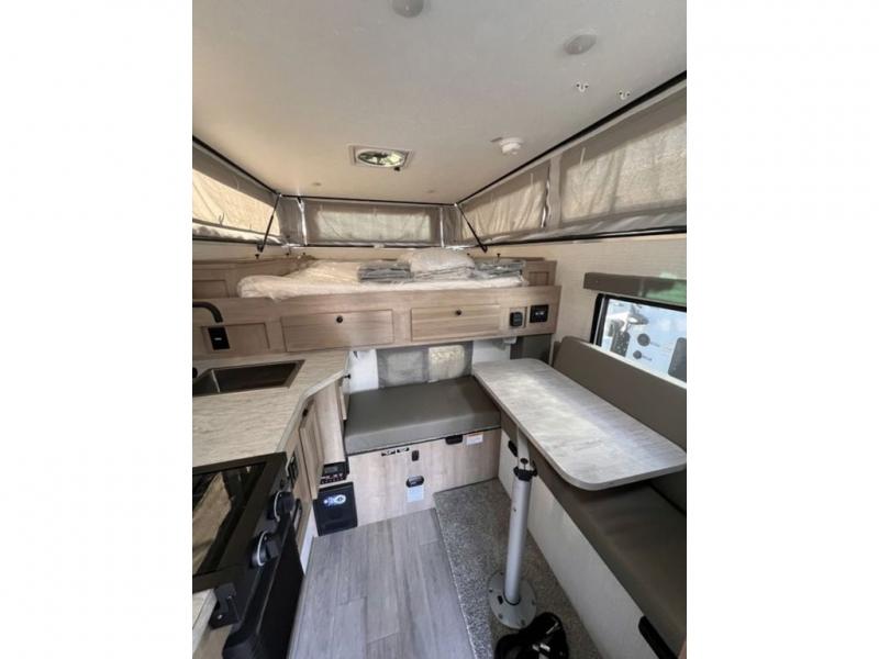 Make the most of all your adventures with this soft side truck camper! Start each morning feeling recharged after sleeping on the front queen bed with foot lockers and bedroom storage on either side of it, and freshen up in the wet bath with storage to keep your towel nearby. There is storage across from the bathroom for your canned goods, a refrigerator to keep your perishables fresh, and a two burner cooktop to prepare your best meals. Enjoy your meals at the seating area with a table then grab a board game from the storage area under the seating!