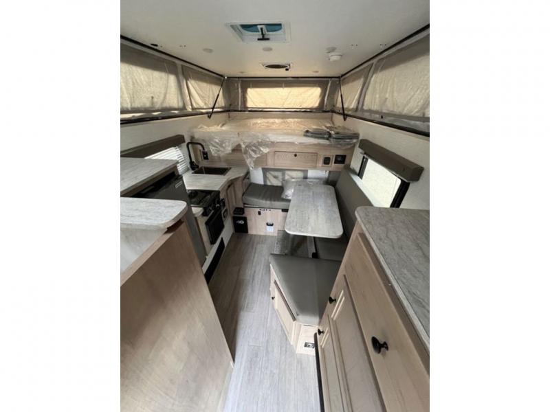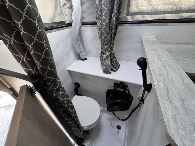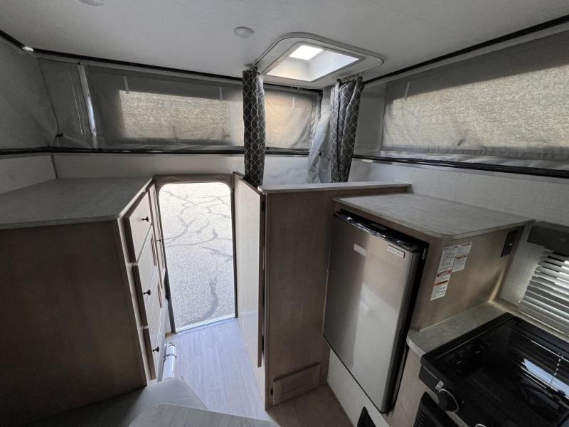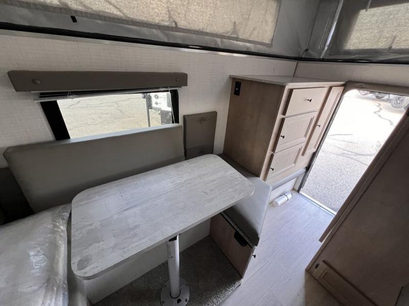 Your 1/2 ton truck with an 8' bed will have an easy time hauling this soft side truck camper! After traveling, freshen up in the wet bath with a dome to make it easier for taller occupants. Across from the bathroom is a closet with storage next to it to keep your items out of the way, plus there is storage underneath the seating area. Prepare your best meals with the two burner cooktop then enjoy them at the seating area with a table and play a card game afterwards. Lay your head on the front queen bed for a good night's rest!