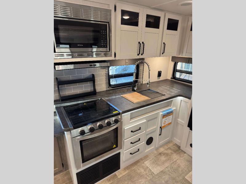 UNDERNEATH, ELEC AWNING W/LED LIGHT STRIP, PRE-WIRED FOR SOLAR SYSTEM, LED LIGHTING, 13.5 BTU DUCTED A/C, CONGOLEUM DESIGNER CAREFREE RESILIENT FLOORING, BEDSPREAD, BEDROOM TV HOOK UP, TV ANTENNA W/BOOSTER & CABLE HOOK UP, TUB/SHOWER SURROUND, AM/ FM/BLUETOOTH STEREO, GLASS RANGE COVER, UNDERMOUNT SINK W/ COVER, WI-FI PREP - ADVANTAGE PACKAGE - 11 CU FT 12V SS RESIDENTIAL REFER, 1.3 CU FT SS MICROWAVE, 21" SS OVEN, RANGE HOOD, ENCLOSED UNDERBELLY, 2-O/S SPEAKERS, 6 GAL GAS/ELEC HOT WATER HEATER, OUTSIDE SHOWER, ROLLER SHADES, SPARE TIRE & CARRIER, FOLDING GRAB HANDLE, BATH SKYLIGHT, UPGRADE KITCHEN FAUCET W/ PULL DOWN SPRAYER