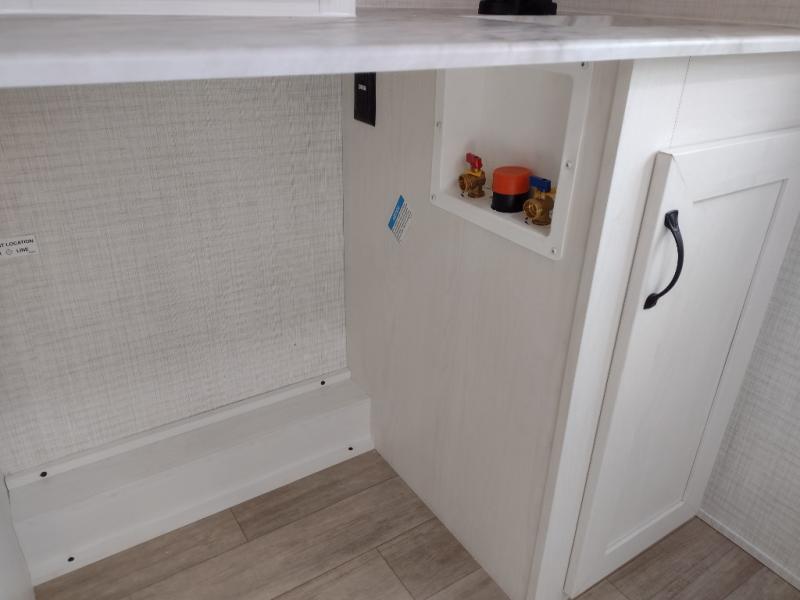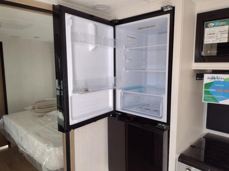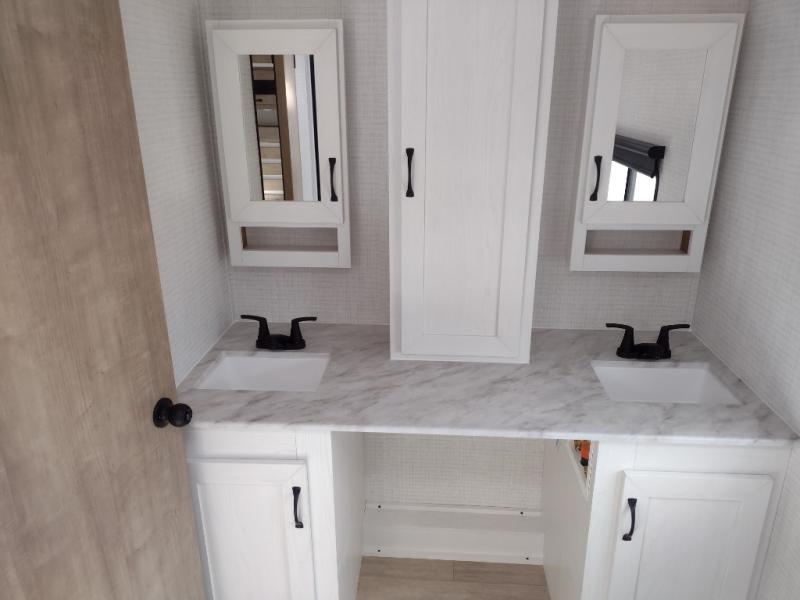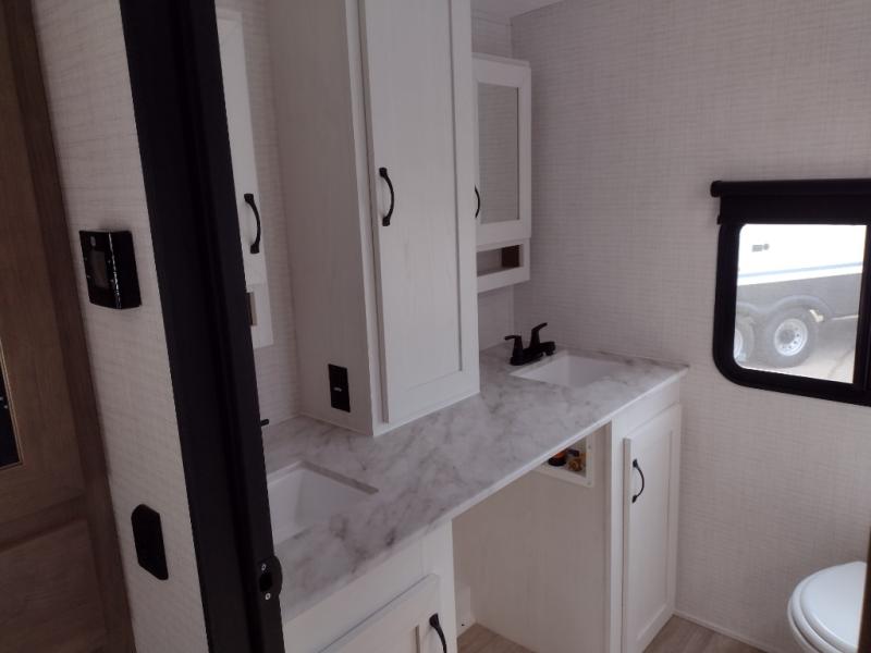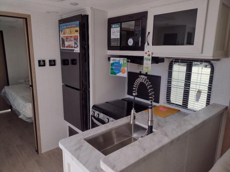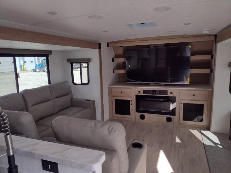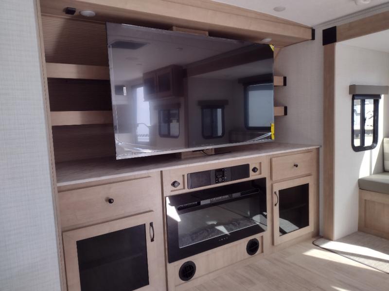 This travel trailer will feel just like home with its front living area, master bedroom, and triple slides for more space! You'll enjoy the sectional sofa and 63" dinette with two chairs on one side with a bench seat on the other. There is a front entertainment center where you can add an optional TV, and the fireplace will make it more cozy. A middle kitchen includes all the appliances to make meals each day, plus an electric refrigerator and pantry for food storage. Head towards the back to find the master bedroom with a king bed slide out, dual wardrobes, and a desk with drawers if you need to get some work done. And the full rear bath is super accommodating with its dual bath sinks plus washer and dryer prep!