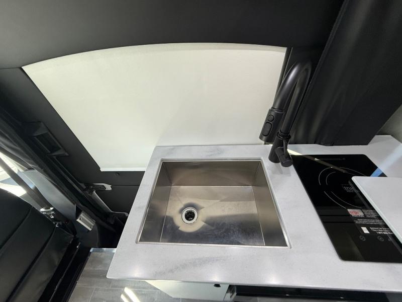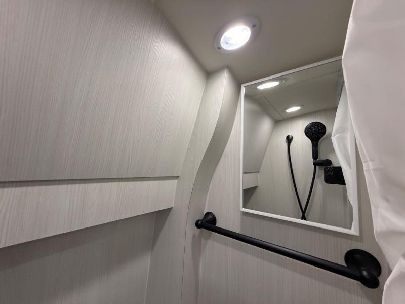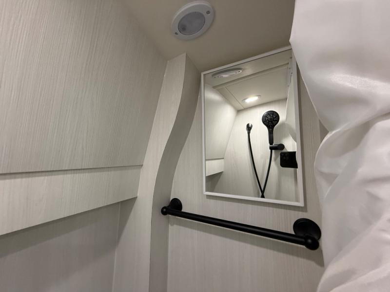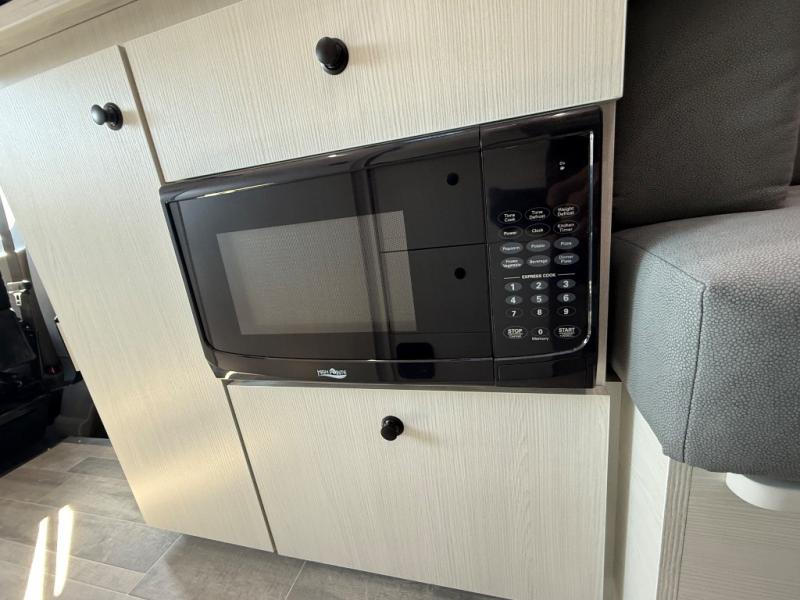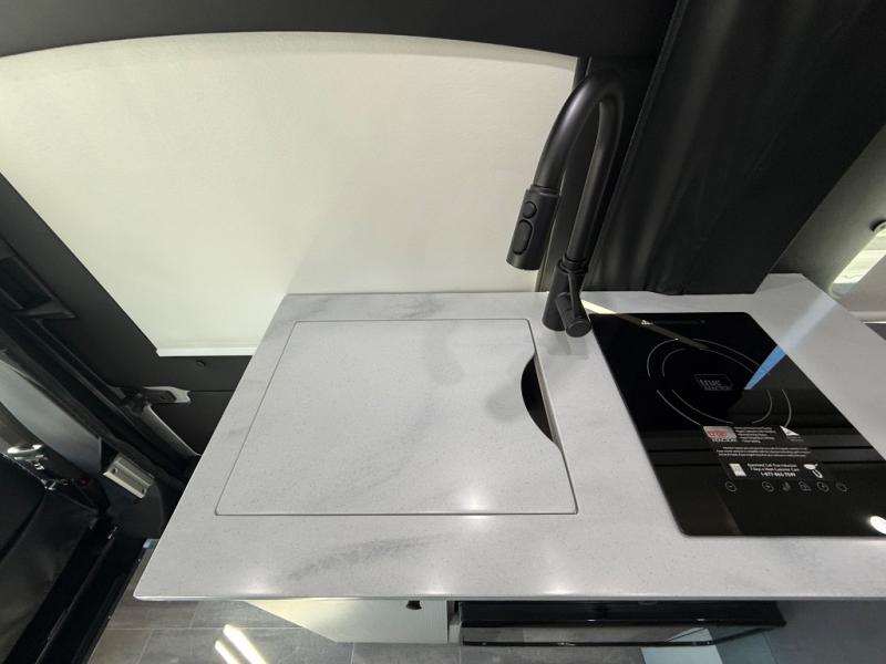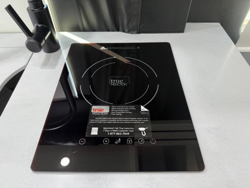 Functional Elegance: Cook in style with an induction cooktop, microwave, and 5.5 cu. ft. refrigerator. The wet bath is compact yet complete with a stainless-steel sink, shower, and flush toilet.