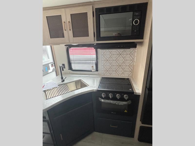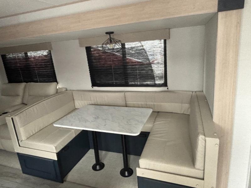 With any Avenger travel trailer by Prime Time, the exterior includes an aerodynamic smooth front metal, a diamond plate front rock guard for protection on the road, and four stabilizer jacks to keep your unit secure. There is a fully walkable roof plus an enclosed and heated underbelly that will help extend your camping season. The interior offers a 15,000 BTU air conditioner for the perfect climate inside, in-floor ducted heat, a systems monitor panel, and a Winegard 360+ antenna with Wi-Fi prep that will give you the option to stay connected as you camp. Each model also includes seamless Carefree Congoleum flooring, kitchen backsplash, shower pans in all models, and pleated nightshades throughout to name a few interior comforts!