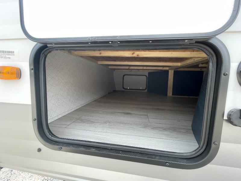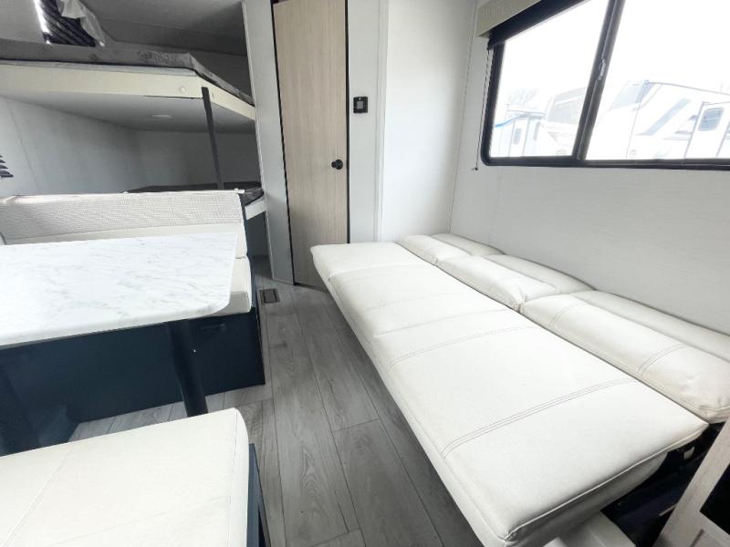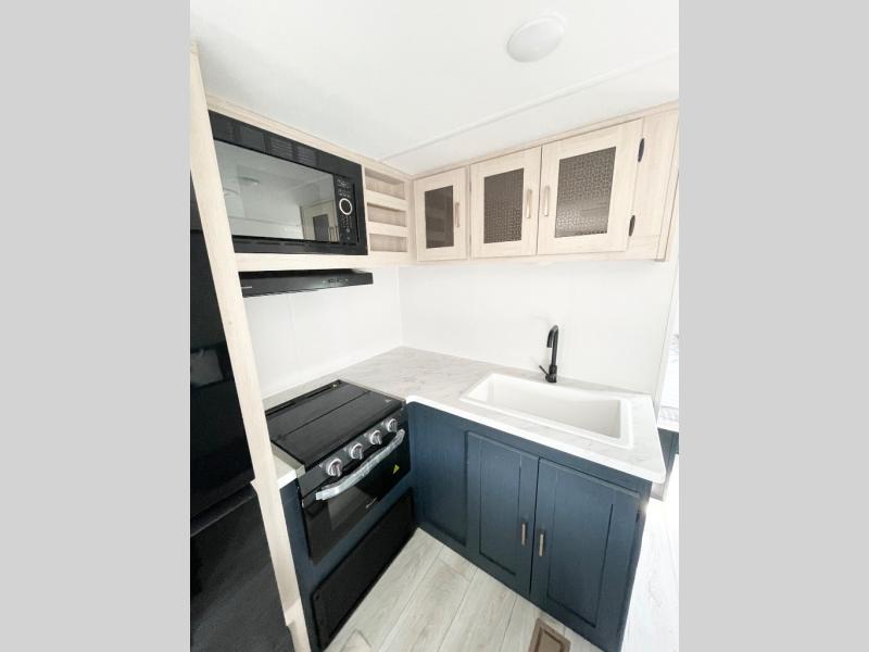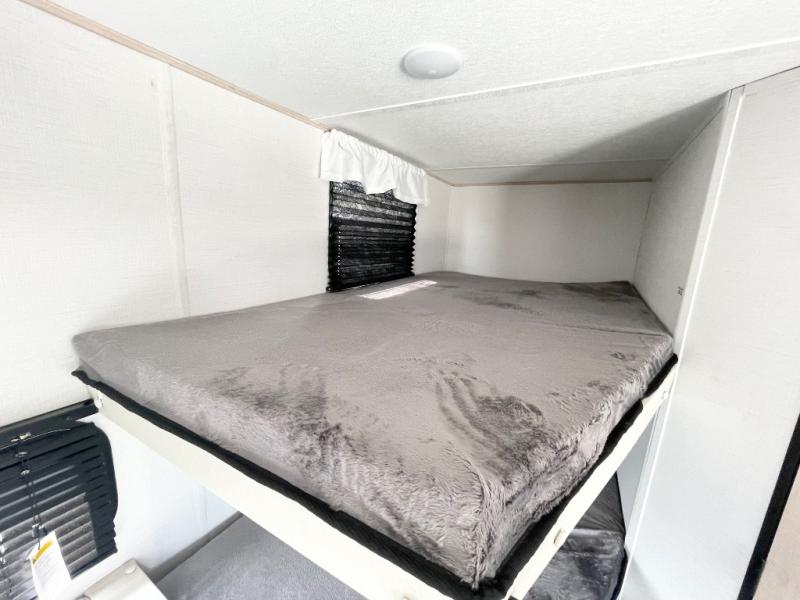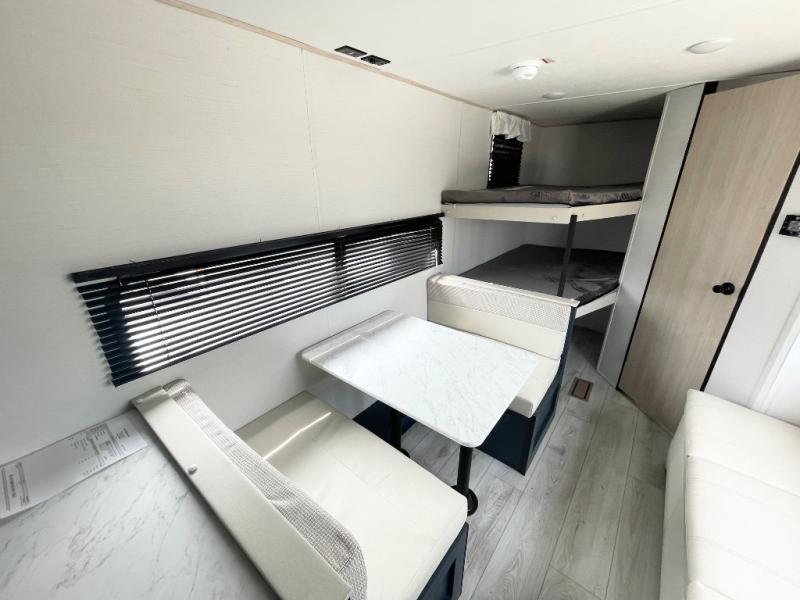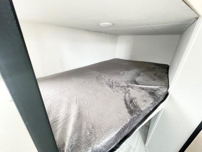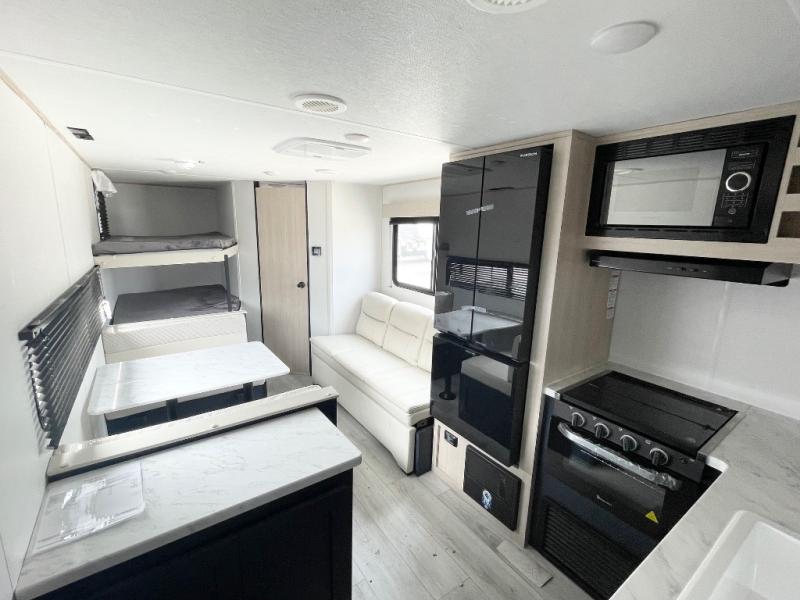 The whole family can go camping in this travel trailer! This trailer offers sleeping accommodations for up to eight because of the double-size bunk beds, the booth dinette, the sofa and the queen bed. There is a rear corner full bathroom with a medicine cabinet to store personal belongings. You will find full kitchen amenities inside, as well as an outdoor kitchen where you can watch the kids play while making dinner. The front private bedroom offers a place to retreat and relax after a fun day of playing at the beach!