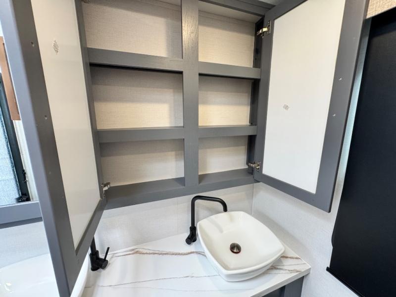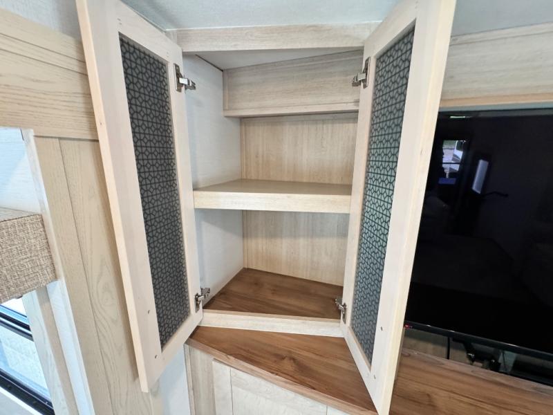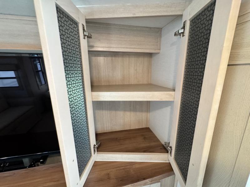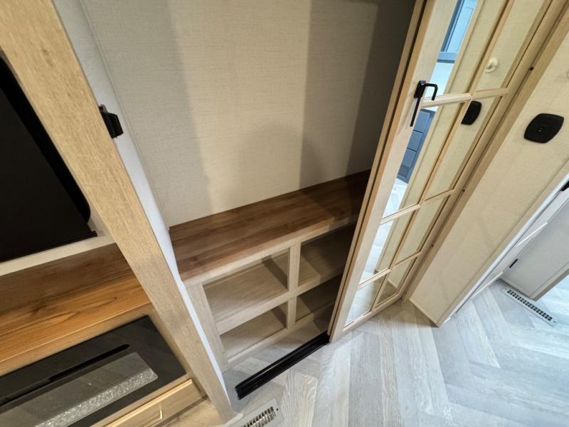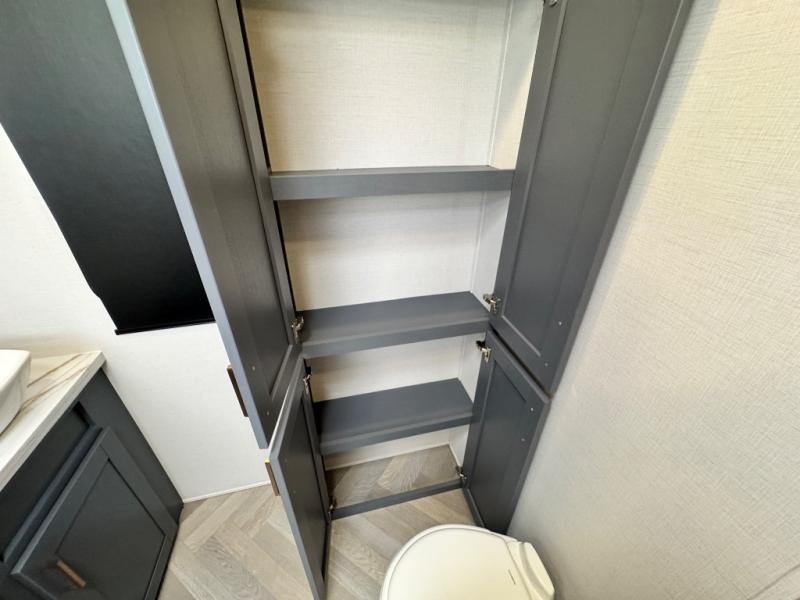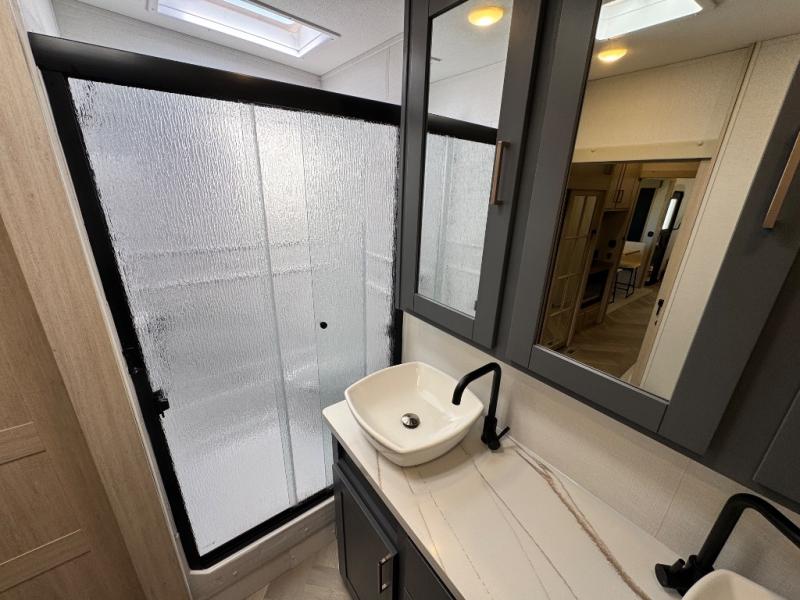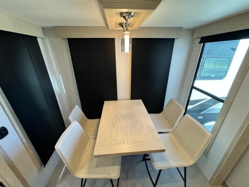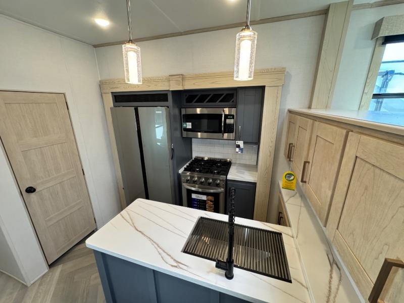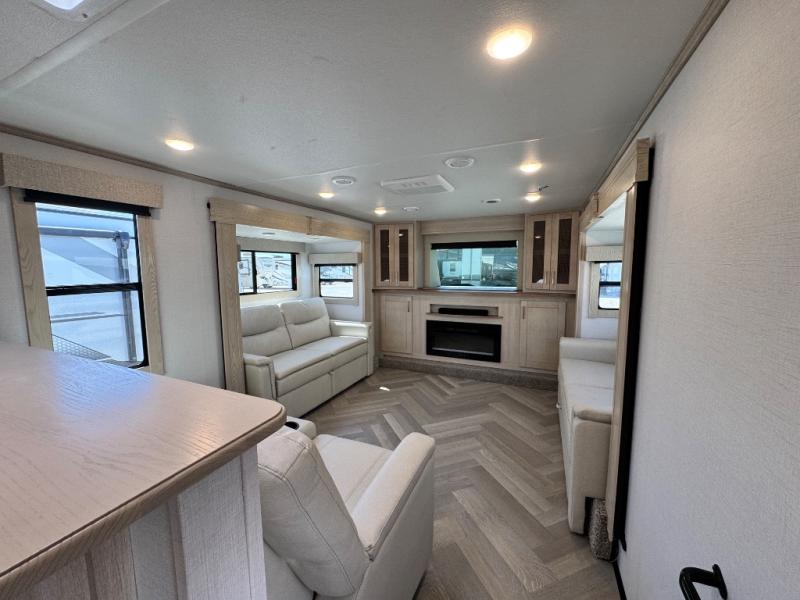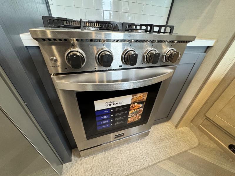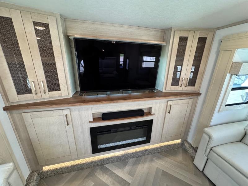 It's a clean decision with a bath and a half to take this fifth wheel on your next adventure! The front living area includes opposing EZ glide couches, 65" theater seating, and a front entertainment with a Smart LED pop up TV and fireplace for a cozy evening indoors. Prepare meals on the four burner cooktop, and leftovers can go in the 16 cu. ft. French door 12V refrigerator. You and your spouse will love the master suite that includes a king bed slide, plenty of storage space, and an entrance into the full rear bathroom with a dual sink vanity. There is even a linen closet with washer and dryer prep if you want to add those appliances!
