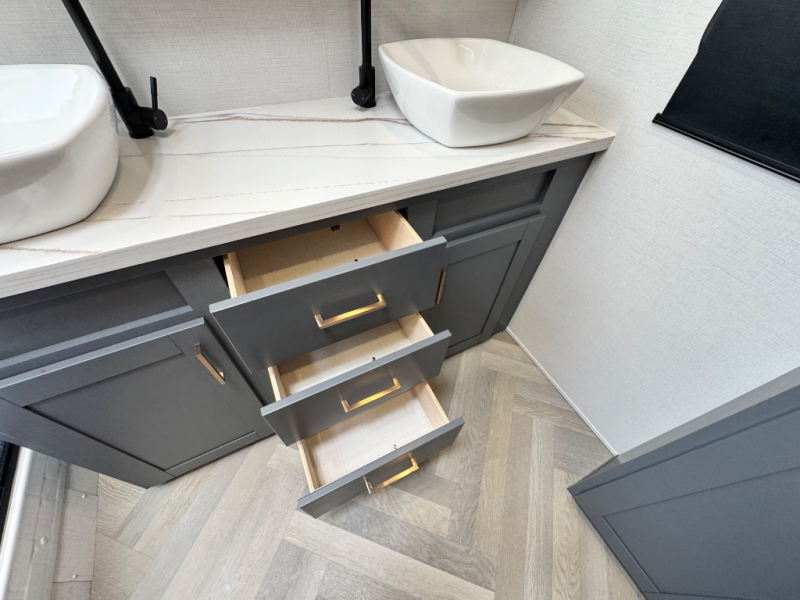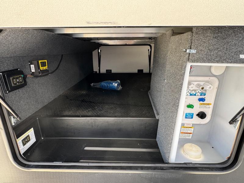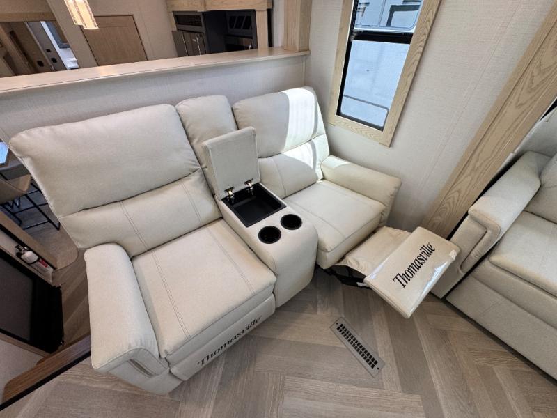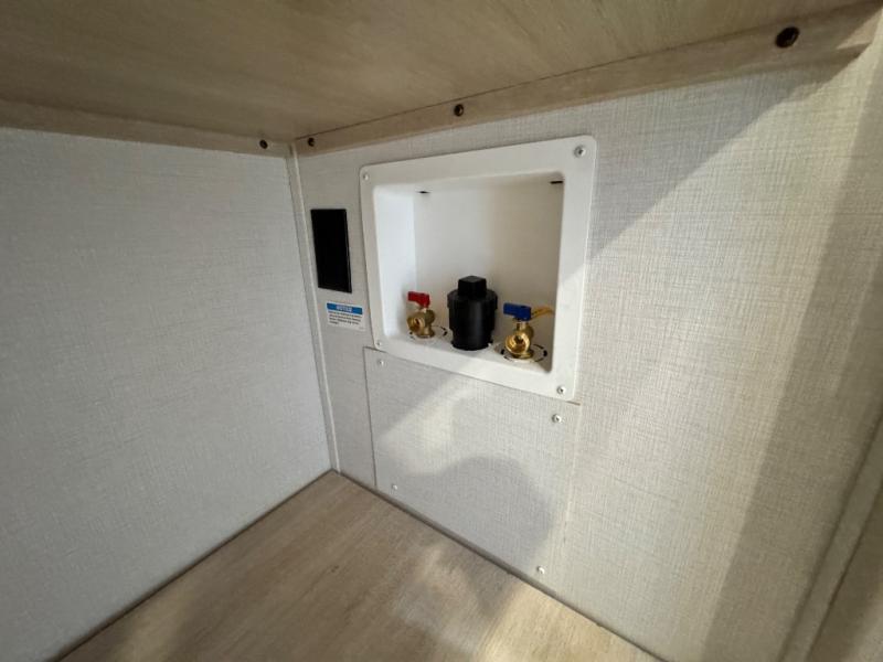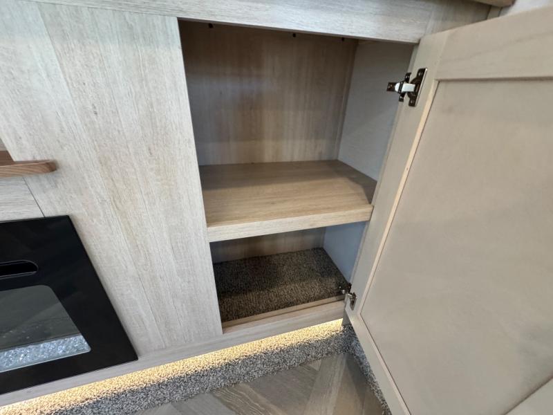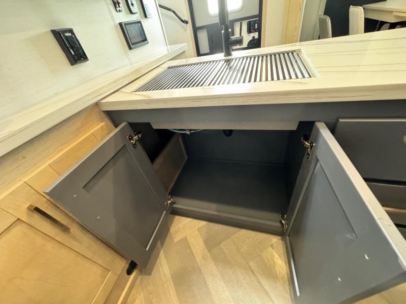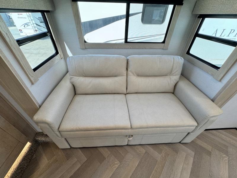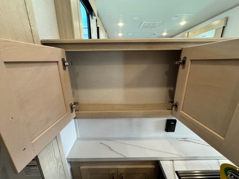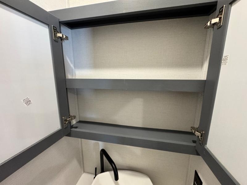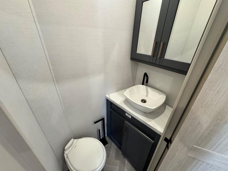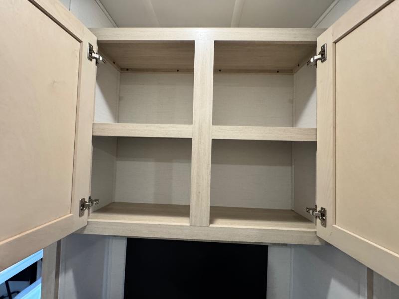 It's a clean decision with a bath and a half to take this fifth wheel on your next adventure! The front living area includes opposing EZ glide couches, 65" theater seating, and a front entertainment with a Smart LED pop up TV and fireplace for a cozy evening indoors. Prepare meals on the four burner cooktop, and leftovers can go in the 16 cu. ft. French door 12V refrigerator. You and your spouse will love the master suite that includes a king bed slide, plenty of storage space, and an entrance into the full rear bathroom with a dual sink vanity. There is even a linen closet with washer and dryer prep if you want to add those appliances!