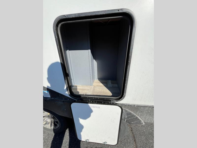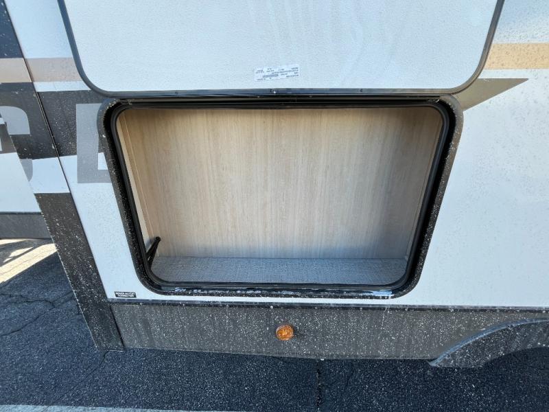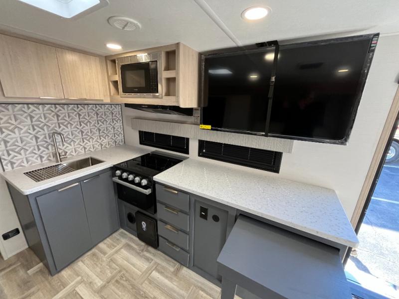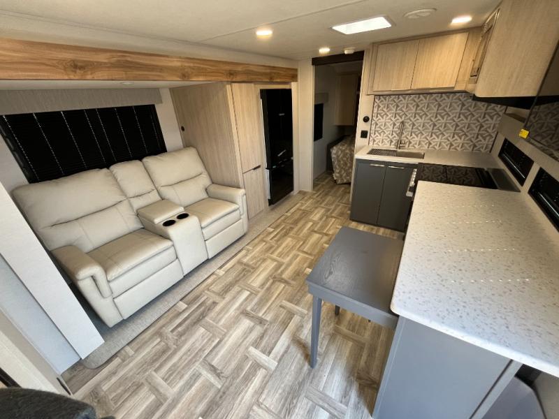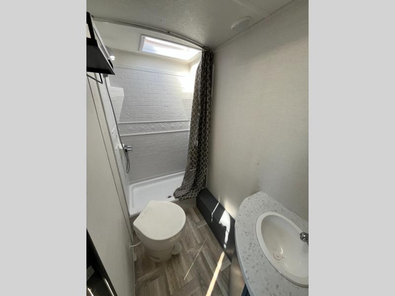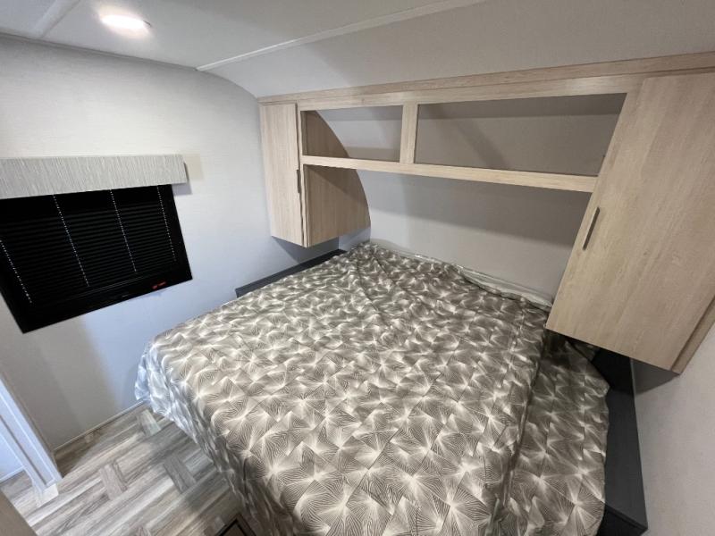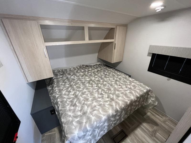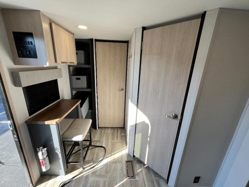 The perfect couple's trailer is found with this RV! You'll enjoy the front private bedroom with its queen bed and dual wardrobes for your things, and the rear corner full bath on board will let you stay clean throughout your trip. In the morning, you can make breakfast in the full kitchen, then dine at the bartop with three stools. There is also a theater seat within the slide out for more comfort and space, plus the pantry and refrigerator are here so you can easily grab a snack. A desk with a chair lets you work while you're away from home if you need to, and there is even a closet with washer and dryer prep if you choose to add those appliances!