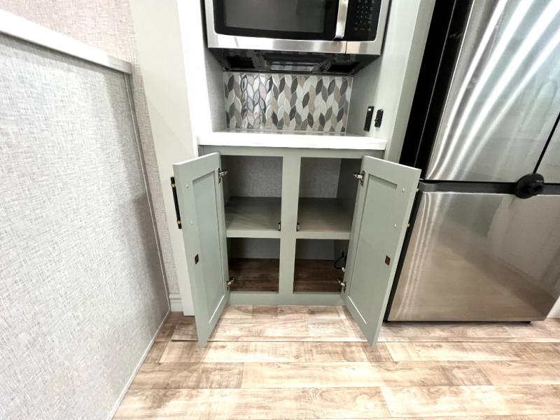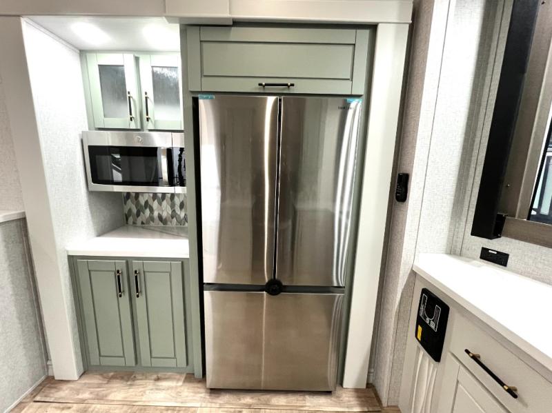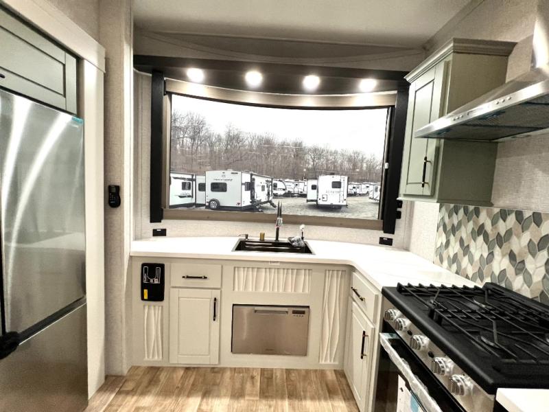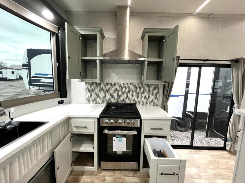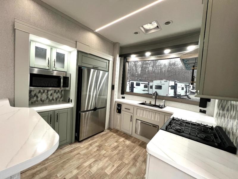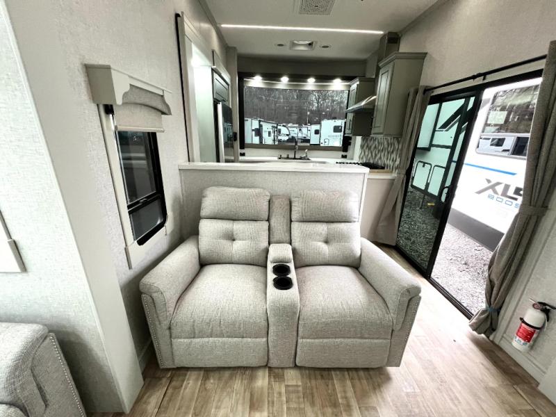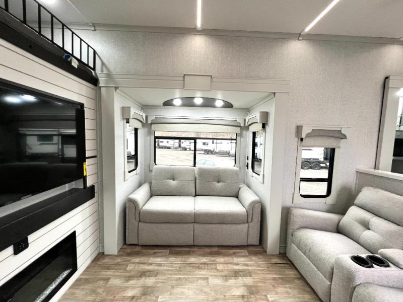 If you are looking for a destination trailer with more space and a larger sleeping capacity, this is the one! There are double loft areas; one above the bedroom with dual bunk mats and one above the bedroom with a third bunk mat. You'll find the rear bedroom ultra inviting with its king bed slide out, entertainment center with a 39" TV, plus a wardrobe and dresser to keep your things organized. If you have any other guests, they can sleep on the 72" sofa in the middle living area. There is also theater seating here, a ceiling fan, plus a fireplace and 50" TV. And the free-standing table with chairs and a bench provides a place to dine and play games in the evening. Head to the front kitchen where you'll find generous counter space, a bar top with two stools, and all the kitchen appliances to create your best meals!