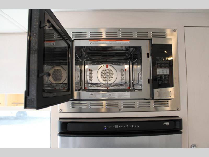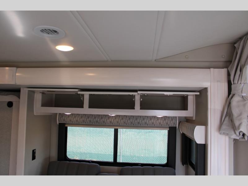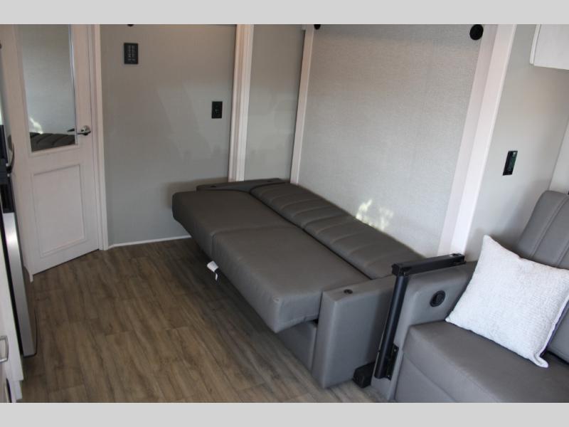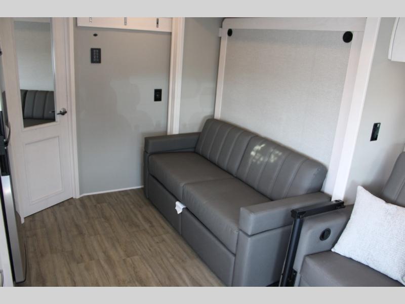 This is the perfect couples motorhome to explore the country! You will stay squeaky clean in the full rear bathroom with shower, and a large closet to store your clothes, towels, and other toiletries. Depending on what time you enter this coach will determine whether you see the sofa or the 65" x 72" Murphy bed. The kitchen has a two burner cooktop, a convection microwave, and an 8 cu. ft. refrigerator to prepare home cooked meals, and a booth dinette to enjoy them at. The 46" x 80" bunk mattress over the cab lets another member join in on the adventure and the booth dinette offers sleeping space as well.