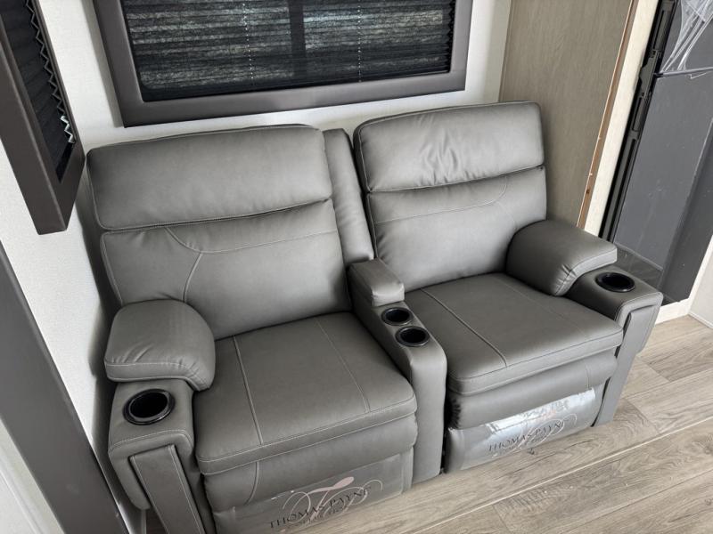 The sofa slide creates clear floor space in the living area, making it comfortable for daily use rather than just pass-through traffic. The kitchen is positioned to keep prep, storage, and appliances within reach, supported by generous counter space and a large pantry that works well for longer trips. Sink covers add usable prep space when needed, keeping the kitchen flexible without adding clutter.