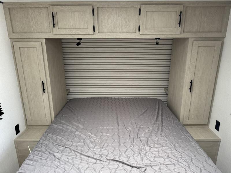 Up front, the dedicated bedroom provides separation from the living area for added privacy. The 60" x 74" bed fits comfortably within the space, allowing access around the bed while keeping storage and sleeping areas organized and contained.