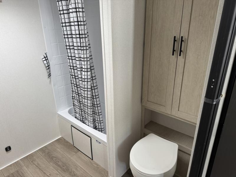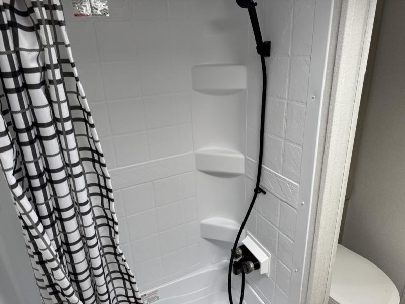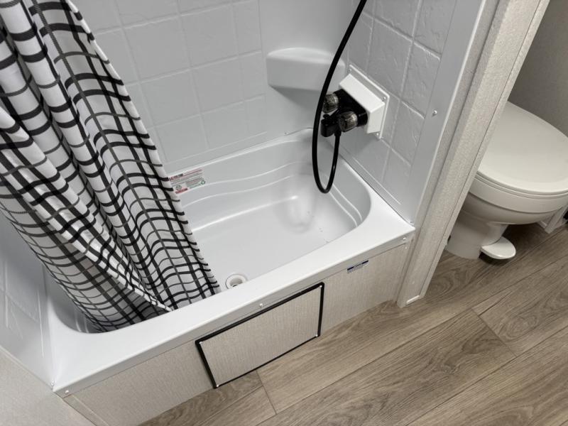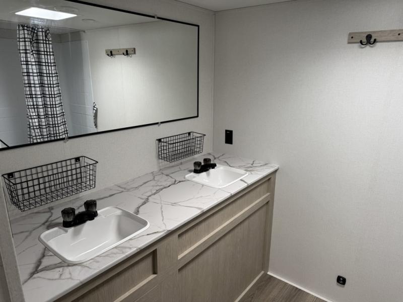 The full rear bathroom is one of this floorplan’s strongest features. Dual sinks allow two people to get ready at the same time without crowding, while the tub/shower and private toilet area create a true residential-style bath setup. Its placement at the rear keeps bathroom use separate from the kitchen and bedroom, supporting smoother day-to-day routines.