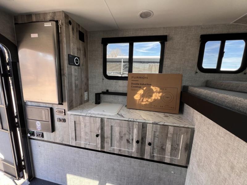You can explore in complete comfort with this truck camper on your back! There is a comfortable 45" x 80" bunk up front to sleep on, or you can choose the optional 80" x 81" pull-out North/South bed. A two person dinette with a bench seat and fold-away table provides a place to enjoy your meal after it's been prepared on the two burner electric cooktop. There is also a 12V refrigerator that comes standard and an optional microwave oven if you want meals on the go. The portable cooktop can also be taken outside for added convenience, and the dinette can be converted for additional sleeping space for a guest. You can even add an optional commode to make camping trips that much easier!