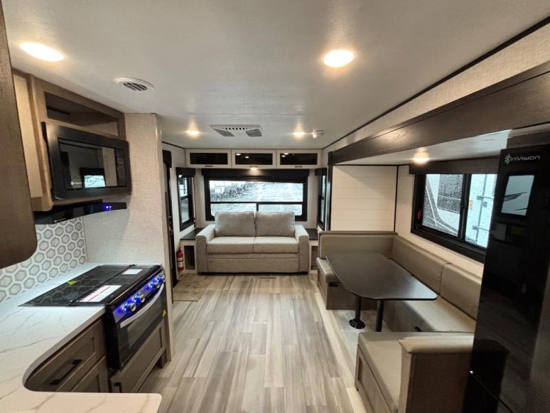 Easily hitch up this dual axle trailer and head out to the campgrounds to enjoy a long weekend or week-long vacation with your favorite person! You might even like to invite a few friends to stay the night on the furniture that doubles as extra sleeping space. The single slide offers more interior floor space to move from the main entry to the walk-through bathroom which offers extra counter space for toiletries, and linen storage for your towels and such. The front bedroom provides a walk-around bed, windows, dual wardrobes and the second entry into the trailer. The cook will love the L-shaped kitchen area, the 17" oven and the three burner range with glass cover. And the exterior offers a 19' power awning to relax under when outside.