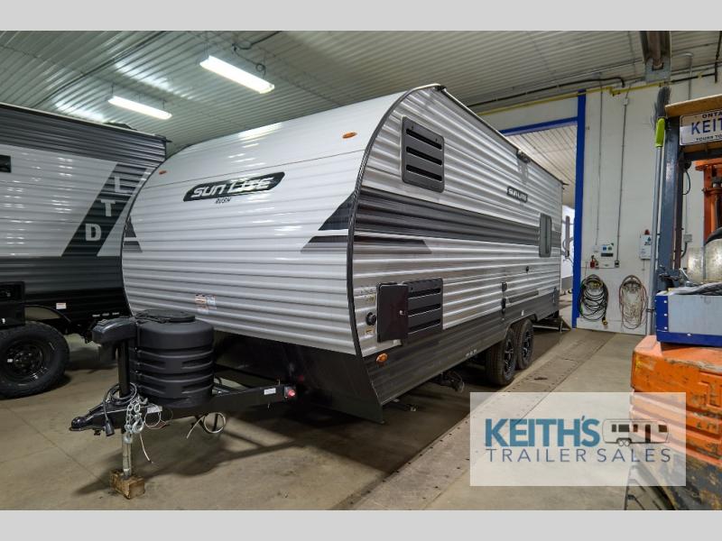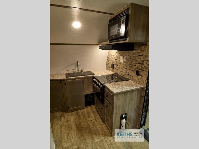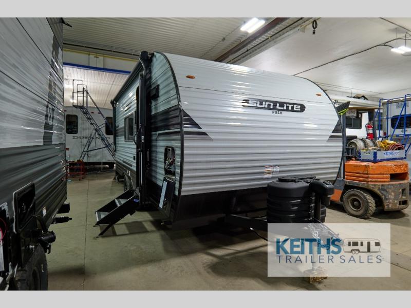 You can trust the build and enjoy your experience with any one of these Sunset Park RV Sun Lite travel trailers or toy haulers! Their aerodynamic profile is not only easy to haul, but also saves on fuel. They are built to withstand years of traveling even though they are lightweight with a diamond plate rock guard, a one piece PVC roof membrane, Dexter Spring-Leaf axles, and tinted safety glass windows. Some comfort standards you are sure to enjoy are the two-burner stove top range with hood, light and fan, plus the refrigerator and microwave, and an outside shower to help keep the dirt outdoors where it belongs.
