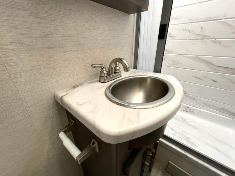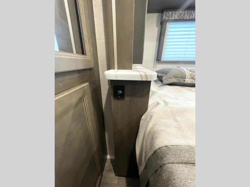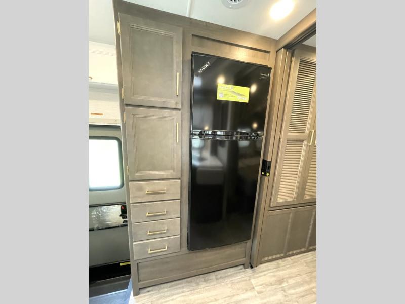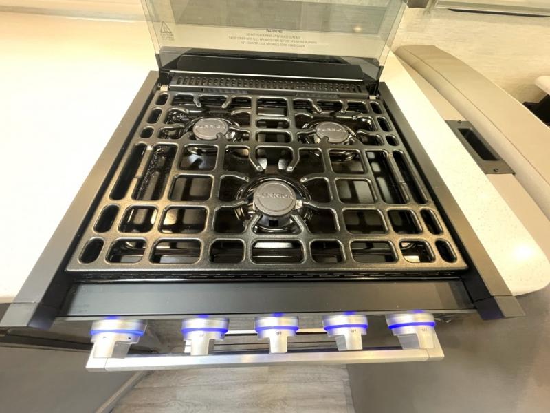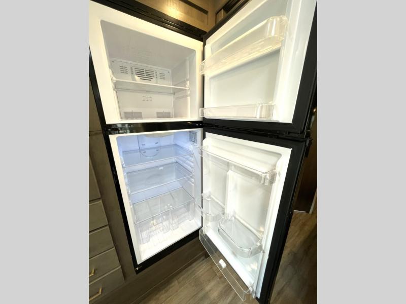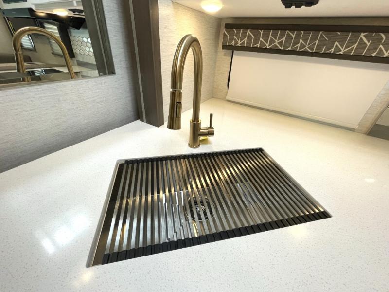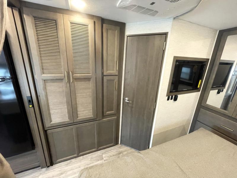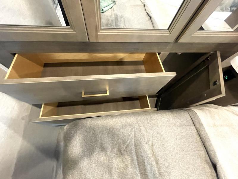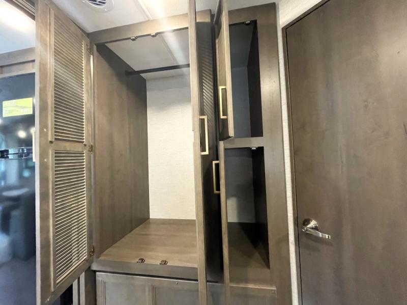 The kitchen makes cooking on the road easy with a three-burner cooktop, microwave, deep sink, pantry, and plenty of counter space. Whether you’re whipping up a quick breakfast or hosting dinner for friends, you’ll have everything you need within reach. And when it's time to relax, you’ll appreciate the indoor entertainment setup with a 42-inch living room TV, plus a 32-inch TV in the bedroom.