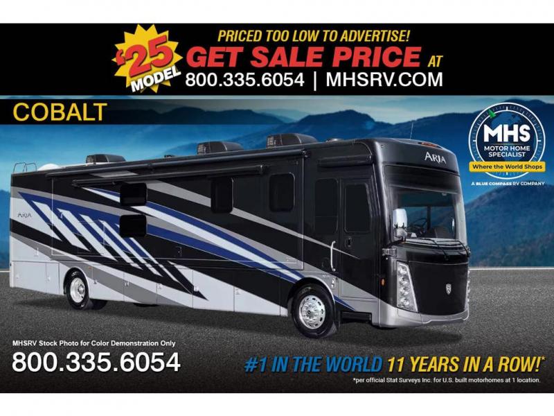 With any Aria Class A diesel motorhome by Thor Motor Coach, experience RV living with all the luxurious amenities you are accustom to, command the roadways with improved handling from the l-beam front axle with a 55-degree wheel cut, and enjoy a smooth ride thanks to the Air-Ride suspension and Sachs shock absorbers. The driver will also appreciate the 10.1" touchscreen dash radio with Bluetooth, and Sirius/XM prep when navigating the roads, and the comfort of the leatherette reclining/swivel adjustable captain's chairs. The bathroom provides an oversized full height shower with a glass door and a designer backsplash, while the kitchen provides solid surface countertops and a dinette. You'll also enjoy designer tile backsplash, a large double bowl stainless steel sink with a single handle faucet, a pull-down sprayer, plus full kitchen amenities. More standout features include the Studio Collection cabinetry with rake style doors and matte finish, living room pin-up lights, and polished porcelain tile flooring, plus much much more depending on the Aria you take on the road!