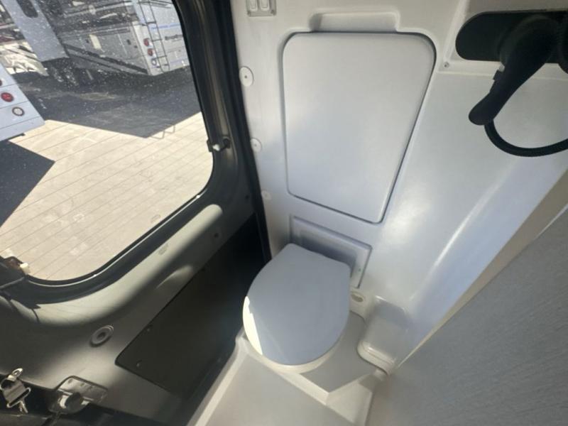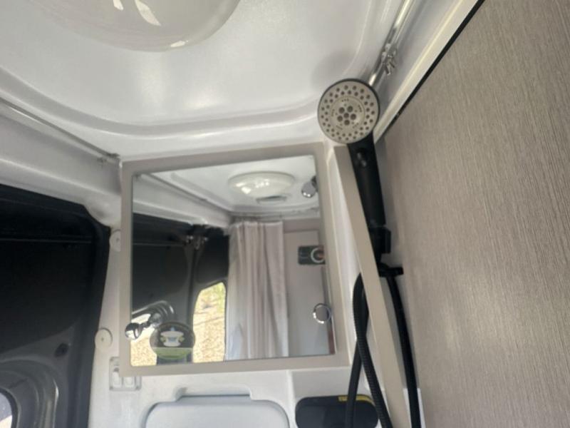 This Thor Motor Coach Dazzle includes a wet bath located all the way to the rear so you have more living space up front. The kitchen is just behind the cockpit swivel chairs, with a single door 12V refrigerator, two burner cooktop, and stainless steel sink. Towards the back are two twin beds that serve as seating areas during the day, and at night they can be converted to a king-size bed. There's also a removable dining table to enjoy all your meals. The fully enclosed rear wet bath features a shower and power vent. There's also an outdoor shower to keep things extra clean.