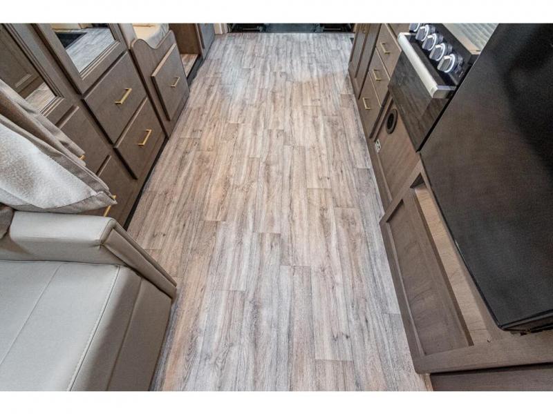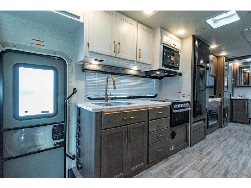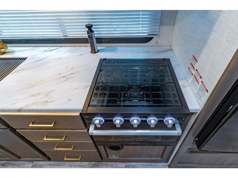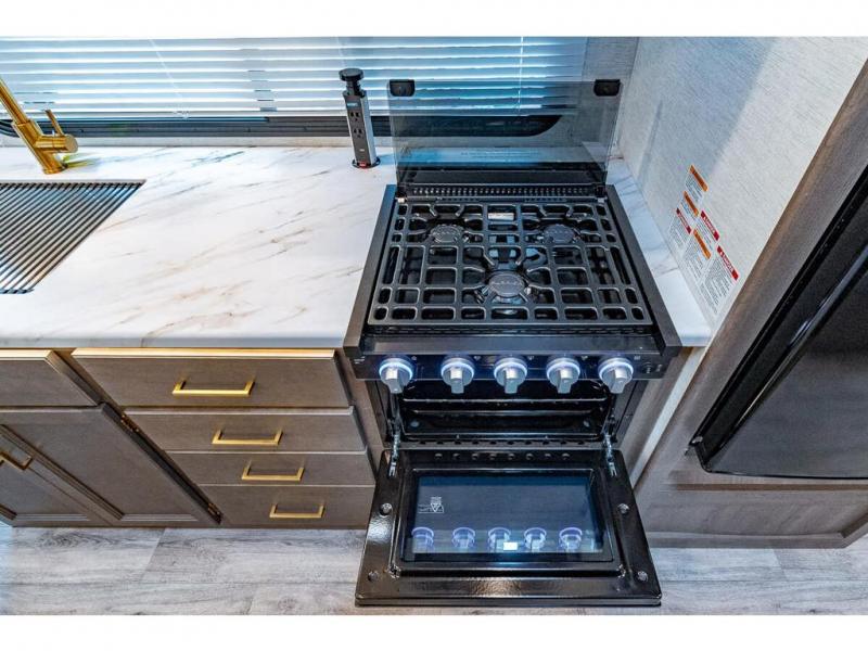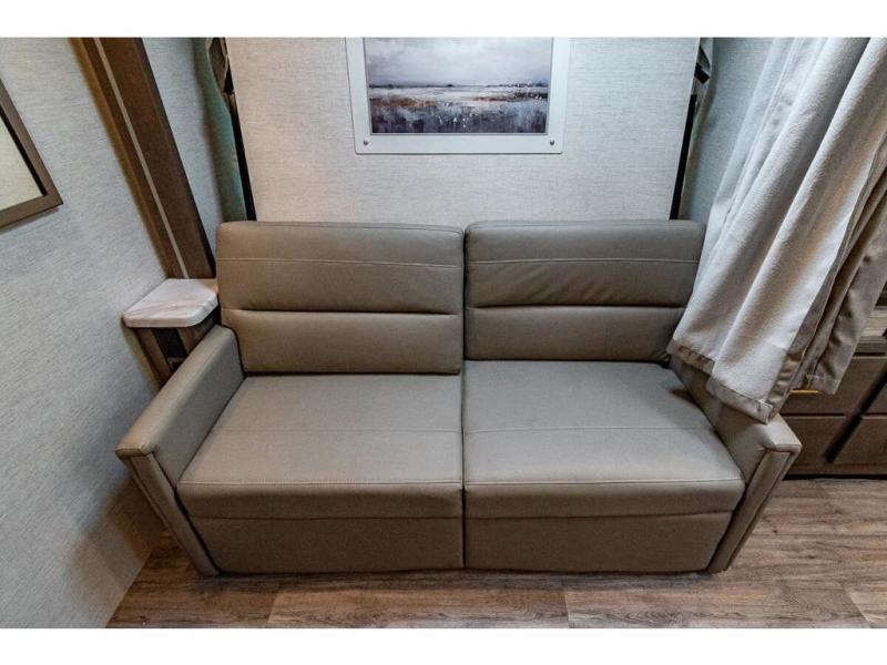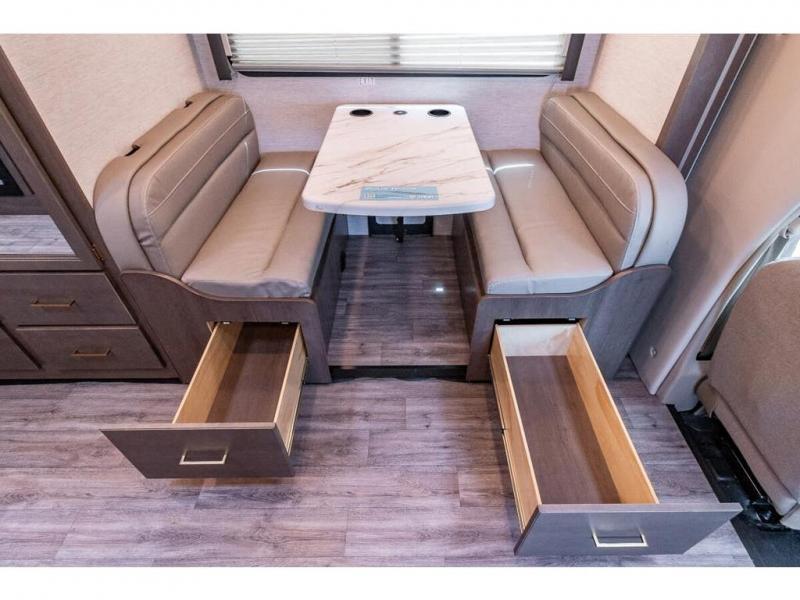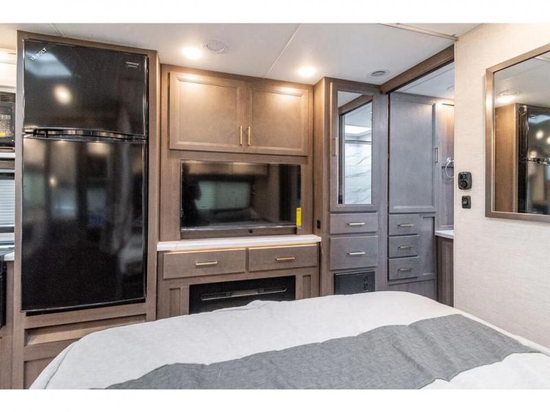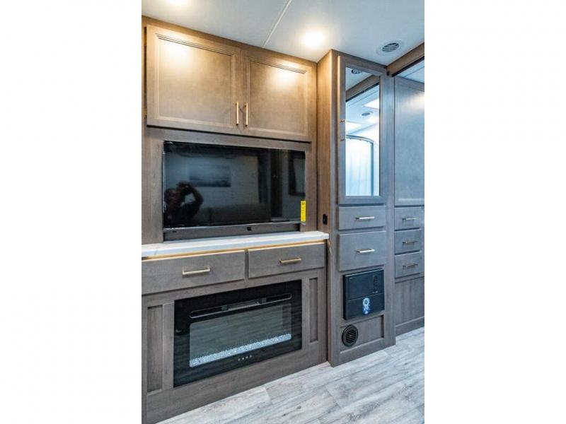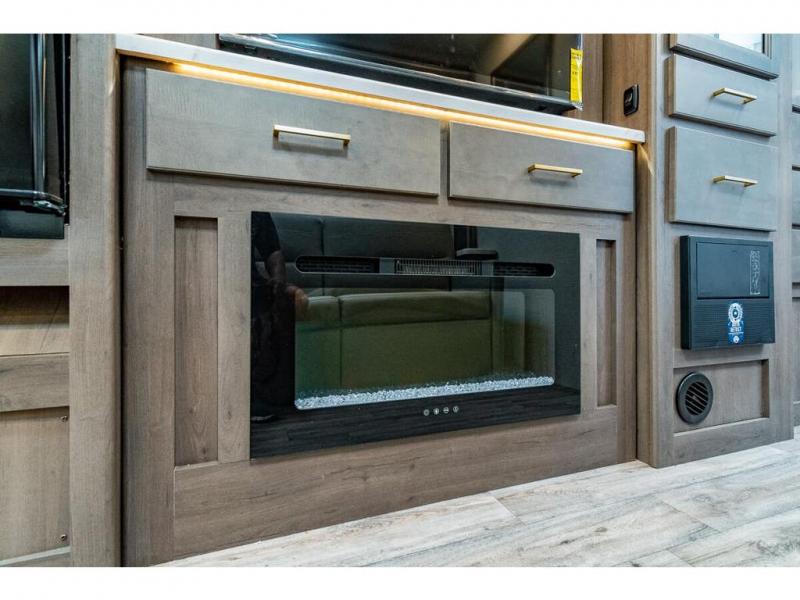 Wherever you decide to roam, you can be sure you'll have comfort at every turn in this spacious coach! There is a dream dinette, two closet, and a sofa with a Murphy bed within the full-wall slide, plus a privacy curtain around the bed if you have guests staying over. A cab-over bunk features a 52" x 96" sleeping area, and everyone can take turns cleaning up in the full rear bath! There is also a fireplace in front of the sofa/Murph bed and a 39" Smart TV for movie nights. In the morning, you can prepare breakfast on the three burner gas cooktop or in the microwave oven, and there is a 12V refrigerator to keep food fresh!
