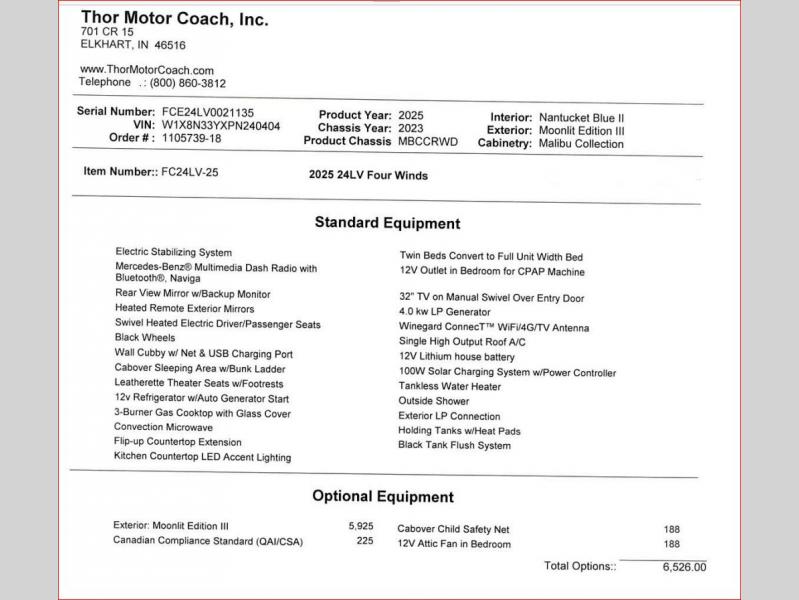 Thor Motor Coach Four Winds Sprinter Class C diesel motorhome 24LV highlights:
