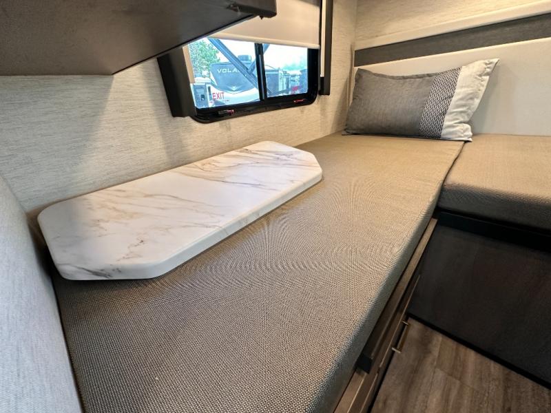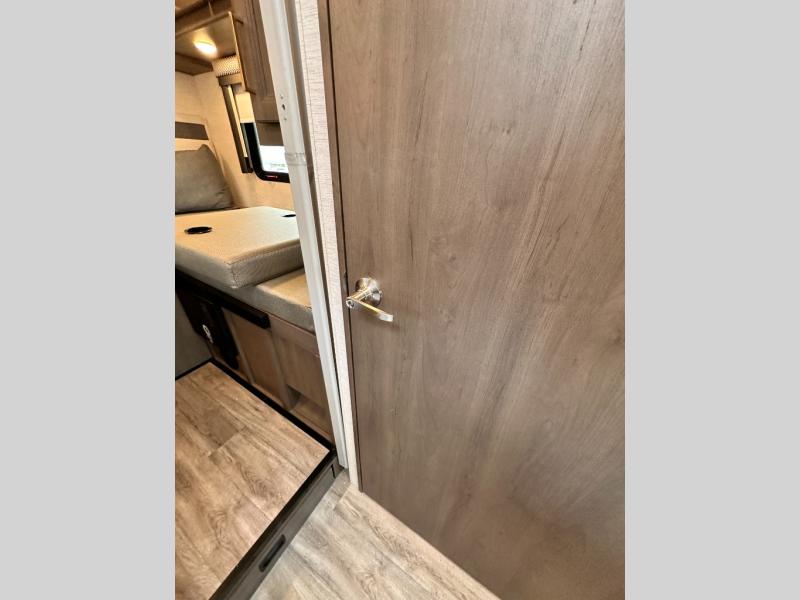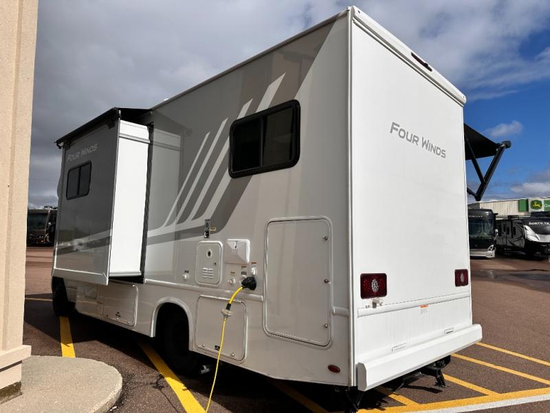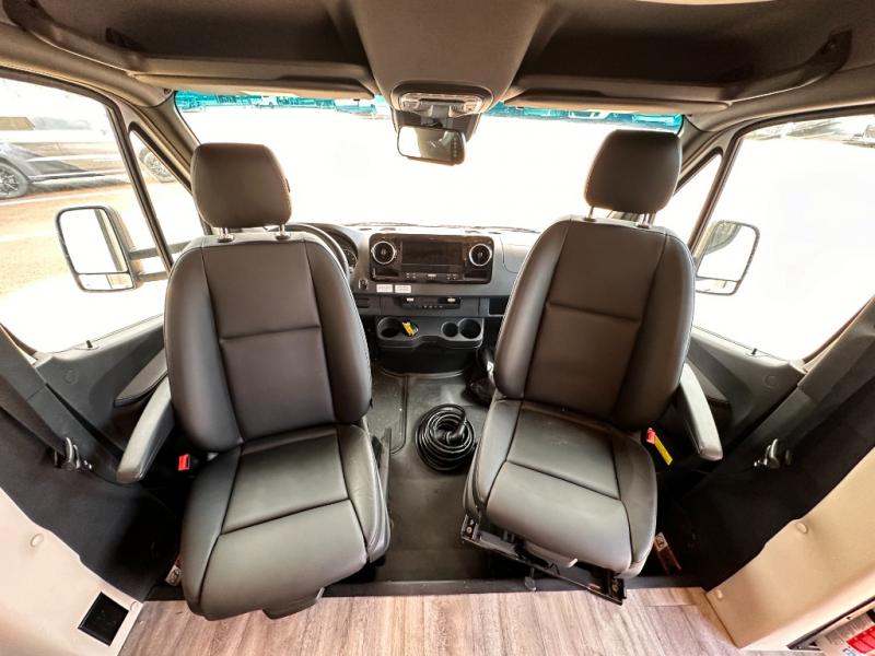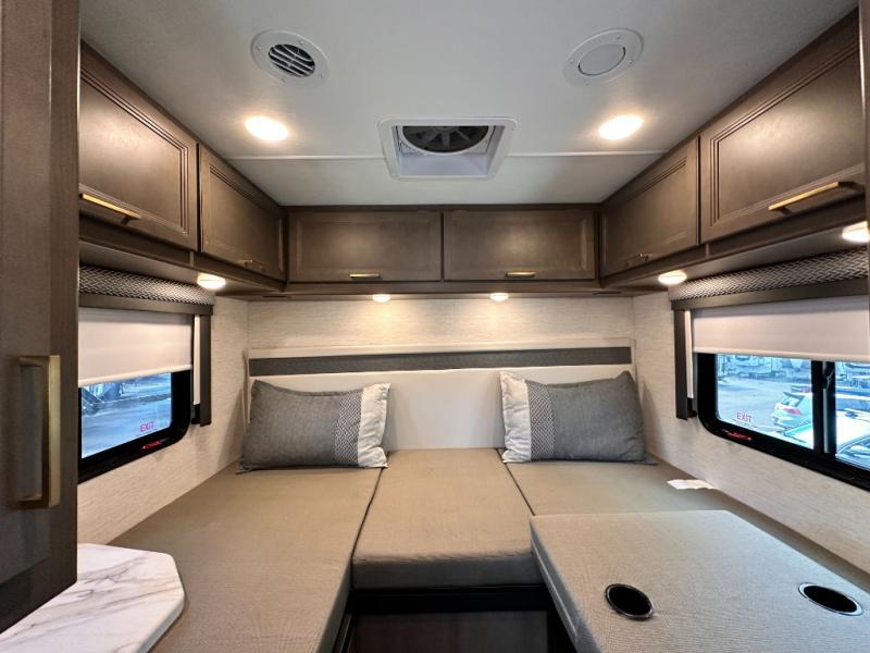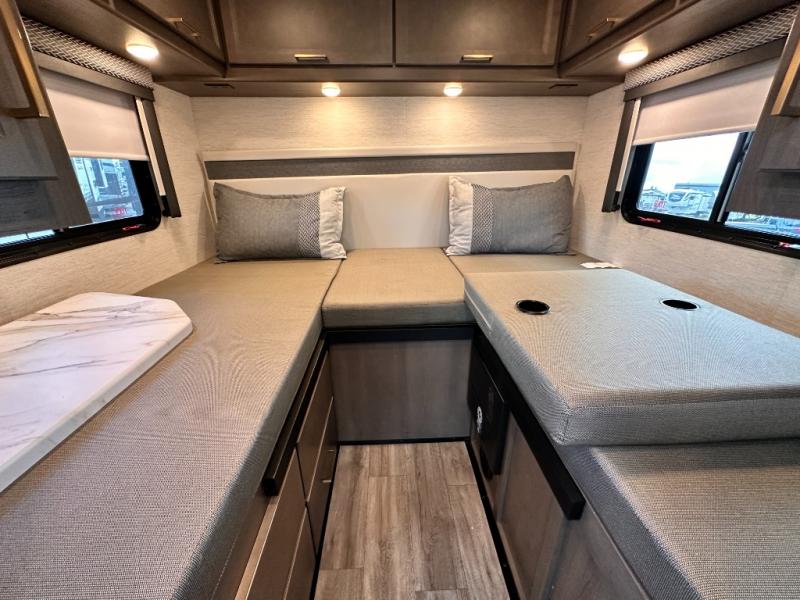 With any Four Winds Sprinter Class C diesel motorhome by Thor Motor Coach, you will have everything you need for unforgettable trips on the road! Each model is constructed with a durable one-piece fiberglass front cap plus a one-piece upper rear cap, a welded tubular aluminum roof and sidewall cage, plus a slick fiberglass exterior with standard graphics package. You can put your own style on your coach by choosing one of the optional partial paint choices, plus there two modern interior decor choices to choose from. The Mercedes-Benz sprinter chassis provides a strong foundation for each model, and the 2.0L l-4 211HP engine will power your adventures both near and far. There is even a 5,000 lb. trailer hitch if you need to tow a jet ski or fishing boat. A 100-watt solar charging system comes standard, along with a 4.0 kw LP generator, a tankless water heater, plus many more utilities to make each trip hassle-free. Step inside to find residential vinyl flooring, decorative glass inserts in the kitchen overhead cabinets, Leatherette furniture, and pressed laminate countertops to name a few comforts!