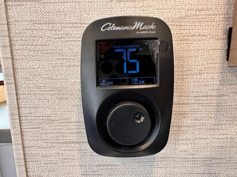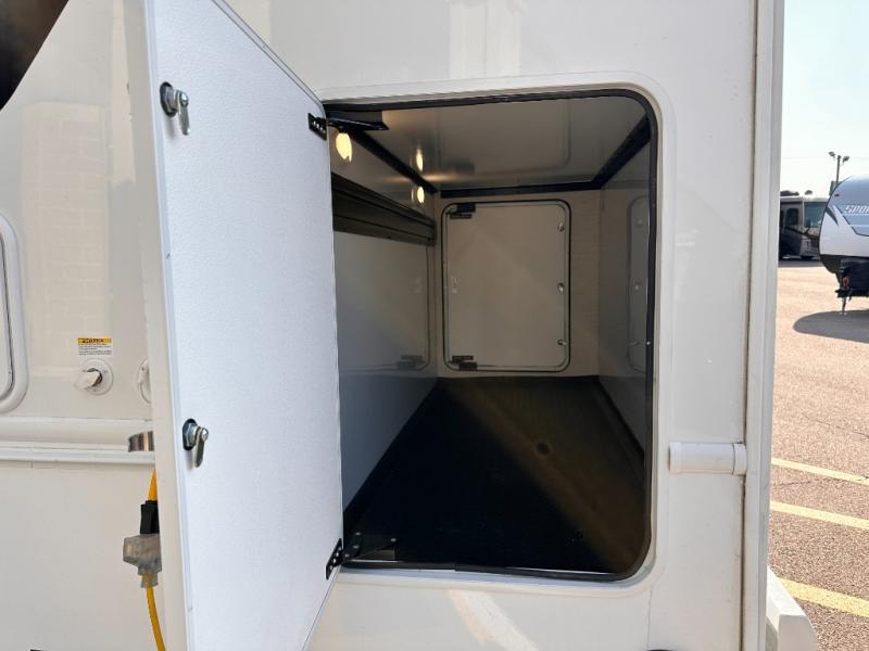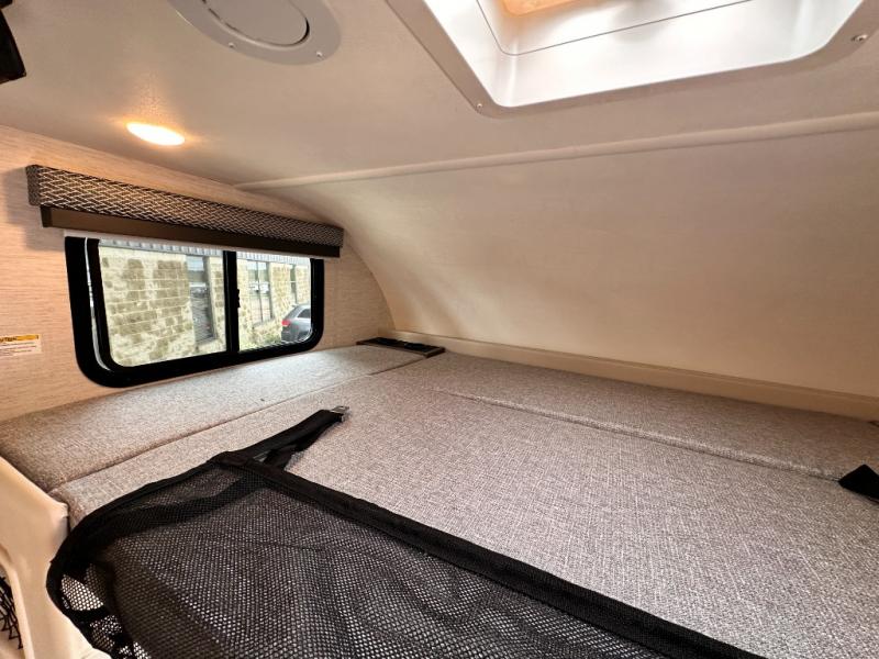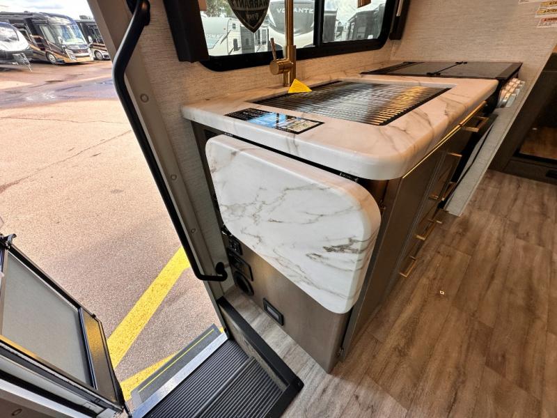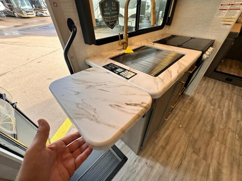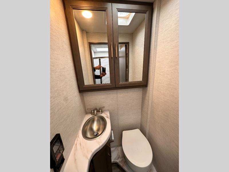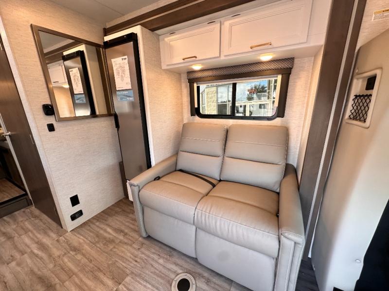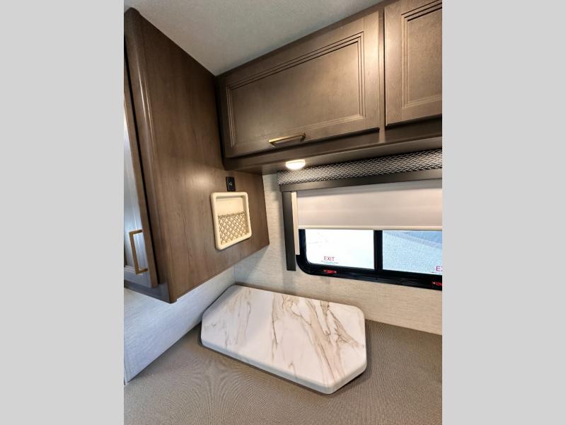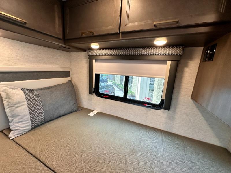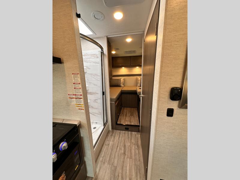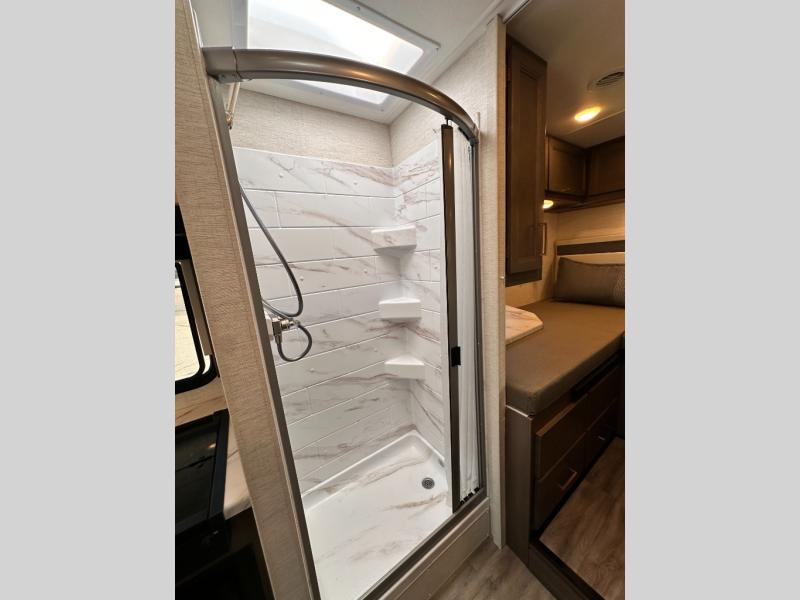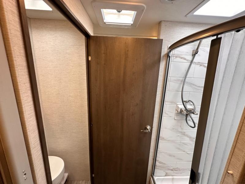 Travel comfortably in this Class C motorhome featuring a versatile sleeping space. In the rear of the coach, you might enjoy two twin beds to travel with a friend, or convert the twin beds to a king when you travel with your spouse. Plus, you will have a 52" x 87" cab-over bunk that sleeps two adults or children as well. All will enjoy the full bath amenities that offer the entire width of the unit for showering and getting dressed, and you can easily close off the toilet and vanity area for additional privacy during the day to allow access into the bedroom. There is also a skylight over the shower which adds additional headroom and natural lighting. A full kitchen including a three burner cooktop and convection microwave oven with an air fryer will let you make meals each day, and the 12V refrigerator will keep perishables fresh!