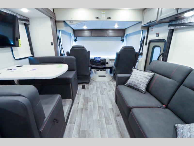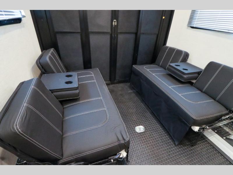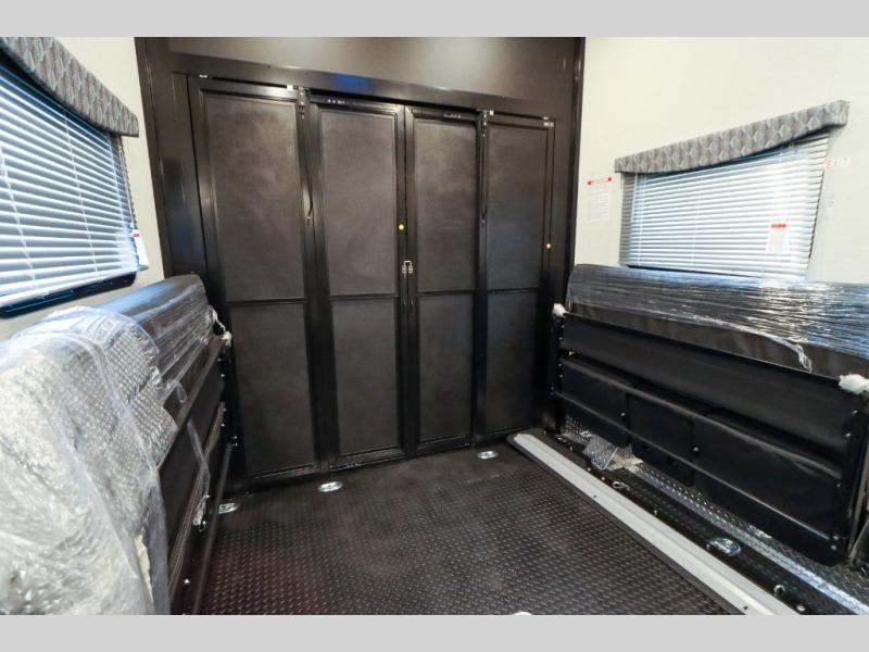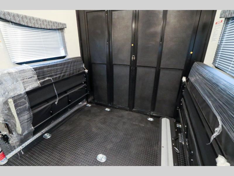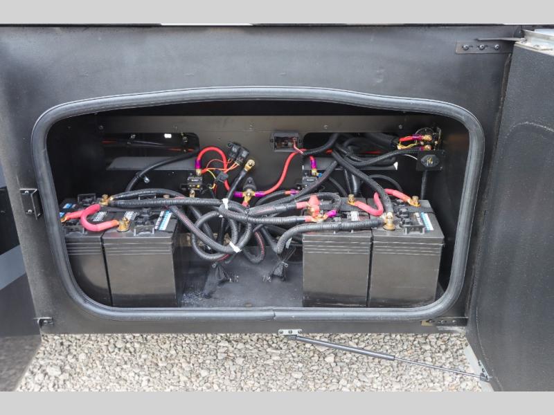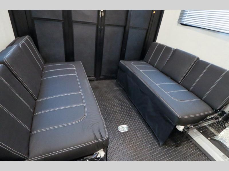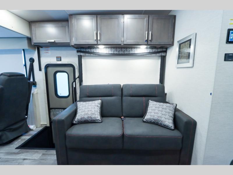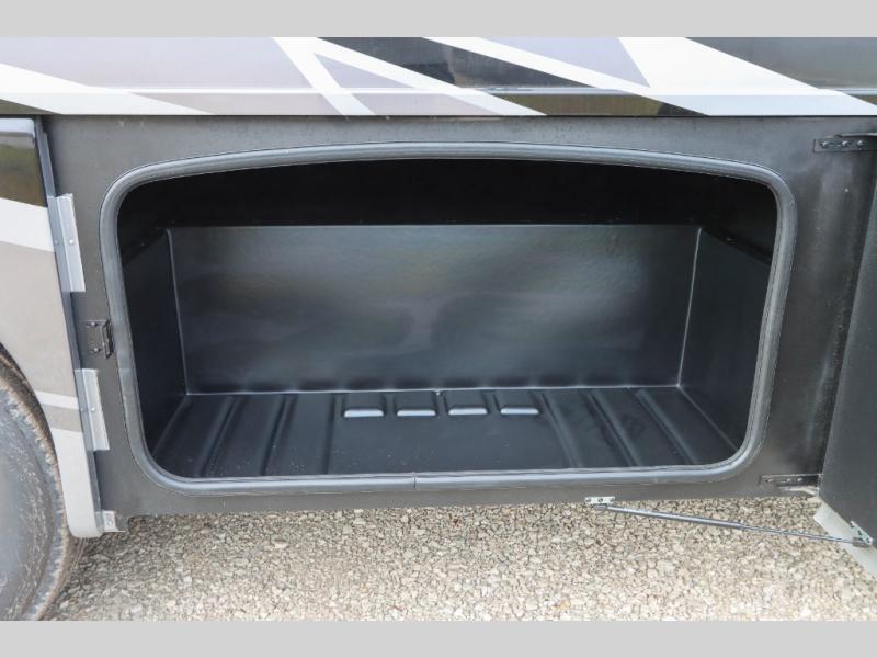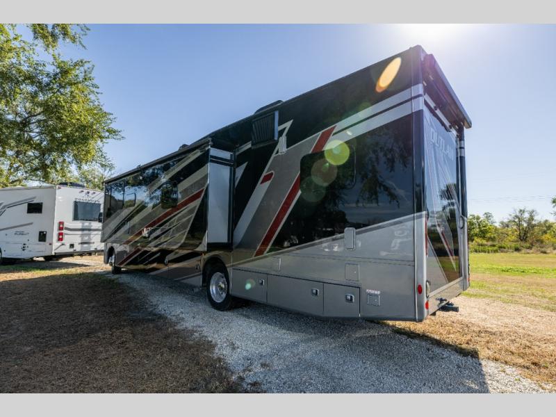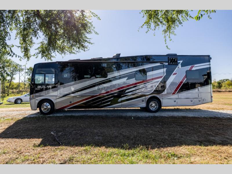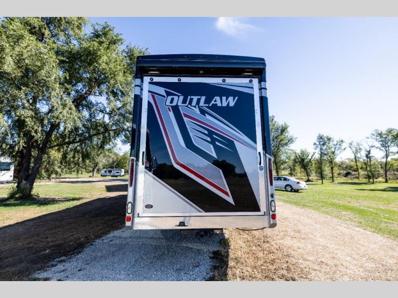 With any Outlaw Class A gas motorhome toy hauler you will appreciate the remote fuel filling station with an auxiliary fuel tank, pump and a nozzle that will allow you to keep your toys ready for adventure, and there is a Pet-Link multi-purpose tie-down if you've brought your furry friends along. Each model is constructed with Vacu-Bond laminated roof, walls and floor with block foam insulation, a full-body paint package with gel coated sidewalls, and a premium one-piece domed roof membrane for durability. The interior will have you feeling at home with leatherette furniture, solid surface kitchen countertops, satin finish cabinetry, plus a glass shower door for added luxury. All of your power needs will be met with an Onan RV QG 5500 gas generator, four auxiliary house batteries, plus a 100-watt solar charging system with a power controller. Choose an Outlaw Class A gas toy hauler coach and you'll never look back!
