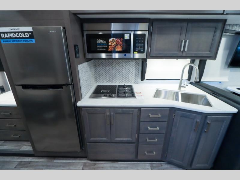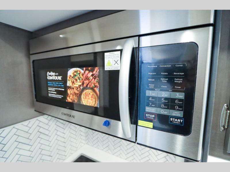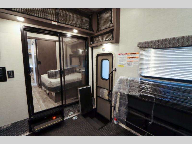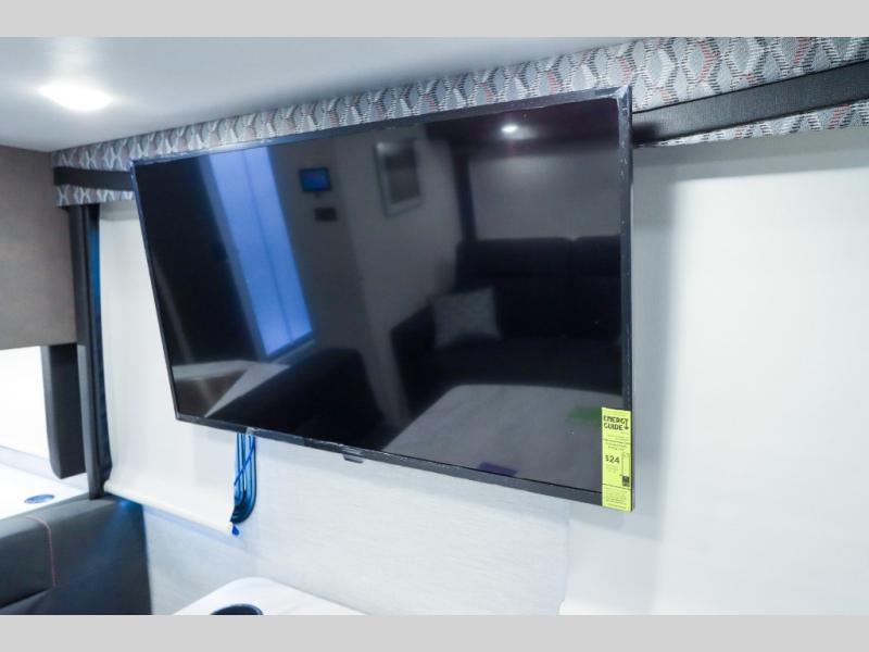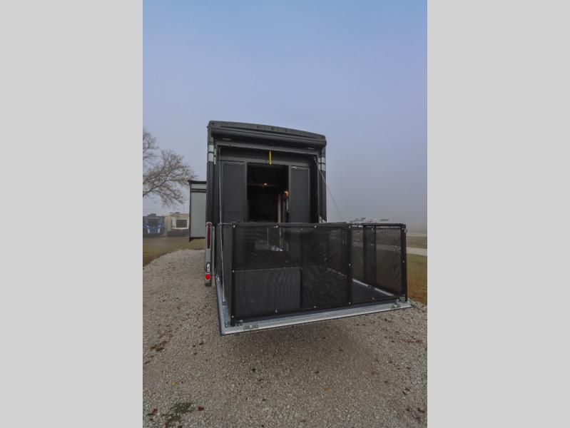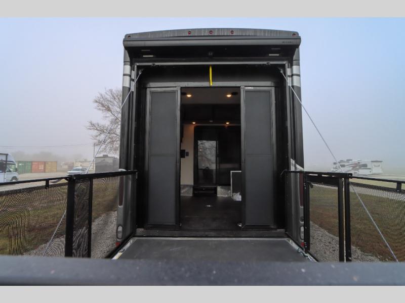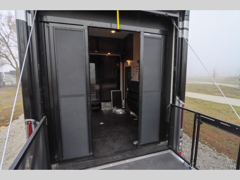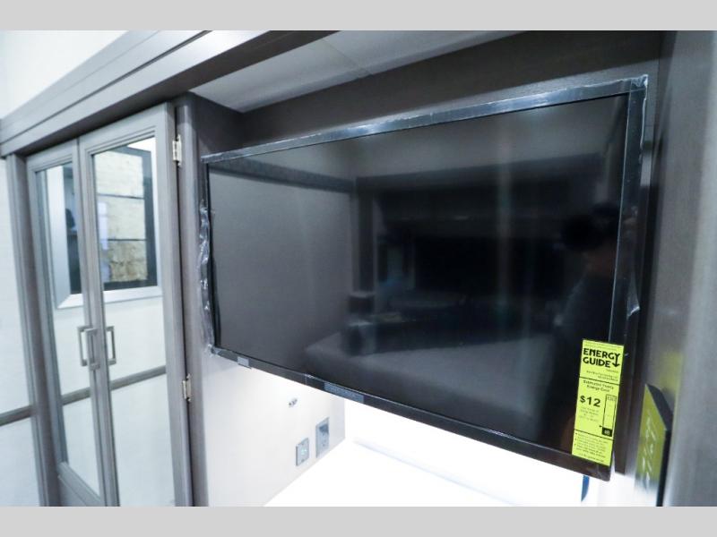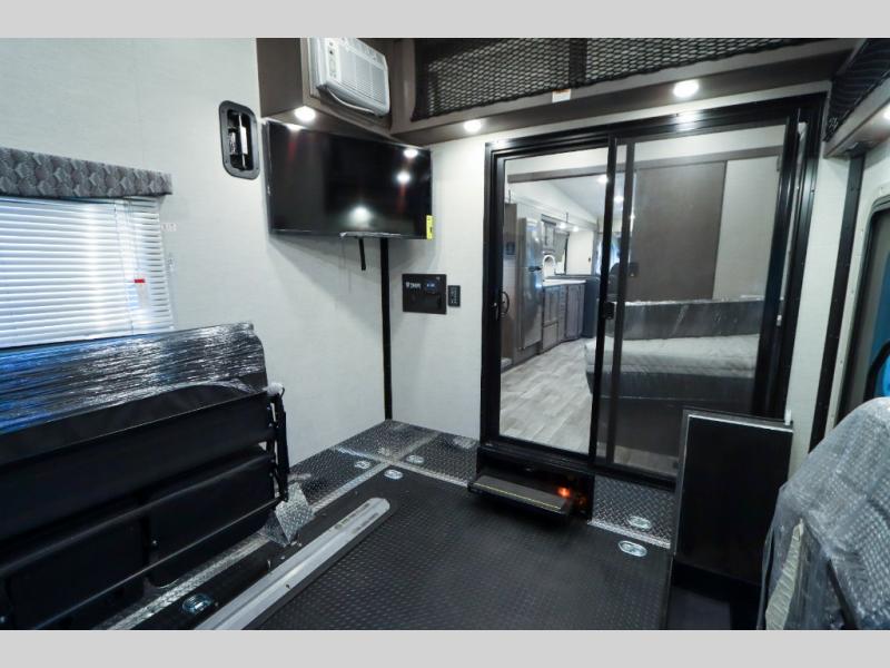 Load up the side-by-side and invite your friends along for the trip in this spacious toy hauler coach. During the day you can set up the patio deck that includes three seasons patio doors with a screen and privacy panels. You'll find the main living area cozy with its Dream dinette and sofa bed, plus there is a 39" LED Smart TV here. The chef can prepare dinner on the two burner gas cooktop, or use the stainless steel convection microwave, and check out the residential refrigerator for all your perishables. The queen bed slide out in the private bedroom will provide a great night's rest, and you'll enjoy your own 32" LED Smart TV and a wardrobe for your clothes. This model also includes a 40" LED exterior TV; that makes four TV's for all your entertainment needs!