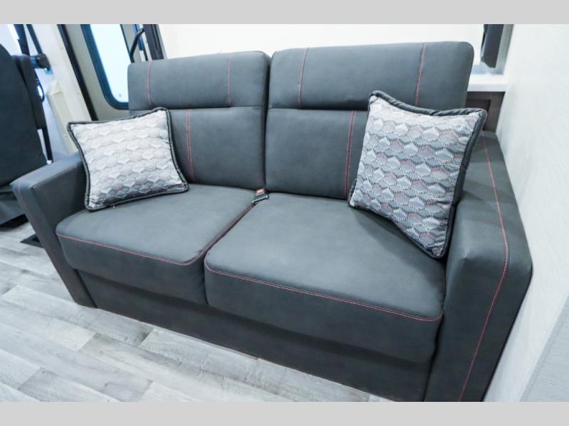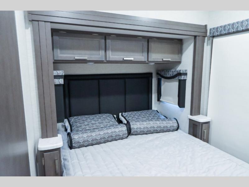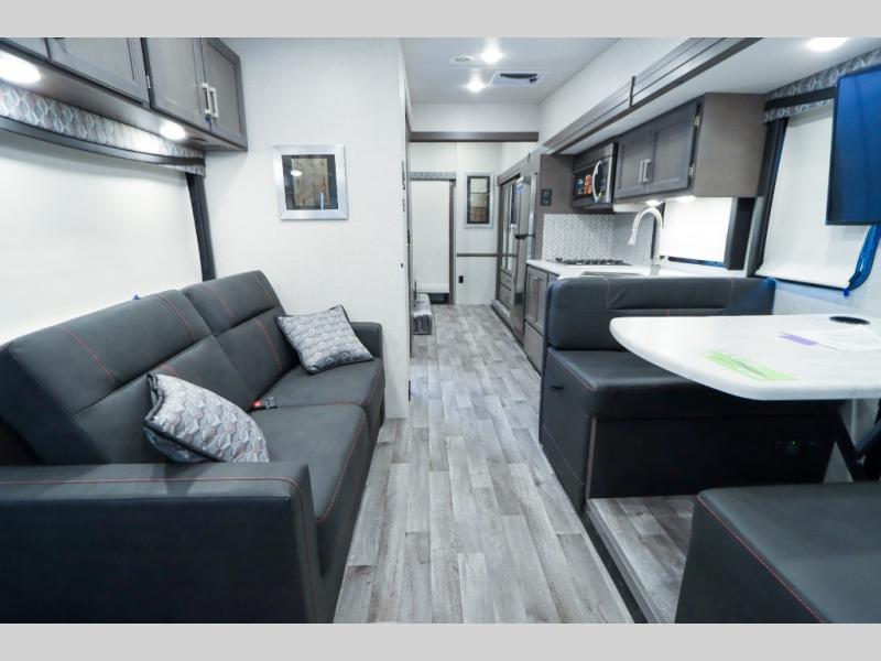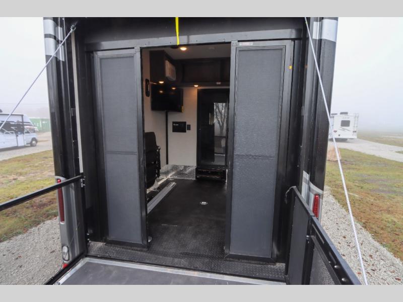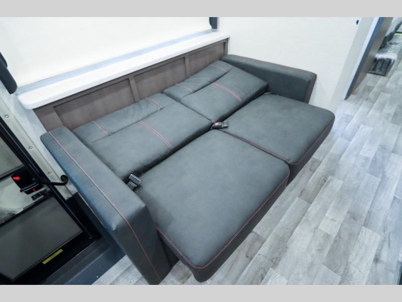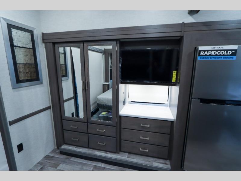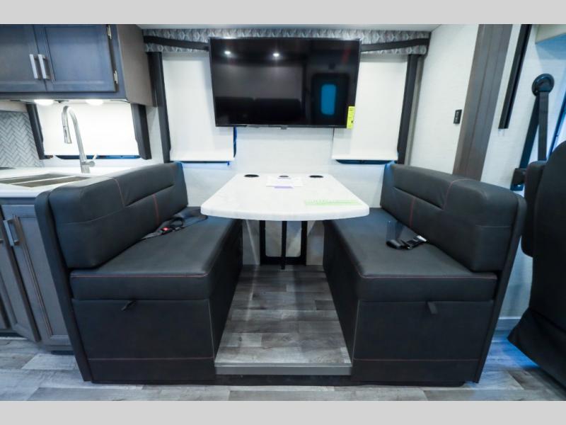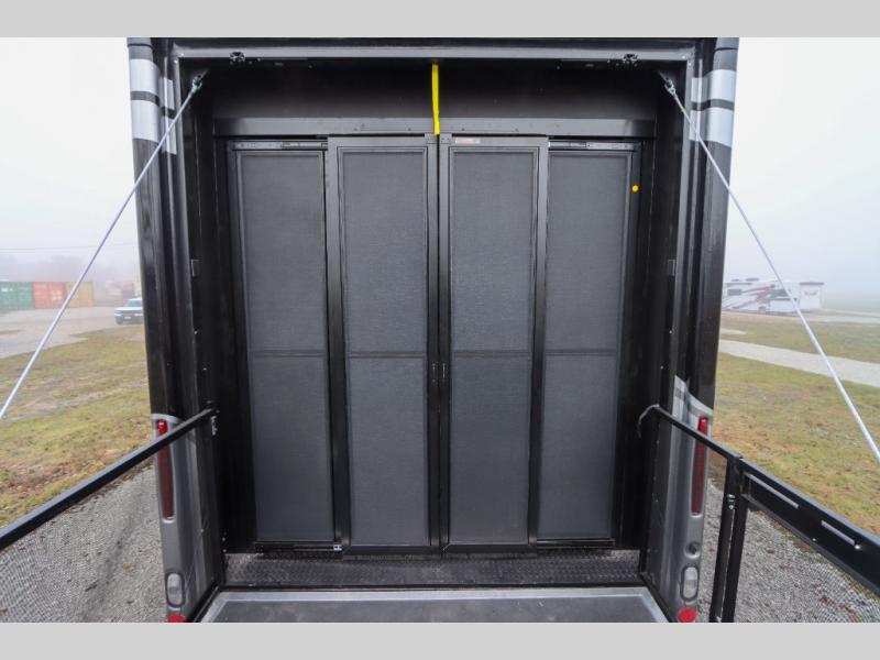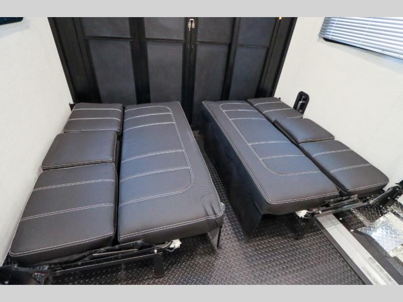 Load up the side-by-side and invite your friends along for the trip in this spacious toy hauler coach. During the day you can set up the patio deck that includes three seasons patio doors with a screen and privacy panels. You'll find the main living area cozy with its Dream dinette and sofa bed, plus there is a 39" LED Smart TV here. The chef can prepare dinner on the two burner gas cooktop, or use the stainless steel convection microwave, and check out the residential refrigerator for all your perishables. The queen bed slide out in the private bedroom will provide a great night's rest, and you'll enjoy your own 32" LED Smart TV and a wardrobe for your clothes. This model also includes a 40" LED exterior TV; that makes four TV's for all your entertainment needs!