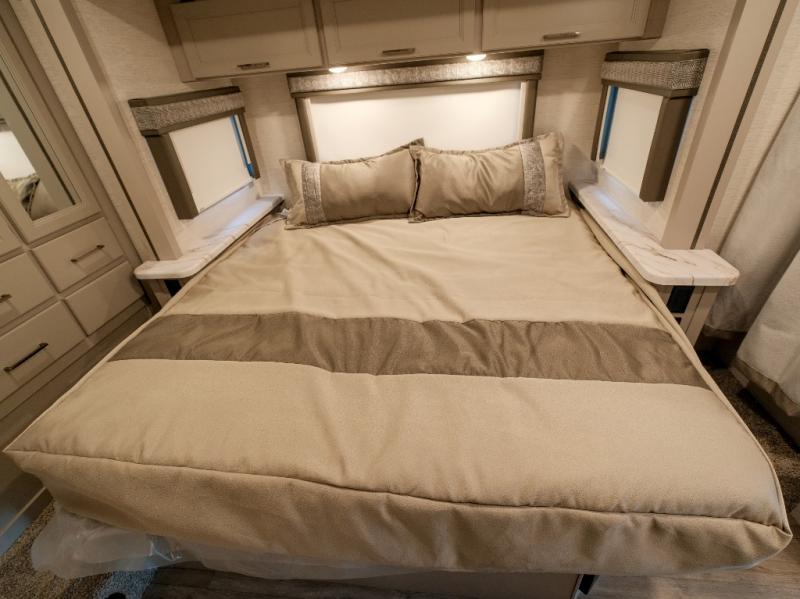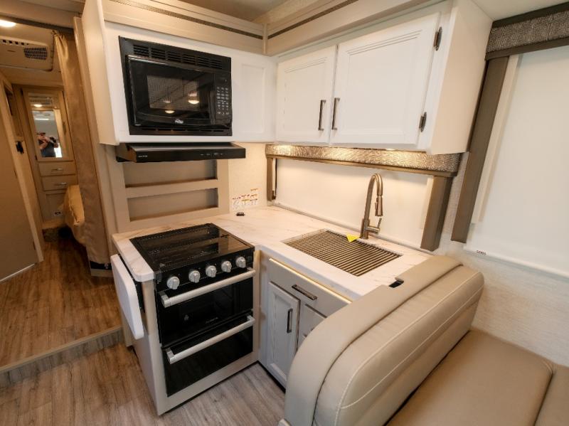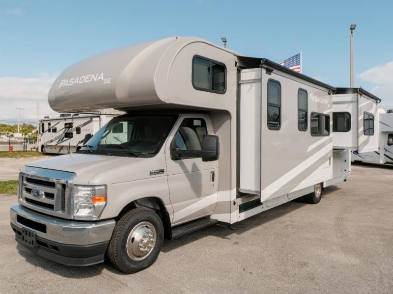 With any Pasadena SE Class C gas motorhome by Thor Motor Coach, you will find convenient amenities, a modern interior, and a reliable Ford E-Series chassis, with an optional Chevy chassis on select models to power your adventures. There is a one-piece fiberglass front cap, and premium one-piece roofing for added strength. Residential vinyl flooring will be easy to keep clean, and you'll love the LED lighting, pressed laminate countertops throughout, and full-extensions ball-bearing drawer guides. These motorhomes also include a 4.0 kW gas generator and a 30-amp shoreline power cord to keep you going, along with a tankless water heater to ensure your comfort!