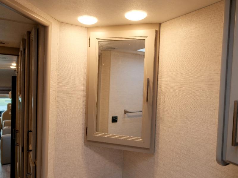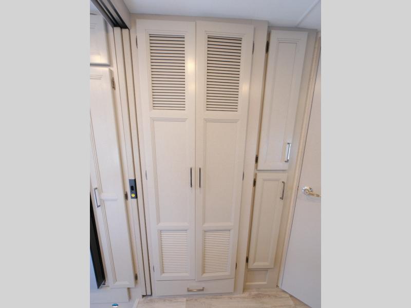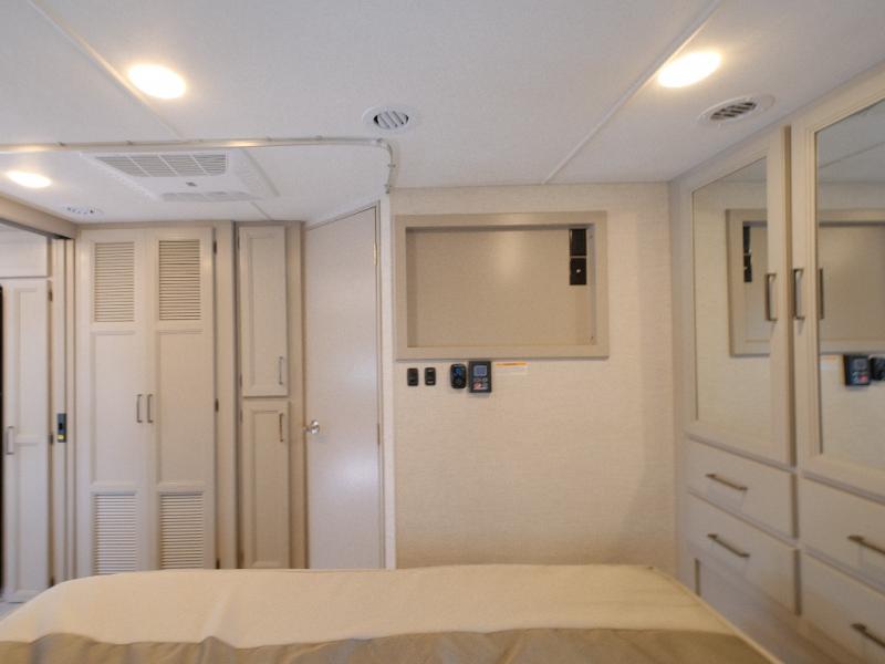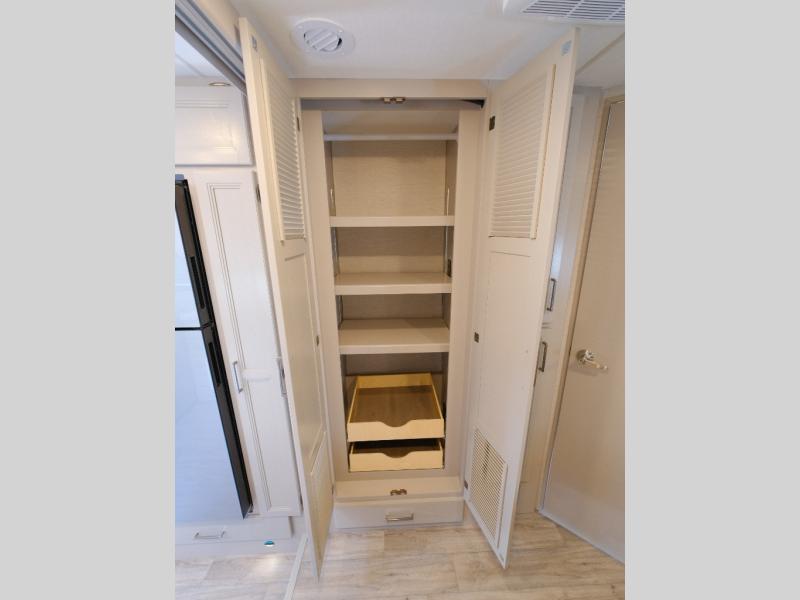 Pack your bags and head across the country in this double slide out coach. The Dream dinette and theater seating provide a place to dine, relax, and even let extra guests sleep over who don't claim the cab-over bunk. A three burner gas cooktop and microwave oven will let you create meals each day, and a 12V refrigerator will keep your drinks cold! The rear of this coach is shared with the full bath and semi-private bedroom with a privacy curtain. You're sure to get a great night's rest on the king bed, and there is a large bedroom closet to keep your clothes wrinkle-free. There is also a second closet with washer and dryer prep if you choose to add these appliances.