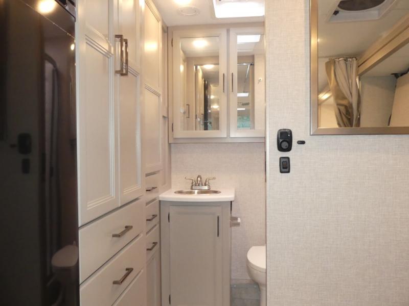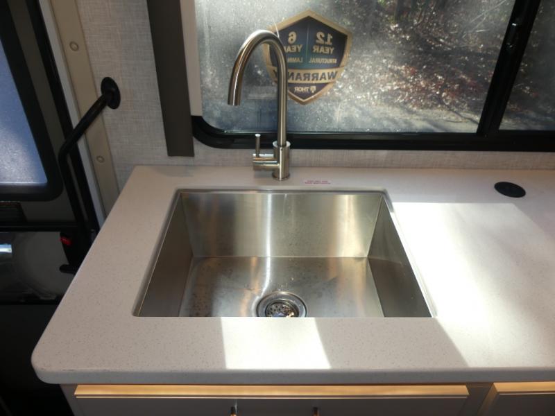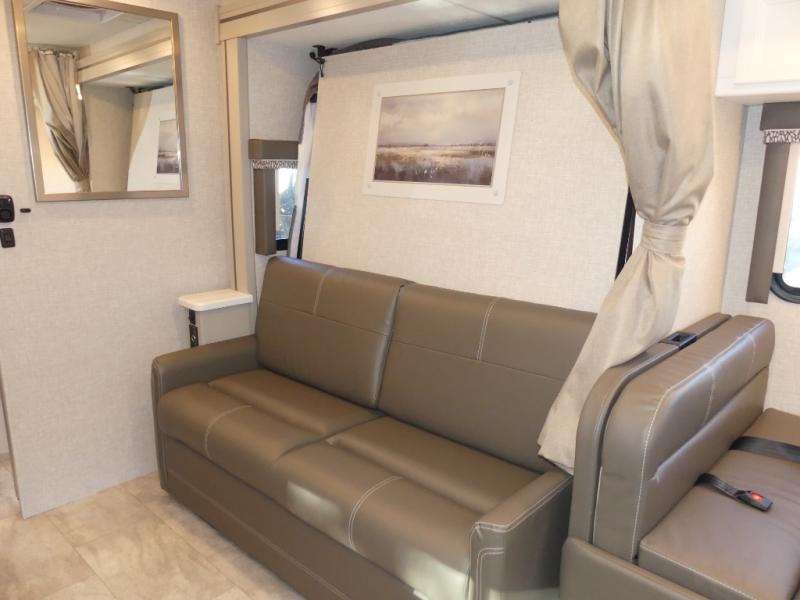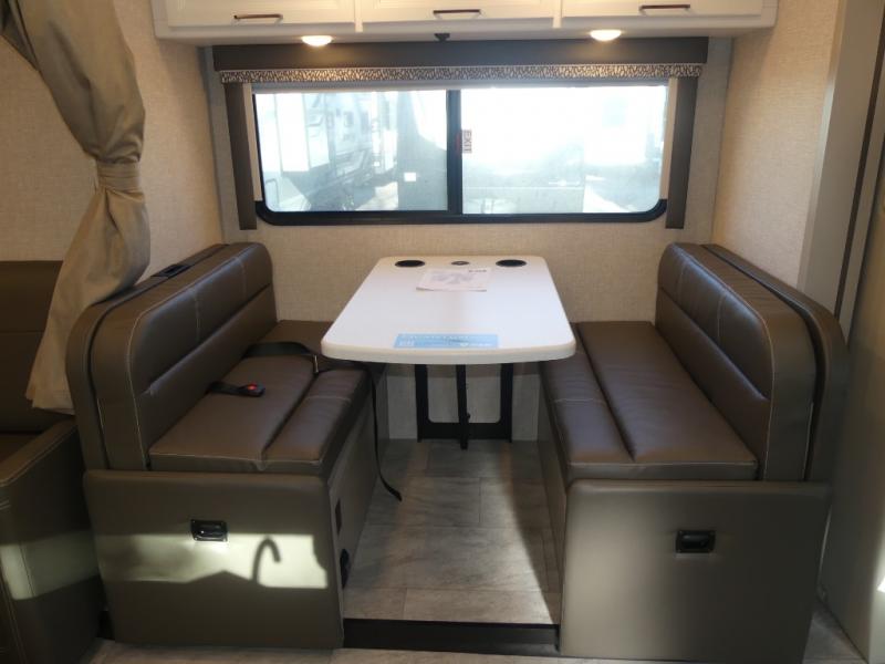 With any Quantum Sprinter Class C diesel motorhome by Thor Motor Coach, you will enjoy each ride thanks to the durable Mercedes-Benz Sprinter chassis with a 2.0L l-4 engine, 211HP and 332 lb.-ft. torque. You are sure to appreciate the added Mercedes-Benz safety package, along with a 5,000 lb. hitch, and an electric stabilizer jack system for easy setup. Your gear can be stowed away in the lighted rotocast storage compartments, and the power awning with integrated LED lights will create an inviting outdoor living space everyone will enjoy. Each model includes a Winegard ConnecT 2.0 WiFi/4G/TV antenna so you can stay connected while you travel, and the Smart TV will help wash away those rainy day blues. Head inside to find residential vinyl flooring that is easy to keep clean, pressed laminate countertops, leatherette furniture, and premium window privacy roller shades. A tankless water heater is a feature you won't want to camp without, and the LP generator will keep you powered up!