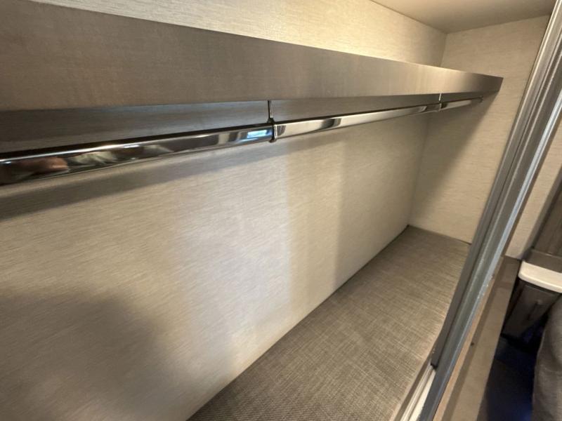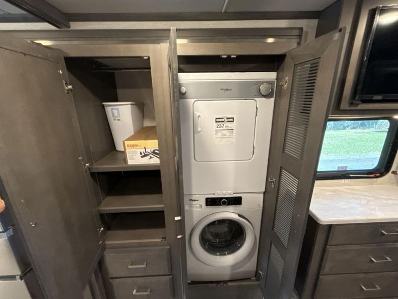 Dream of the places you'll go and sights you'll see in this spacious coach for six! There is a full-wall slide, plus two additional slides for maximum space and comfort. The little ones or your guests will love sleeping on the drop-down overhead bunk, while you take the king bed slide out in the rear private bedroom. There is also a large bedroom closet, a dresser, and your own 32" LED Smart TV here to watch a late-night show in bed. You will love to relax in the main living area on the reclining theater seating across from the 50" LED Smart TV, or you can all play a game at the 92" Dream Dinette slide. When everyone gets hungry, the chef of your group can whip up a hearty meals with the two burner electric induction cooktop or use the stainless steel over-the-range convection microwave, and there is a 15.7 cu. ft. French door residential refrigerator here for perishables!