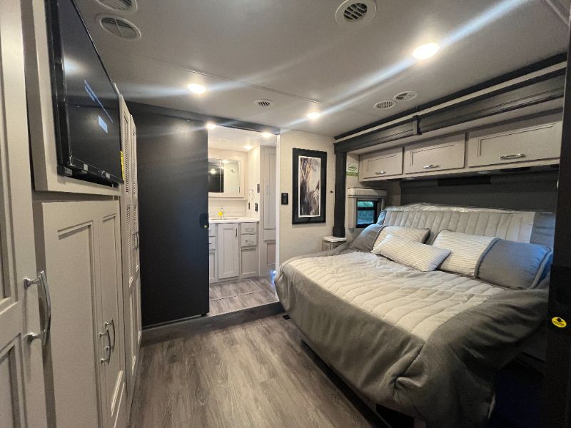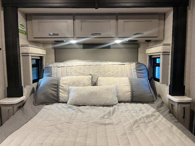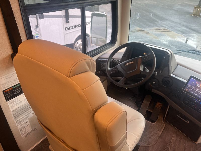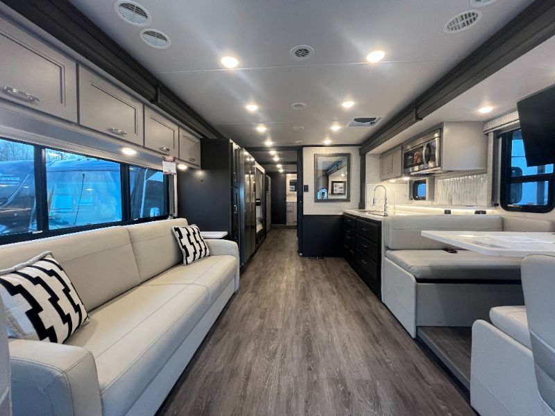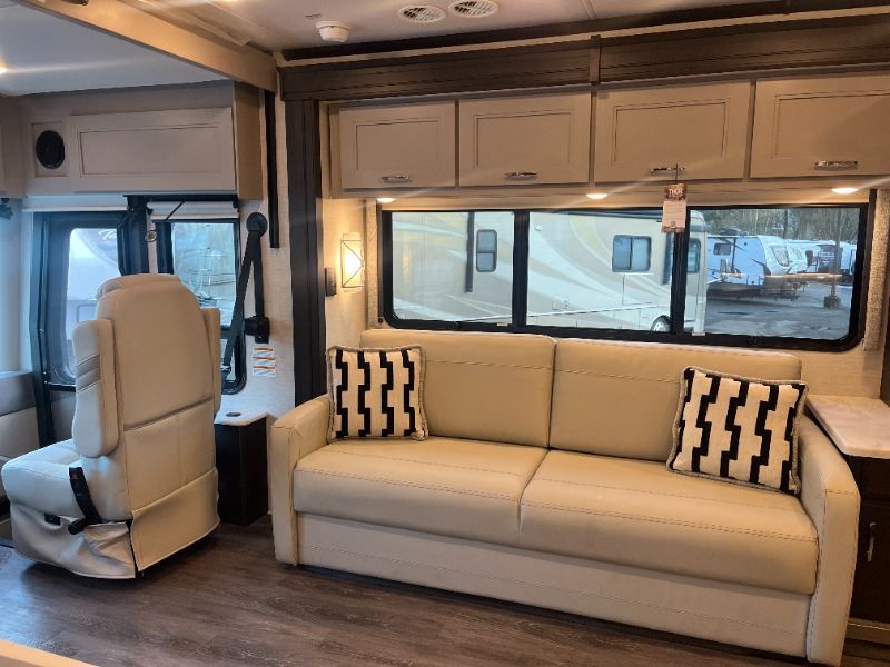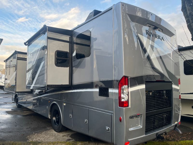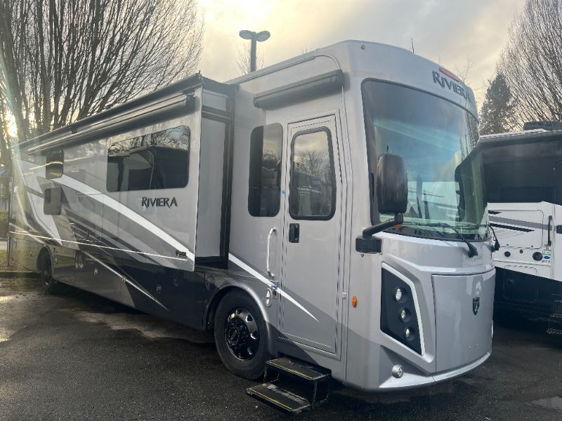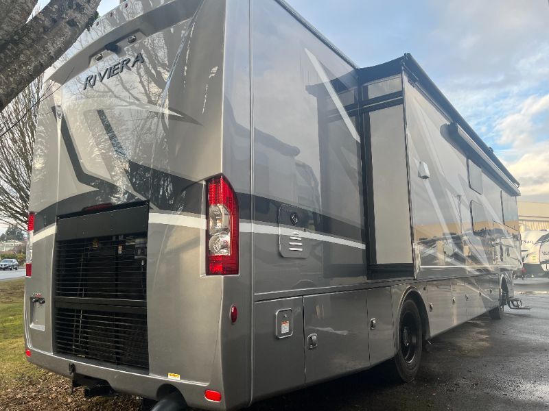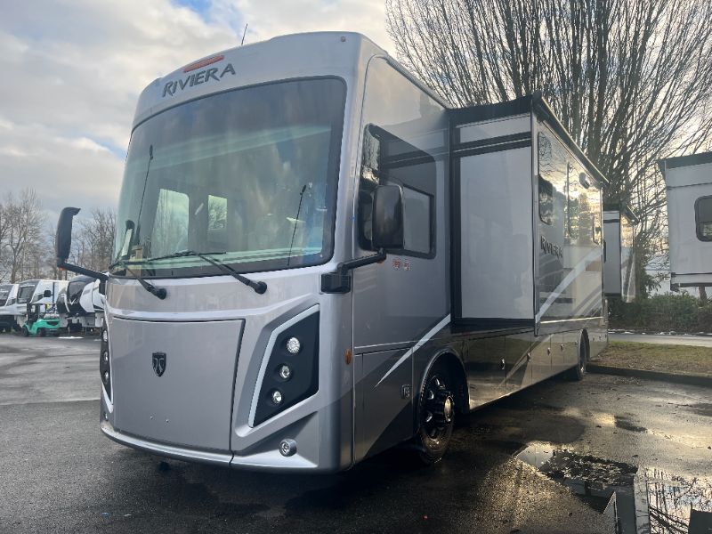With any Riviera Class A diesel motorhome by Thor Motor Coach, you will enjoy a luxury home on wheels wherever you decide to roam! You will appreciate a capable Freightliner CS-S straight rail chassis with an Atlas foundation and better fuel mileage with the Cummins ISB-XT 6.7L diesel engine. There is a spacious basement pass-through storage for your camp gear, a powered patio awning with LED lighting, and an exterior 40" LED TV for outdoor movie nights. You will be able to enjoy your coach for years to come thanks to the durable construction materials that include a welded tubular steel floor, Vacu-Bond laminated roof, walls, and floor, plus a one-piece domed roof membrane. The elegant interior is designed with luxury vinyl tile flooring, "Studio Collection" cabinetry, solid surface countertops, and designer backsplash in the kitchen. Some of the amenities you'll appreciate on each model include the RapidCamp+ multiplex wiring control system, a tankless water heater, and an Onan RV QD 6000 diesel generator. Enjoy your RV life with a Riviera Class A diesel coach!