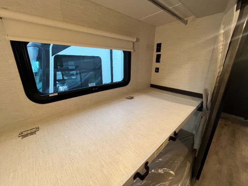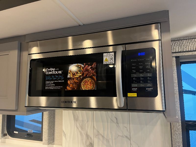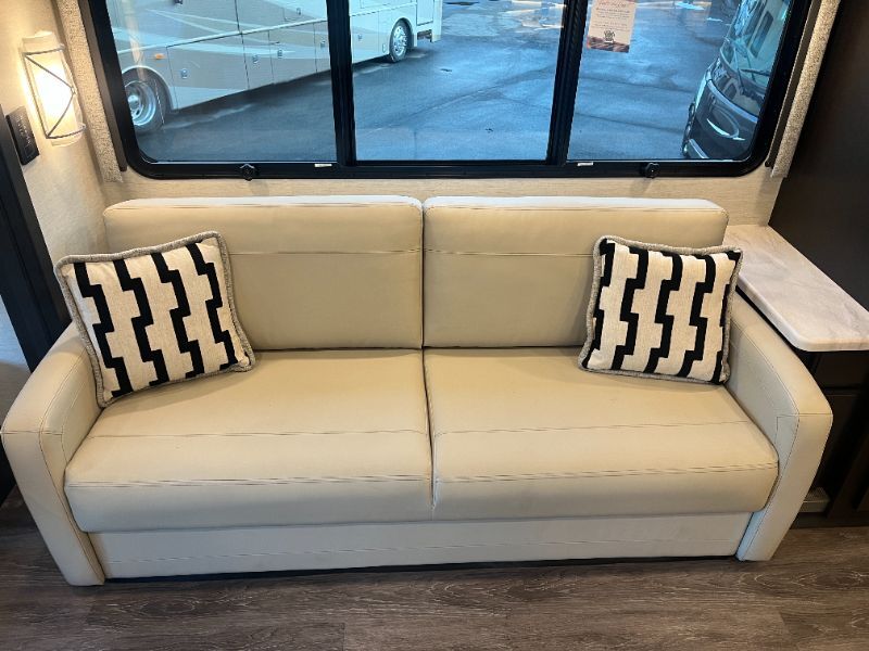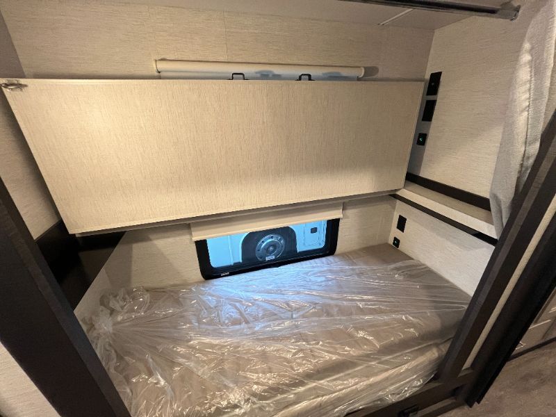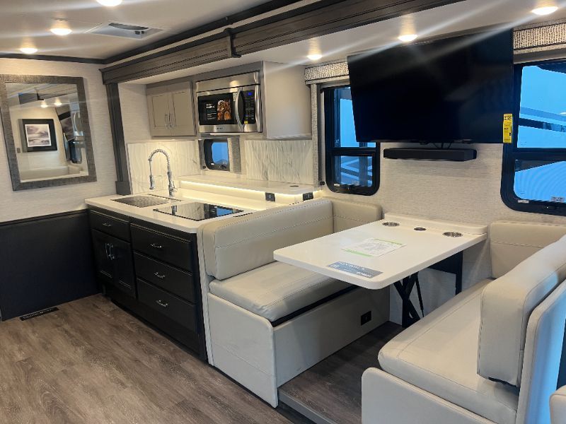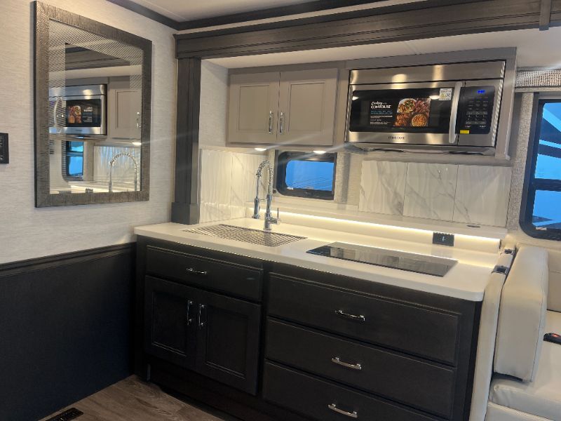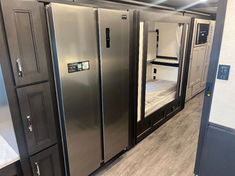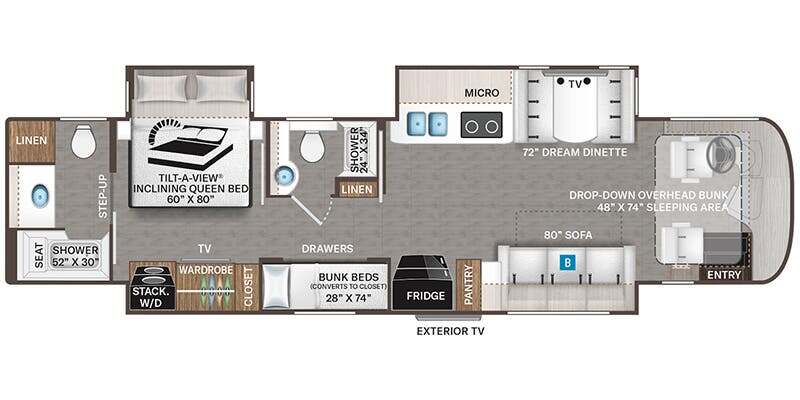 This coach can fit your whole crew thanks to the added bunk beds within the full-wall slide! There is also a drop-down overhead bunk, a Tilt-A-View inclining queen bed, a 72" Dream Dinette, and an 80" sofa for even more sleeping space! A full rear bath on board will let you clean up each morning, and there is a second full bath across from the bunks for your guests; how convenient! Head to the kitchen to prepare breakfast on the two burner electric induction cooktop or in the stainless steel over-the-range convection microwave, and there is a 19 cu. ft. side-by-side residential refrigerator where the milk and eggs can go back in. After a day outdoors relaxing under the 20' power awning and watching the game on the exterior 40" LED TV, you can head indoors to play a game at the Dream Dinette or get cozy with a book on the sofa!
