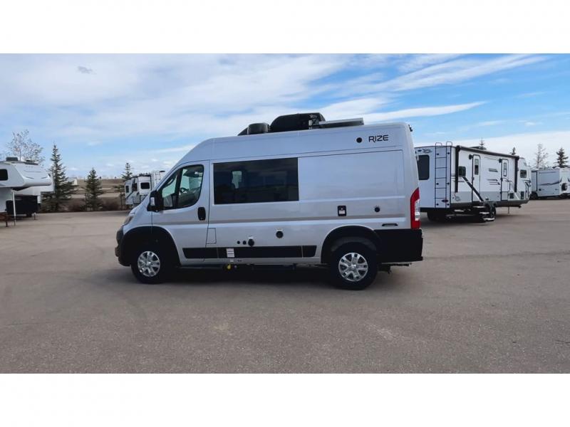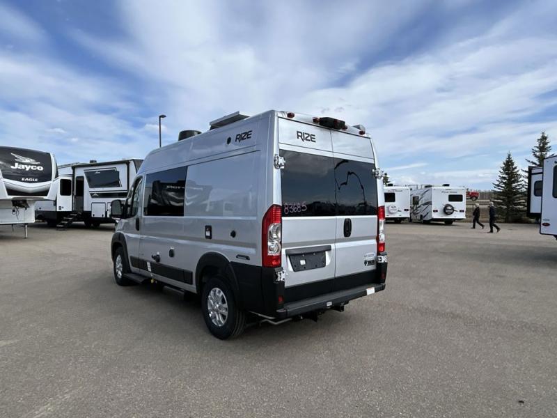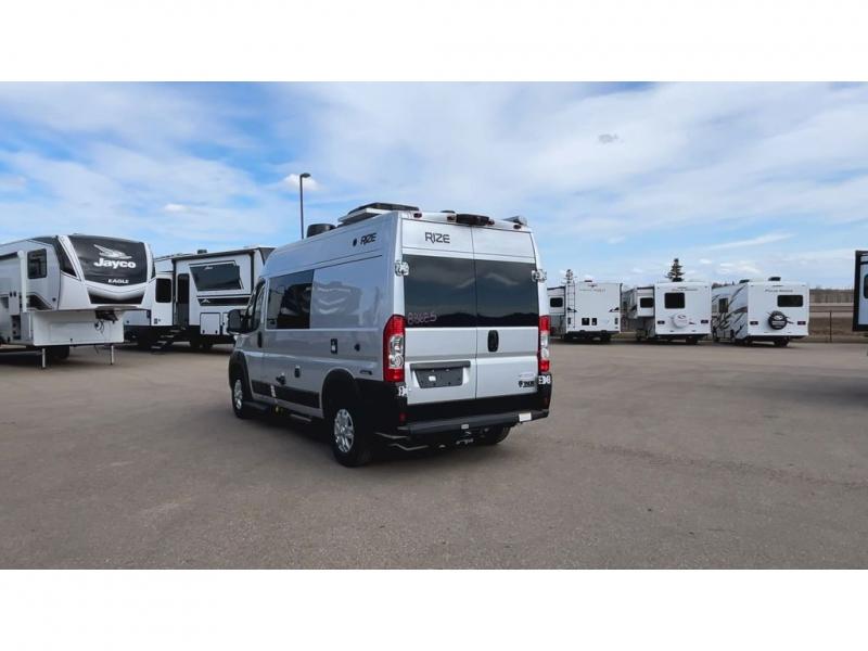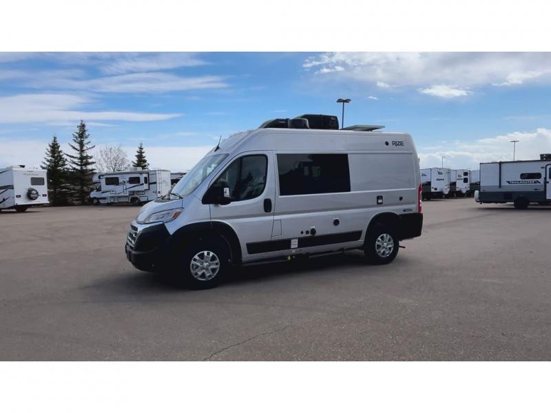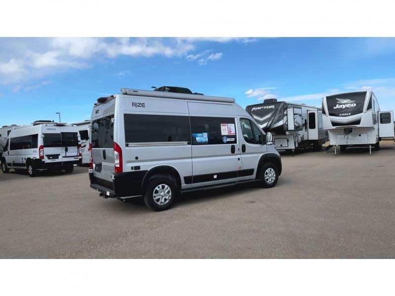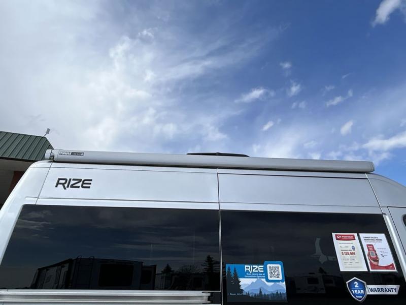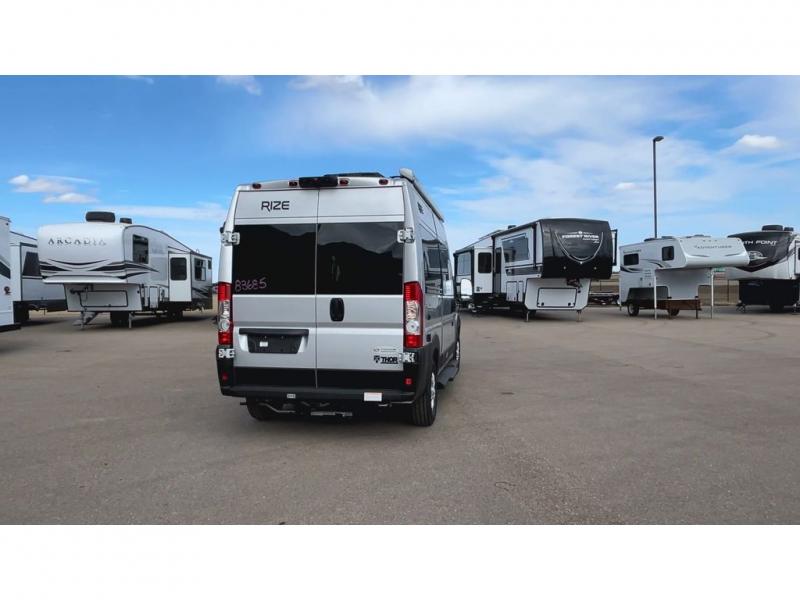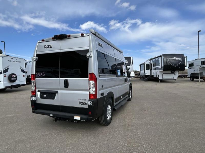 The Rize Class B gas motorhome by Thor Motor Coach allows you to experience the camping lifestyle in a compact RV packed with convenient features. There is a 3.6L Pentastar V6 engine and 276 HP to power your excursions, and the outdoor enthusiast will love the 200W solar panel and solar charge controller. Each model includes residential vinyl flooring, TechnoForm Euro-style upper cabinet doors, and premium window privacy shades. You'll find pressed countertops in the kitchen and a glass protective cover and task lighting above the cooktop to easily cook meals each day. The keyless entry system adds to the convenience found throughout these models, plus there is an exterior LP connection if you want to hook up your own grill and a rear water sprayer to wash off your hiking boots.