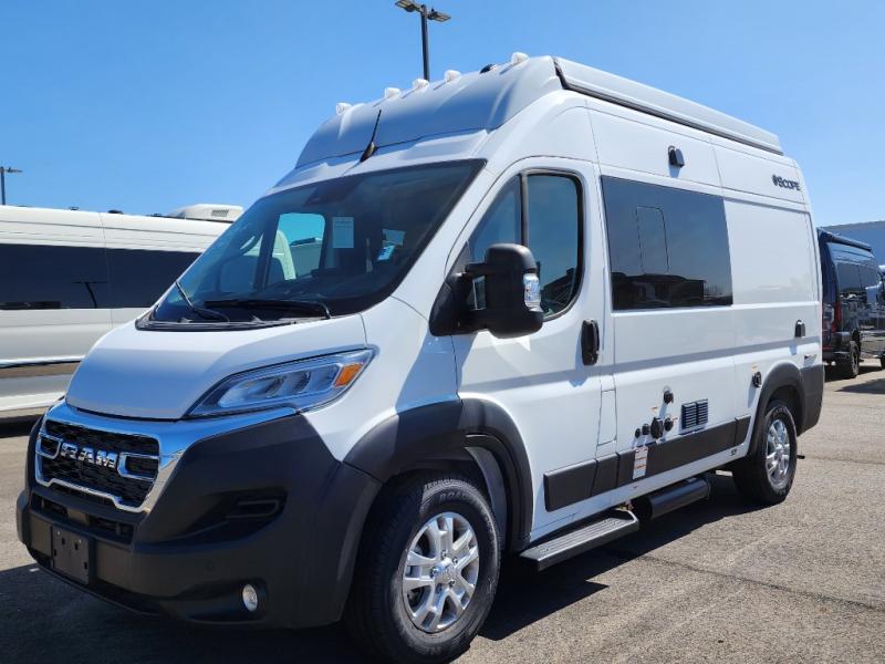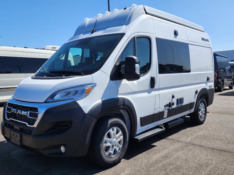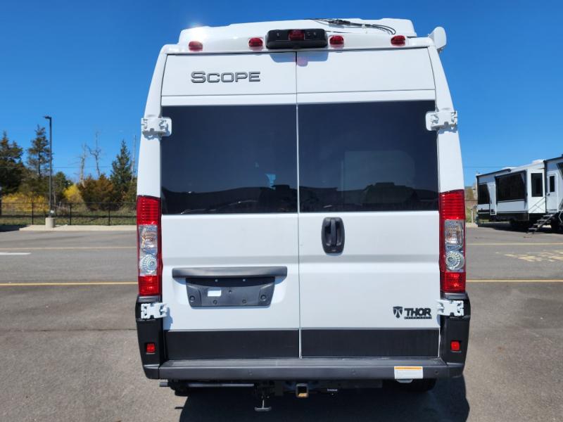 Thor Motor Coach Scope Class B gas motorhomes are designed for outdoor enthusiasts who seek comfort. Built on a RAM Promaster 1500 XT chassis with front-wheel drive, these motorhomes include a 3,500 lb. trailer hitch with a 4-pin connector for additional hauling. Side steps provide easy entry and exit, and the entryway screen door is a convenient feature. The single-door 12V electric refrigerator is powered by the coach batteries, charged by the quiet Onan® RV QG 2800 gas generator. Enjoy residential vinyl flooring, premium window privacy roller shades, pressed countertops in the kitchen, and Euro-style upper cabinet doors for added comfort.