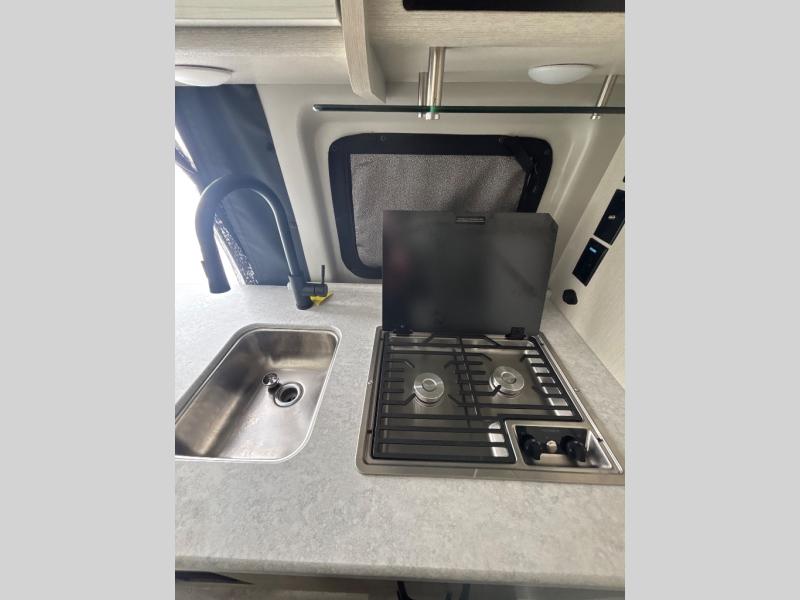 Functional Kitchenette: Efficient cooktop, refrigerator, and sink make meals on the road simple