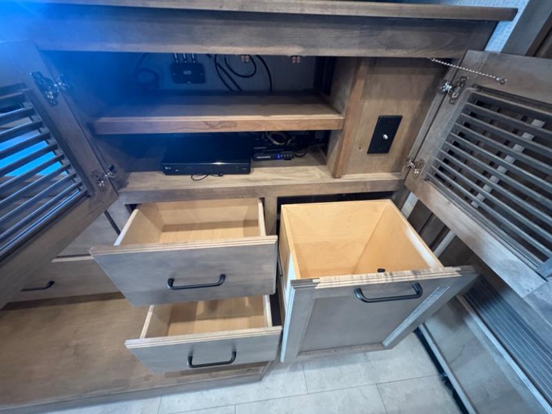 Outdoor Living Features including a power awning, exterior LED TV, and spacious pass-through storage compartments for all your travel gear.
