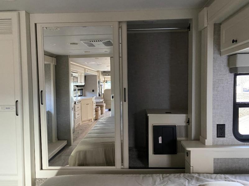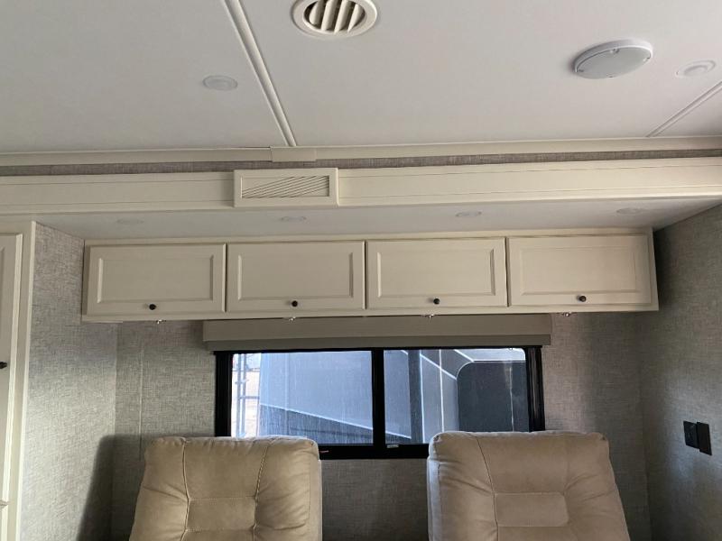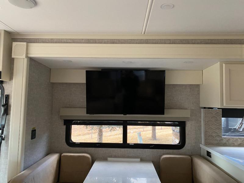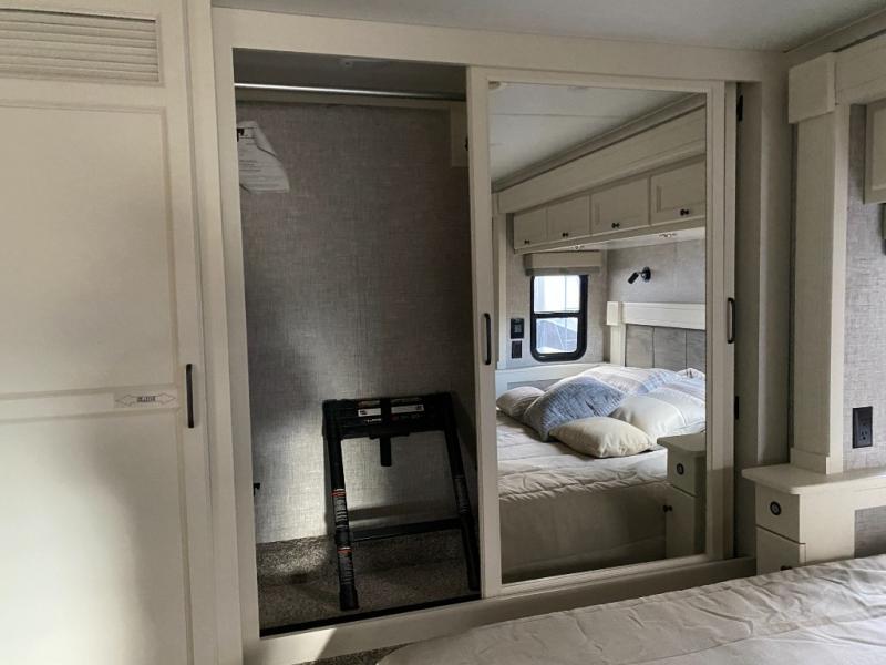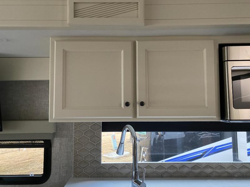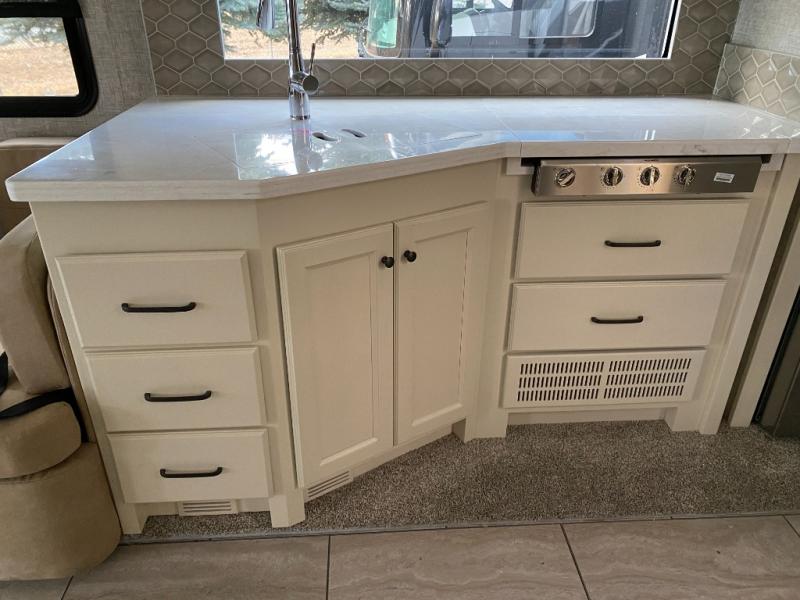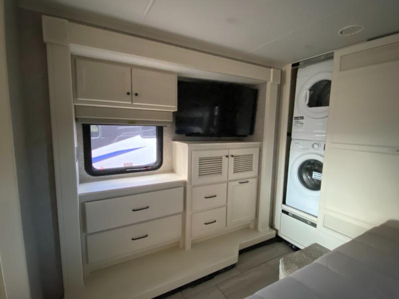 If you've been in the market for a coach with added interior space and at-home comforts, look no further than this Byway! The super sofa and booth dinette sleeper will provide cozy seating space plus additional sleeping spaces for your guests. If you need even more, just choose the optional drop-down front bunk! The kitchen includes everything you need to prepare meals each day, including a 1.5 cu. ft. Smart convection microwave, task lighting, and a 18 cu. ft. residential refrigerator with a bottom freezer. The mid coach full bath lets you stay clean throughout each trip, and the rear private bedroom will be your own oasis at night. Here, you'll find a king bed slide out with nightstands on either side, a mounted TV, a spacious wardrobe, plus stacked washer/dryer prep if you want the option for easy wash days!